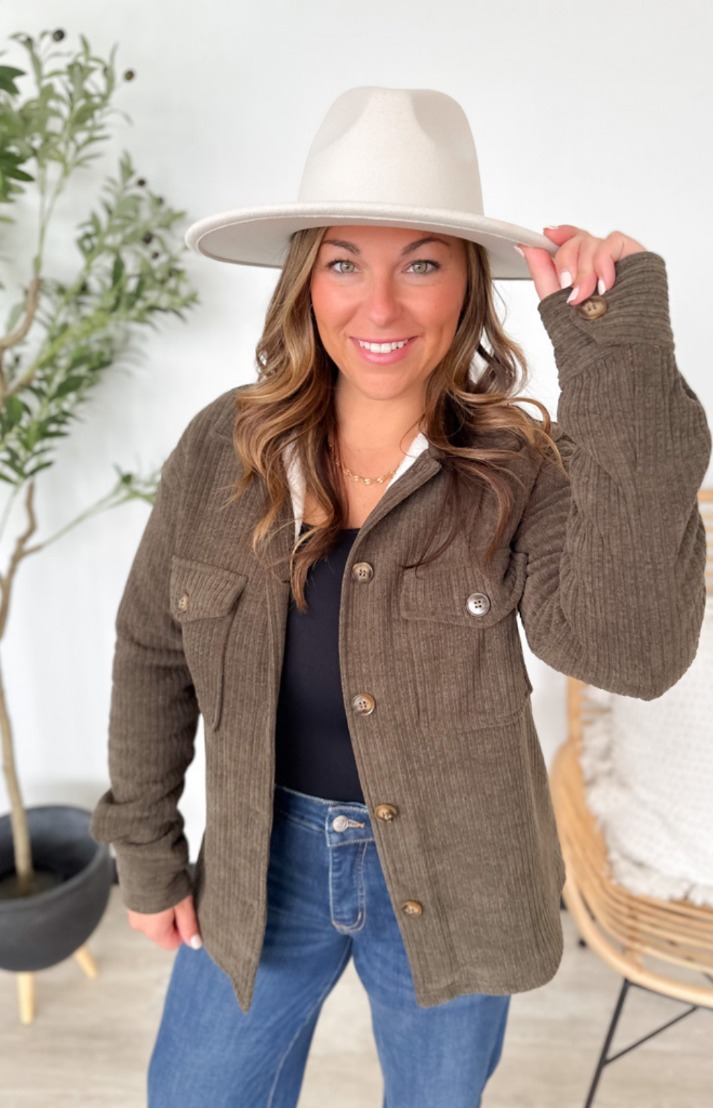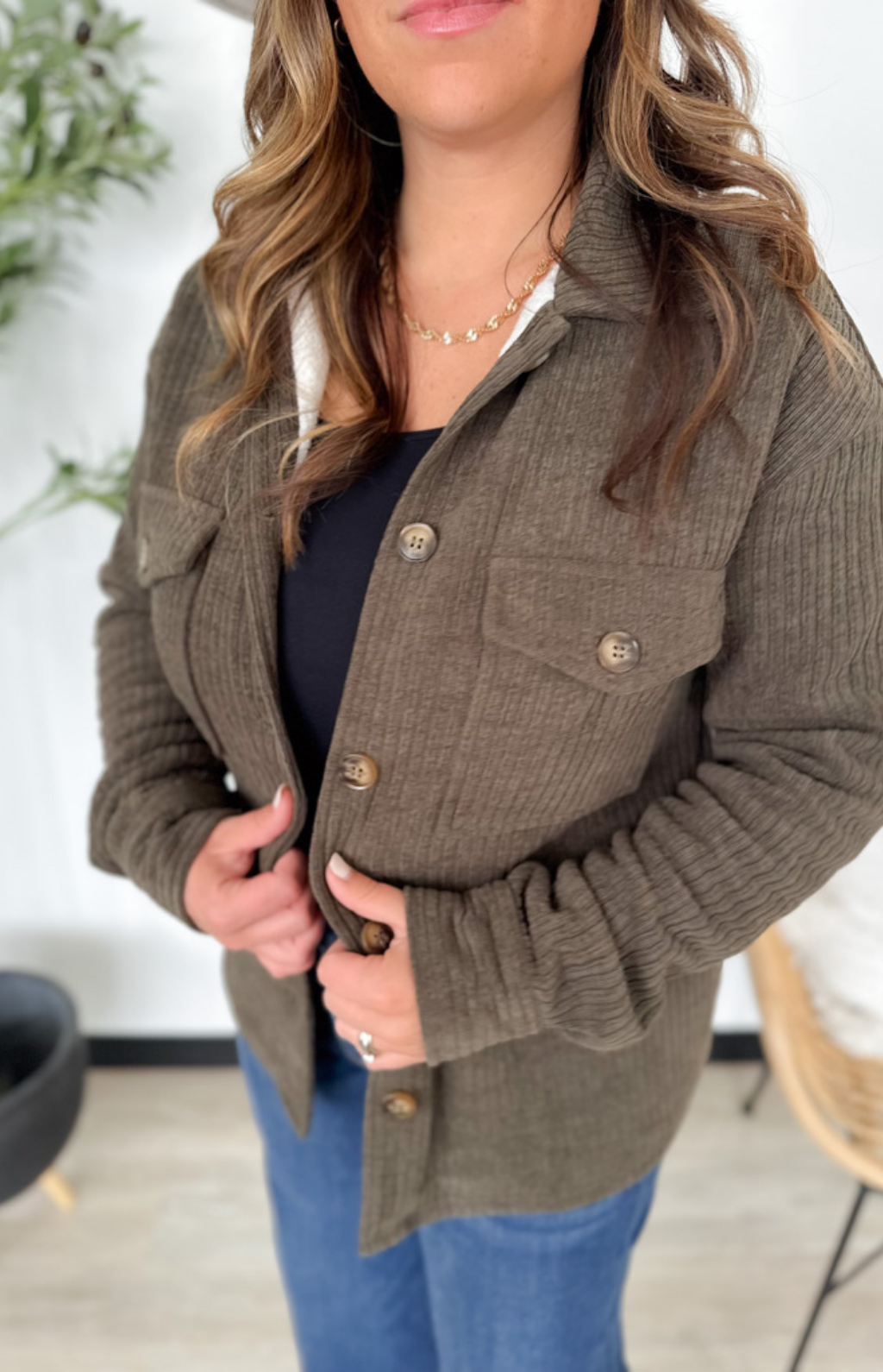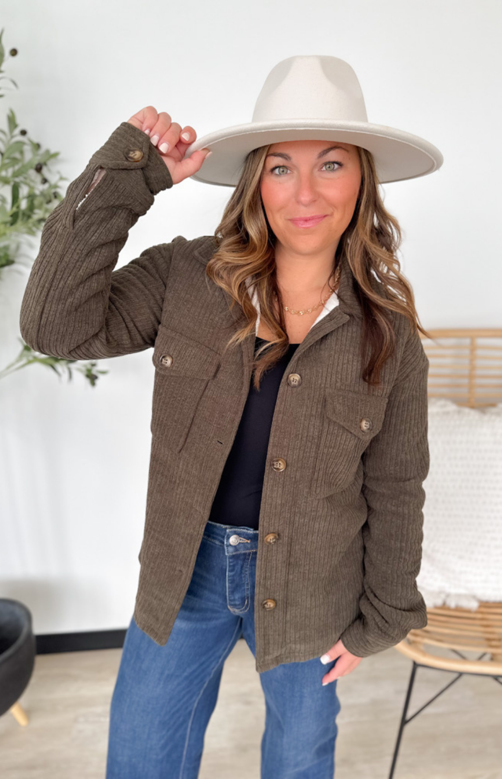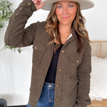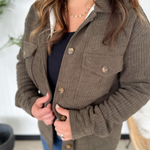 This ribbed brown jacket is the perfect mix of cozy and cool. The soft ribbed texture gives it a casual, laid-back look, while the warm sherpa lining keeps you extra snug on chilly days. With a classic button-up front, it’s easy to layer over your favorite tees or sweaters. The rich brown hue makes it a timeless, go-with-anything piece you’ll wear all season long. Comfortable, cute, and effortlessly warm—this jacket is a cold-weather must-have.