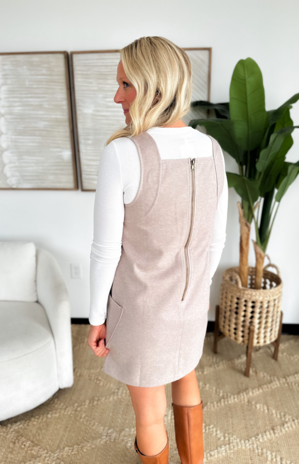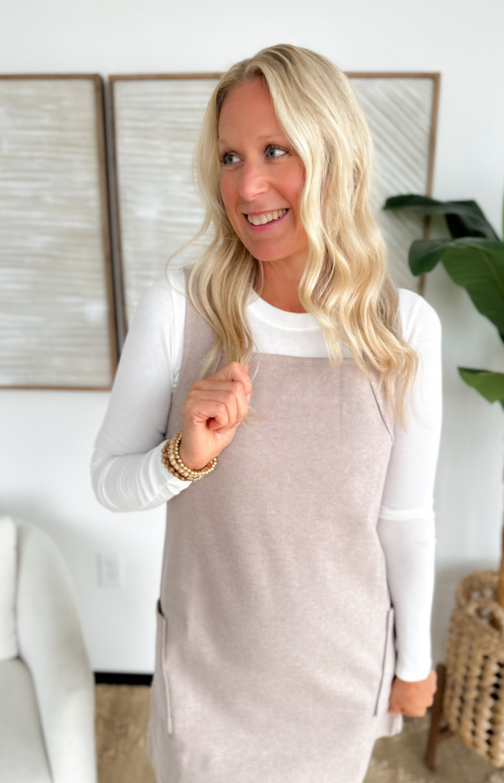 This soft textured mini dress is as easy as it is flattering. The square neckline adds a modern, feminine touch, while the subtle texture gives it that elevated feel you’ll love. Bonus—yes, it has pockets (because who doesn’t need them?). The mini length makes it perfect for pairing with sneakers for a casual day out or dressing up with boots and a jacket for a night out. Comfortable, stylish, and practical, this dress is the grab-and-go piece that makes getting dressed simple and fun.