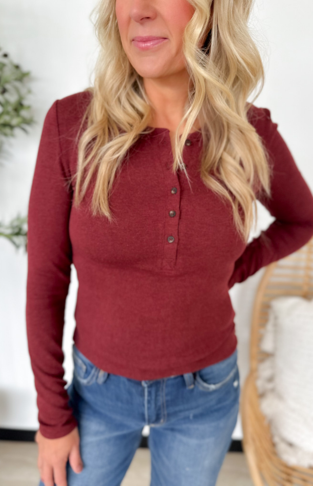 This long sleeve burgundy ribbed henley top is a timeless classic with a cozy, flattering fit. The soft ribbed material gives it just the right amount of stretch, while the button-down neckline adds that casual, laid-back charm. The rich burgundy color is perfect for fall and pairs effortlessly with jeans, skirts, or layered under jackets. It’s comfy enough for lounging but cute enough for heading out. A true everyday staple you’ll reach for again and again.