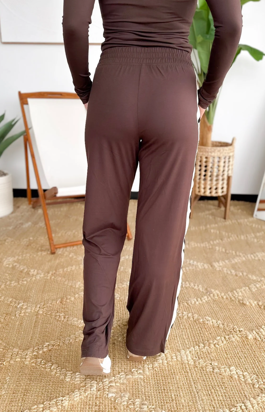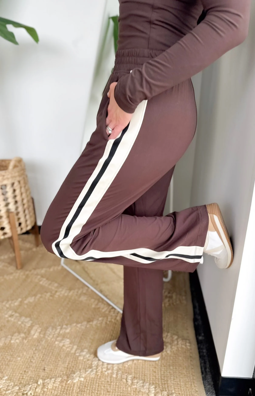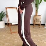 These brown high-rise sweatpants are the kind you’ll never want to take off—but still feel good wearing out of the house. The elastic waistband gives you an easy, comfortable fit, while the buttery soft fabric feels amazing all day long. Cream and black stripe detailing along the outside of the leg adds a sporty, elevated touch that sets them apart from your average sweats. Pockets make them practical for real life, whether you’re running errands or relaxing at home. Pair them with a tee or the matching top and enjoy comfort that still looks put together.