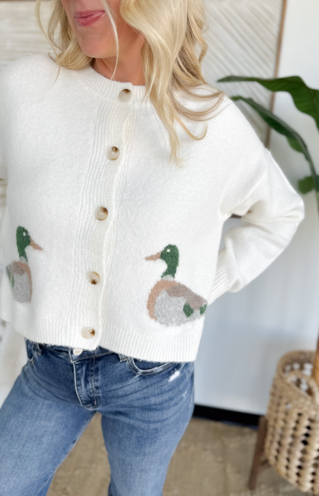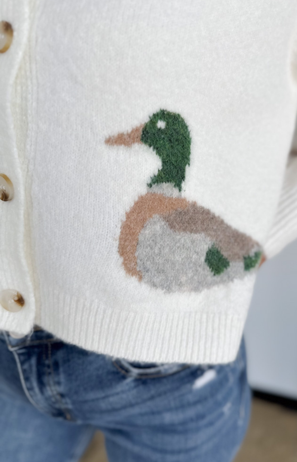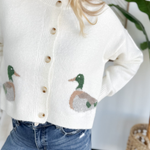 This cream knit sweater is the perfect mix of cozy and playful. Designed with a classic button-down front, it gives you styling versatility—wear it open over a tee or buttoned up for a polished look. The standout detail? A trendy duck design that adds just the right amount of fun and personality to your outfit. Soft knit fabric keeps you comfortable all day while the neutral cream shade makes it easy to pair with your favorite denim. It’s a charming, feel-good piece you’ll reach for when you want to stay warm without sacrificing style.