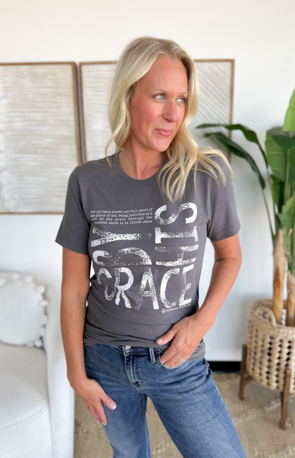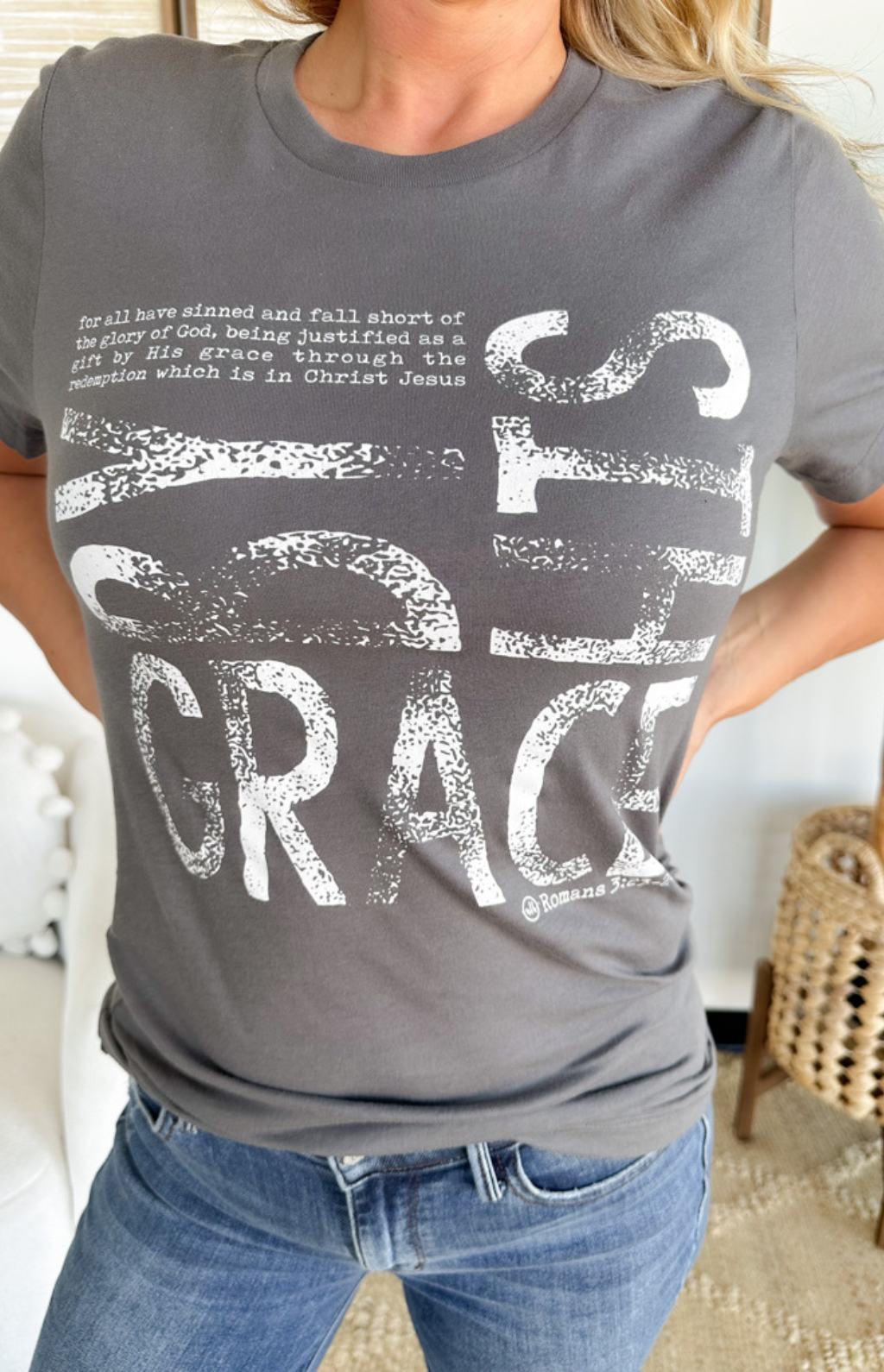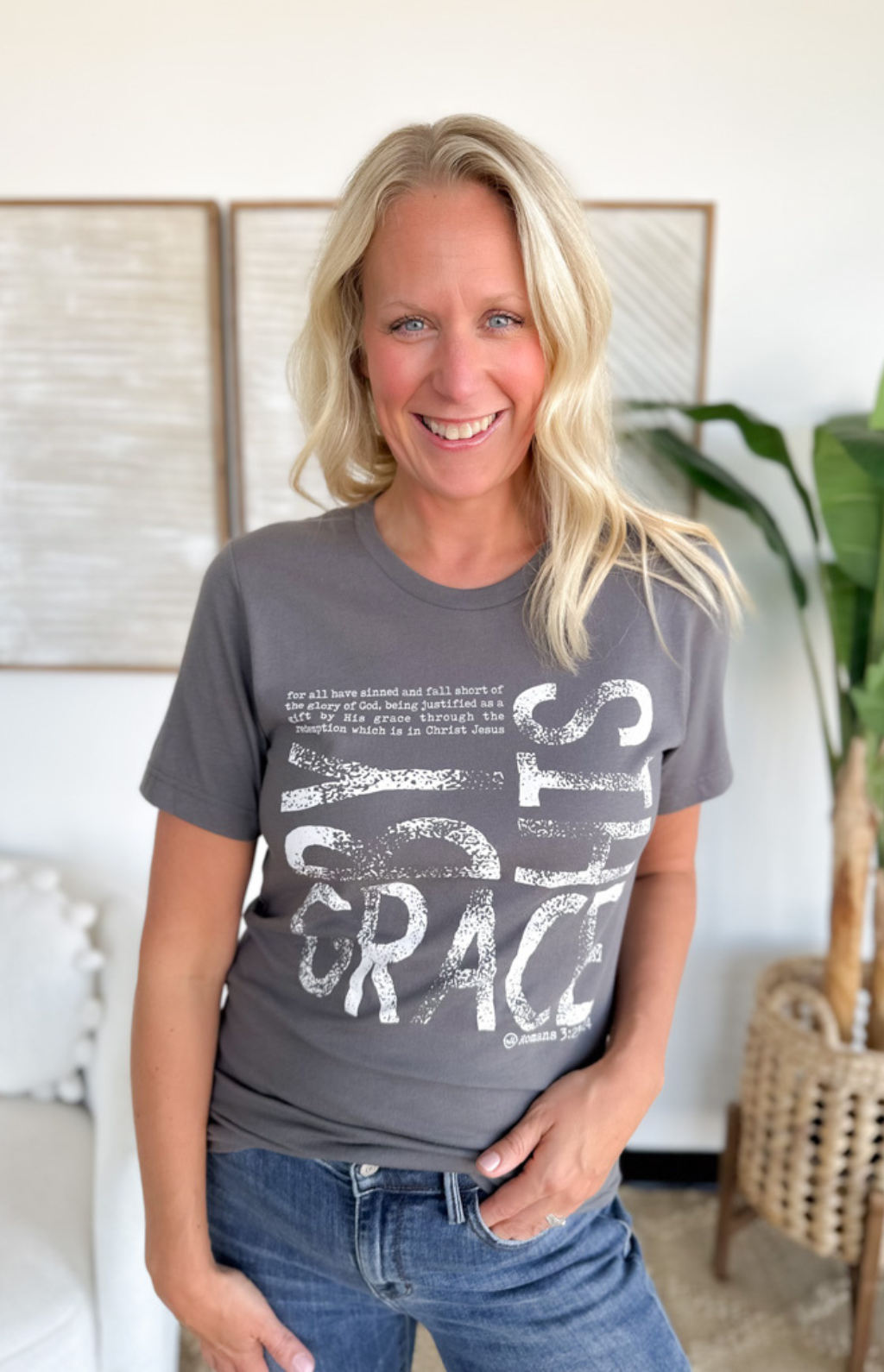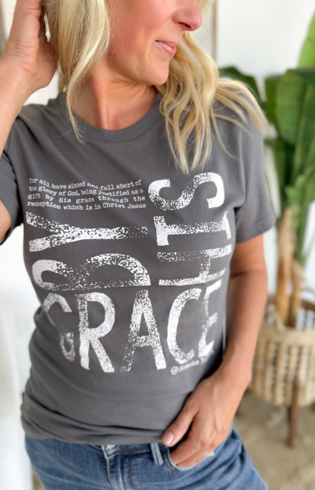 This grey t-shirt is a simple yet powerful reminder of faith. Featuring the words “By His Grace” across the front, it’s a piece that’s both uplifting and easy to wear. The soft fabric and classic fit make it perfect for everyday life—whether you’re running errands, heading to a casual outing, or just relaxing at home. Its neutral grey shade pairs effortlessly with jeans, shorts, or joggers, making it a versatile staple. Comfortable, meaningful, and stylish, this tee is one you’ll reach for again and again.
