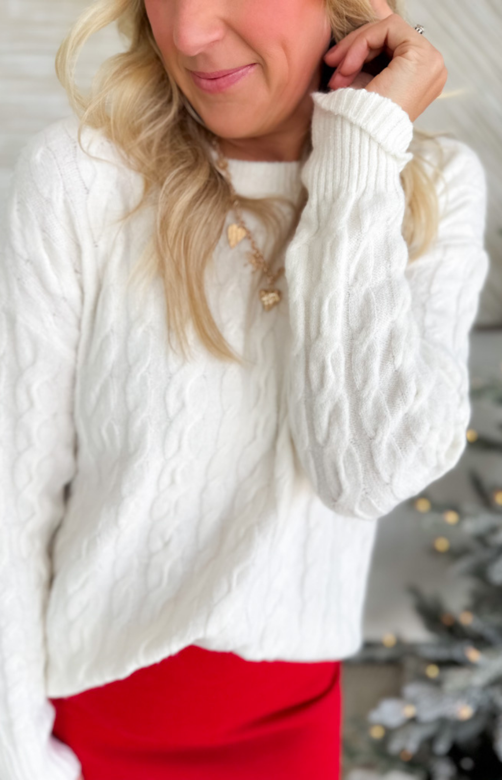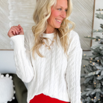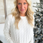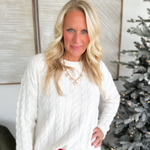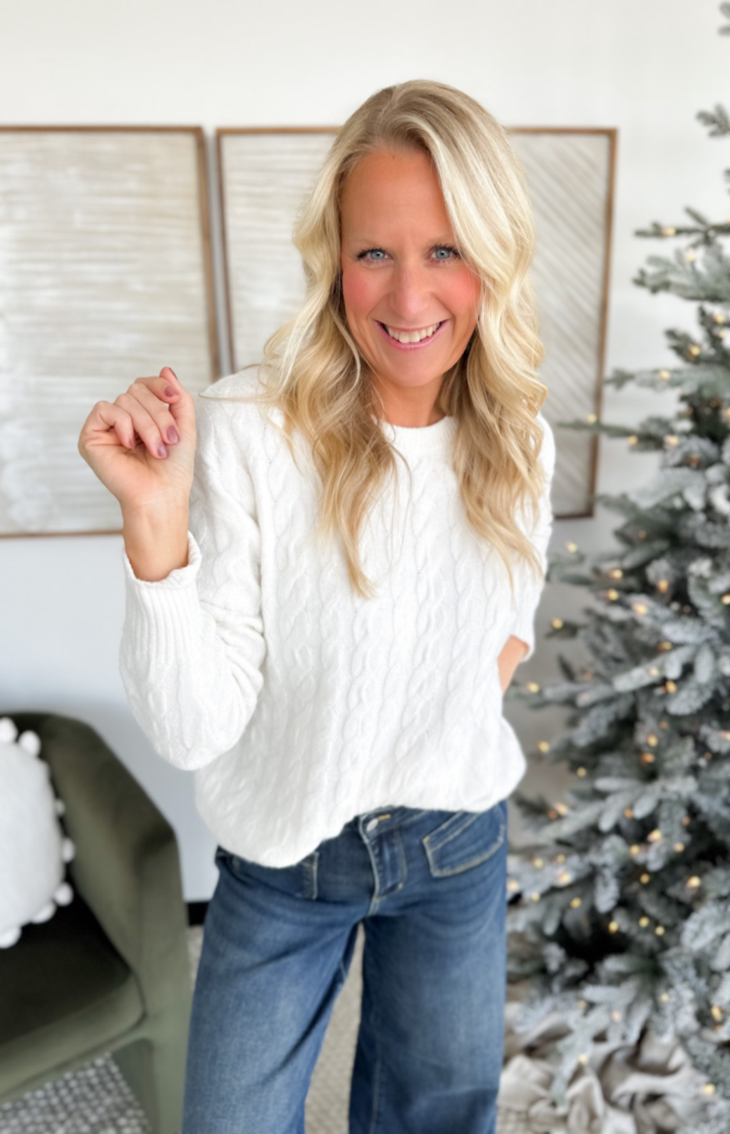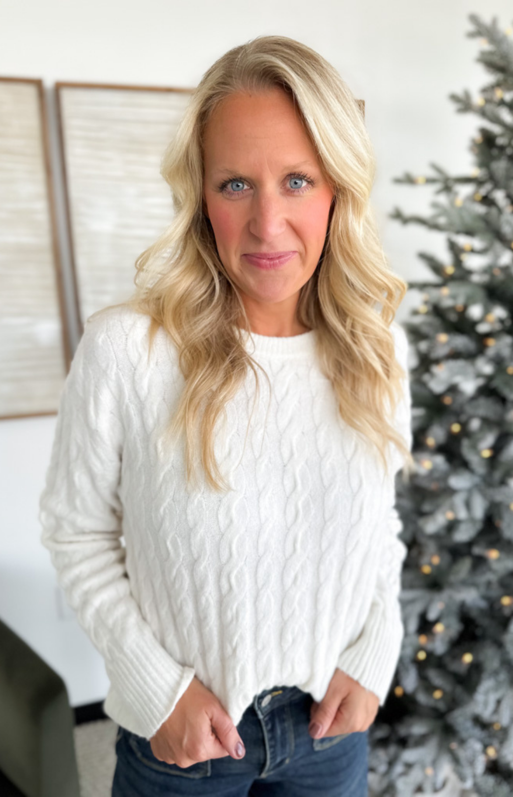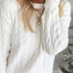 This cream-colored cable knit sweater is a cozy classic you’ll love wearing all season. The timeless cable knit pattern adds texture and charm, while the soft, warm fabric keeps you comfortable from morning errands to evening outings. Its relaxed fit makes it easy to layer under jackets, and the neutral cream hue pairs effortlessly with everything in your wardrobe. A versatile, stylish staple that feels as good as it looks—perfect for busy days when you want to look put-together with minimal effort.