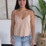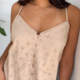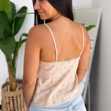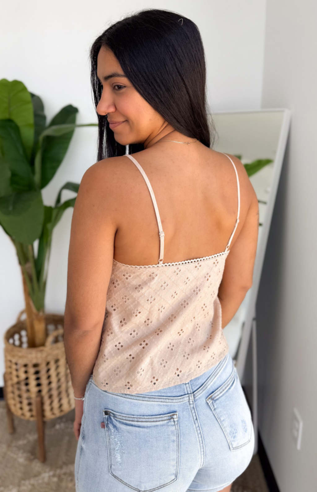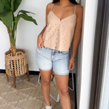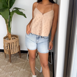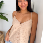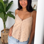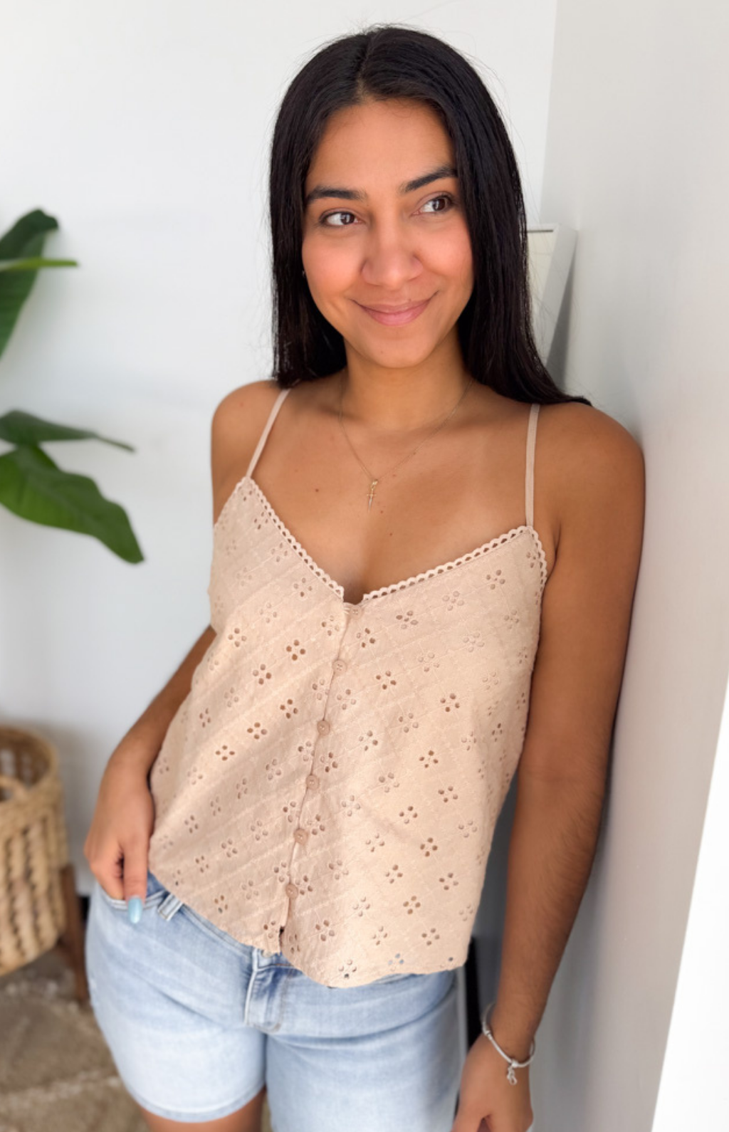 Soft, sweet, and effortlessly pretty — this camel-colored Cami is all about the details. With delicate eyelet lace and dainty buttons down the front, it’s the kind of top that instantly dresses up denim or layers beautifully under your favorite jacket. Lightweight and breathable, it’s perfect for sunny days, coffee dates, and everything in between.