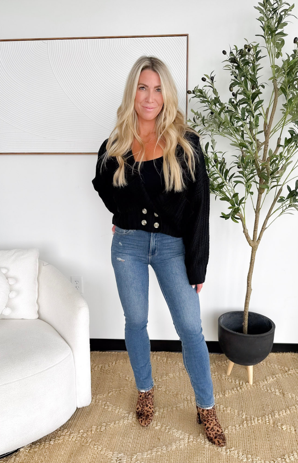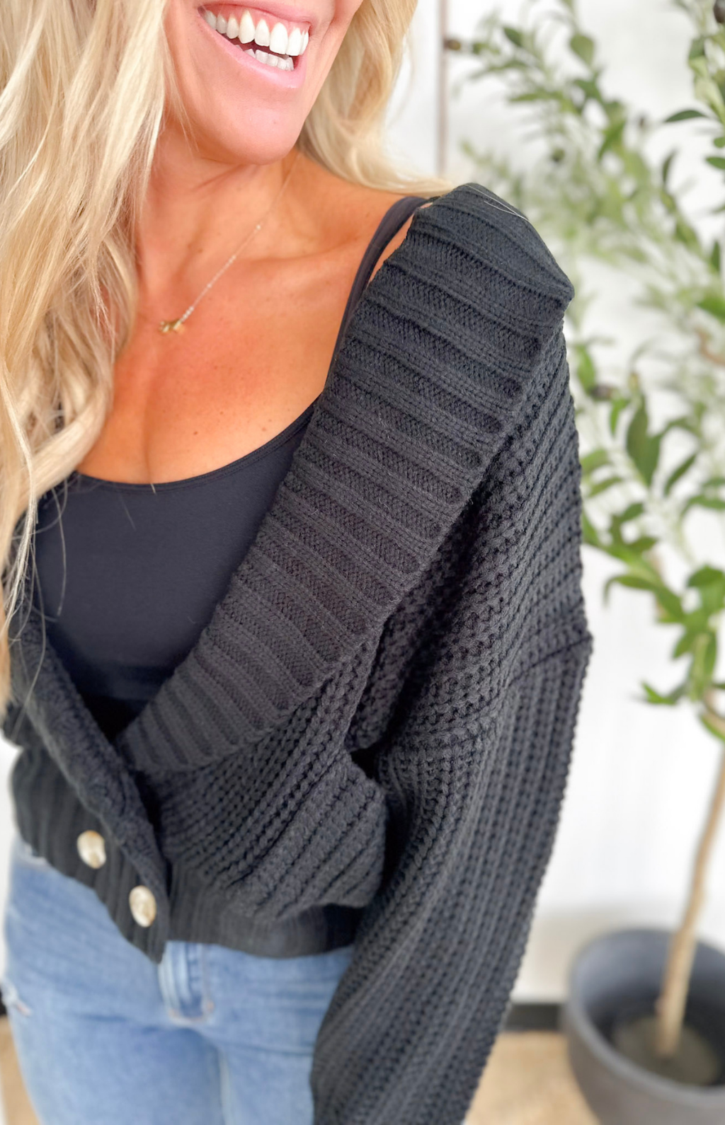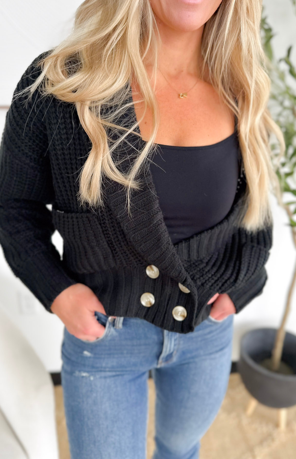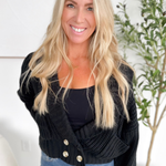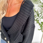 This chunky black knit cardigan is your new “instant cozy, instant polished” piece. The collared neckline and deep V give it a slightly elevated feel, while the thick, textured knit keeps you wrapped in comfort all day long. The button detailing down the front adds a classic touch that makes it easy to dress up or down—perfect for work, errands, or those days you just need something effortless but chic. Throw it on over a tank, tee, or dress and you’re ready in seconds. It’s the kind of cardigan that becomes a cold-weather go-to without even trying.