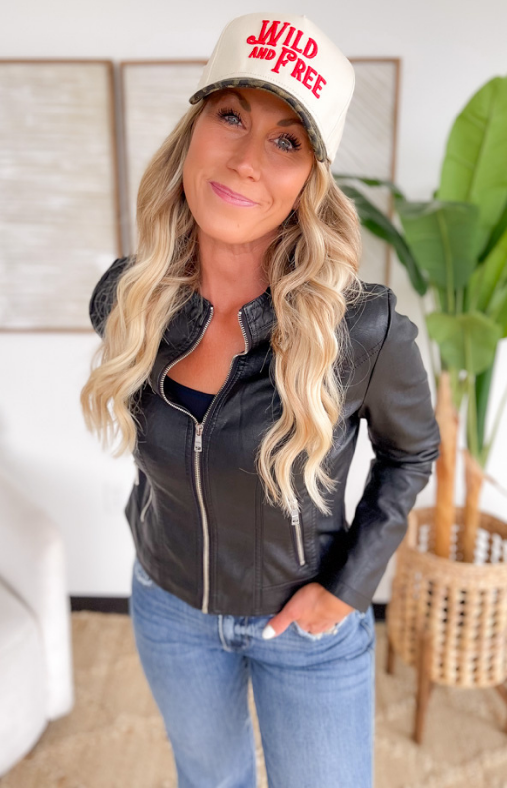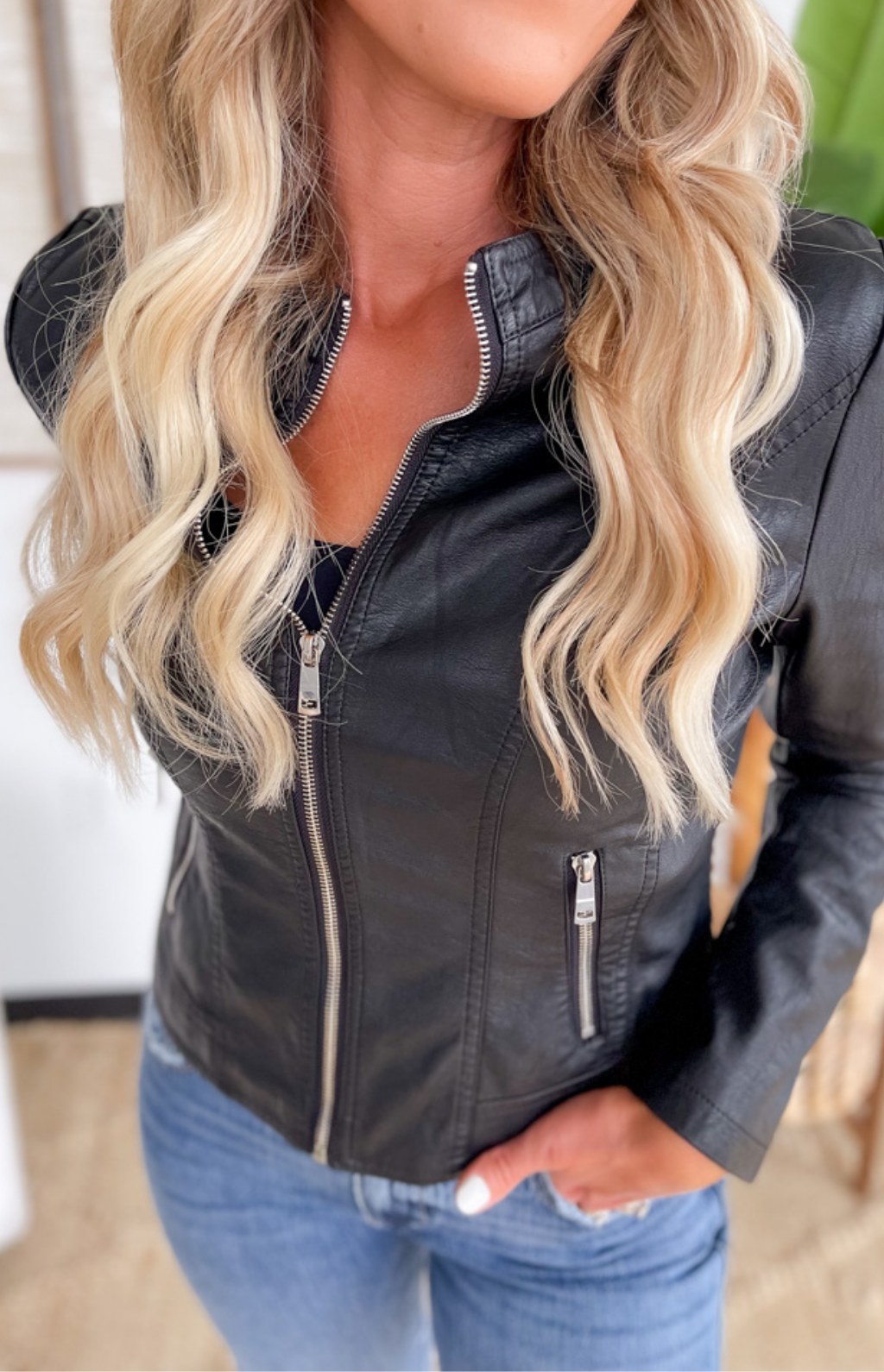 This classic black leather jacket is the ultimate cool-girl essential. With its sleek, structured silhouette and timeless design, it instantly elevates any outfit—from casual jeans and a tee to a flowy dress. The buttery faux leather has just the right amount of edge, while the zip-up front and angled pockets keep it functional and flattering. Whether you're heading out for a girls’ night or layering up for a chilly morning, this jacket brings all the bold, confident vibes.