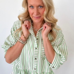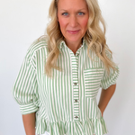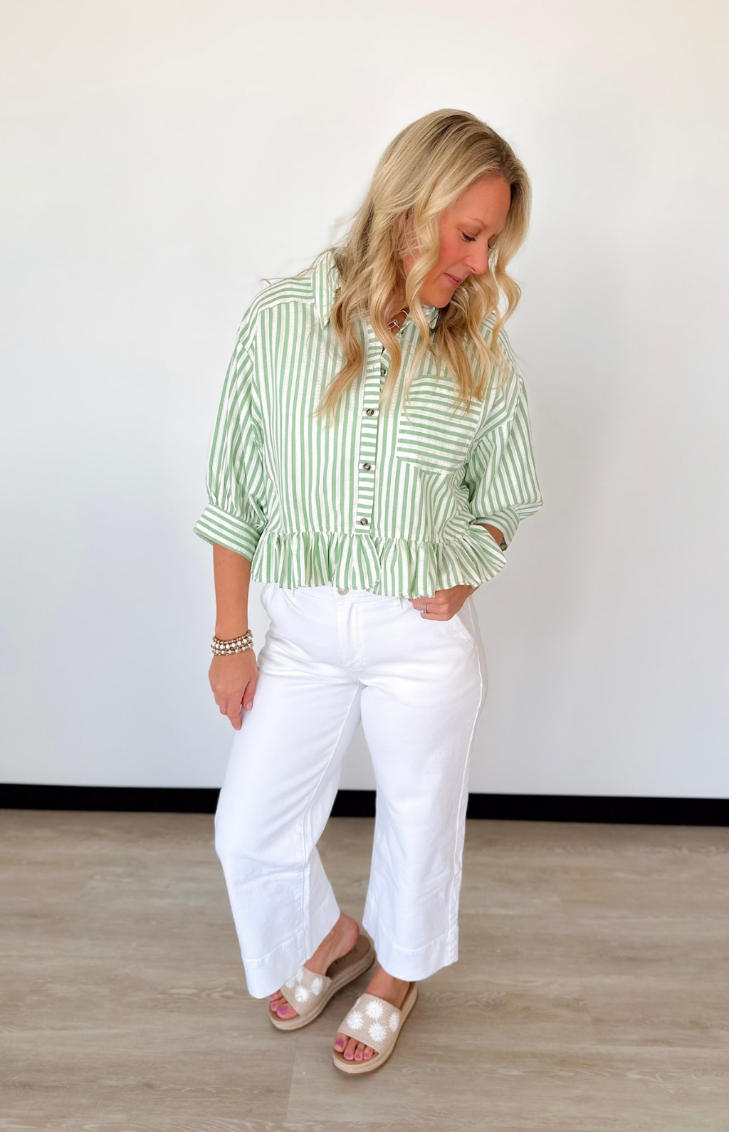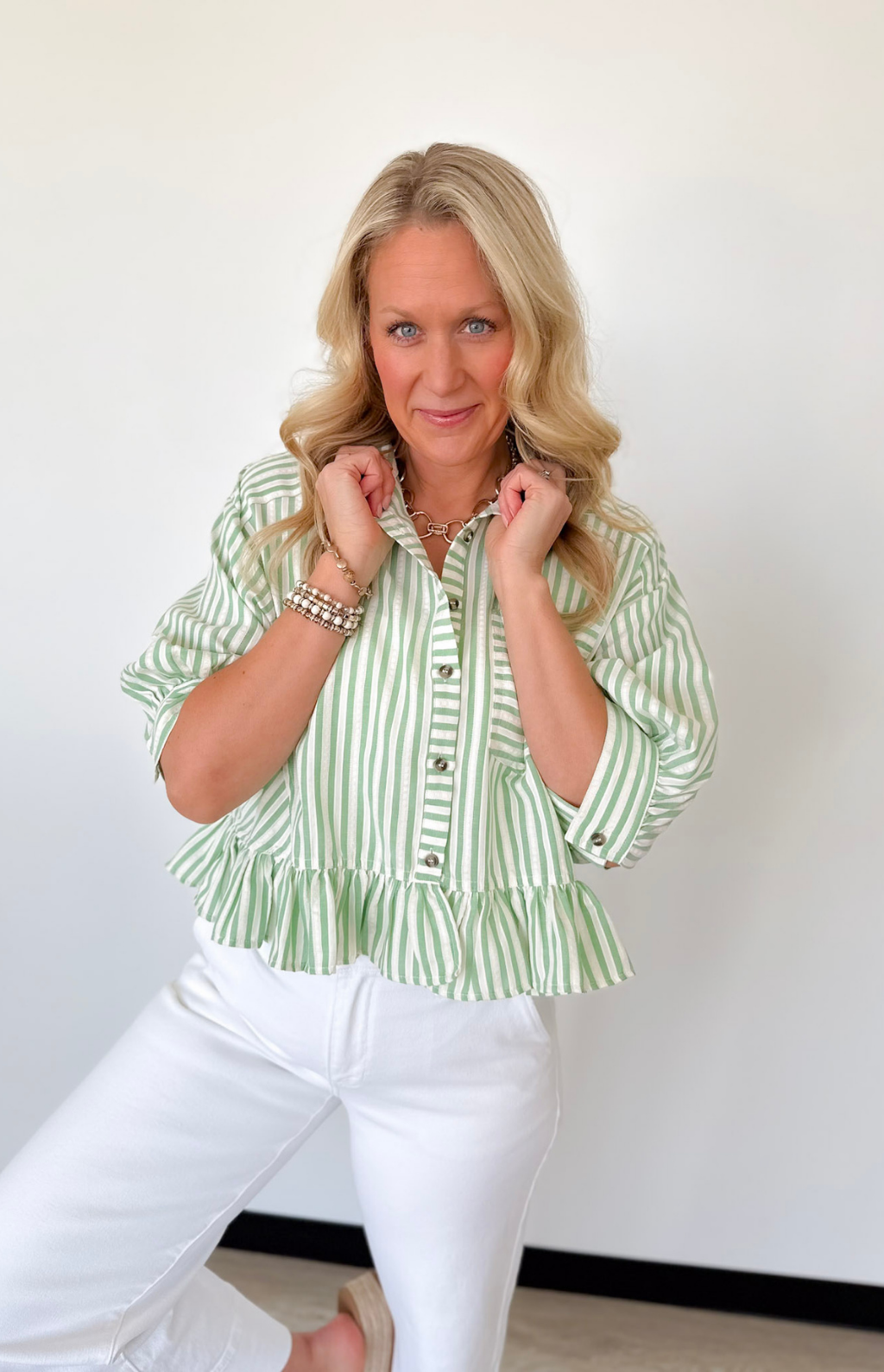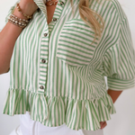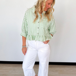 This button-up collared shirt features classic clover green and white textured stripes that give it a fresh, polished look. Designed with puffy half sleeves, it adds a soft, feminine silhouette with just the right amount of volume. The structured collar and button-front create a timeless, tailored feel that’s easy to style. A ruffled hem adds playful movement and a touch of romantic charm. The lightweight fabric makes it comfortable and breathable for all-day wear.