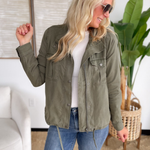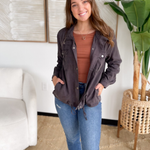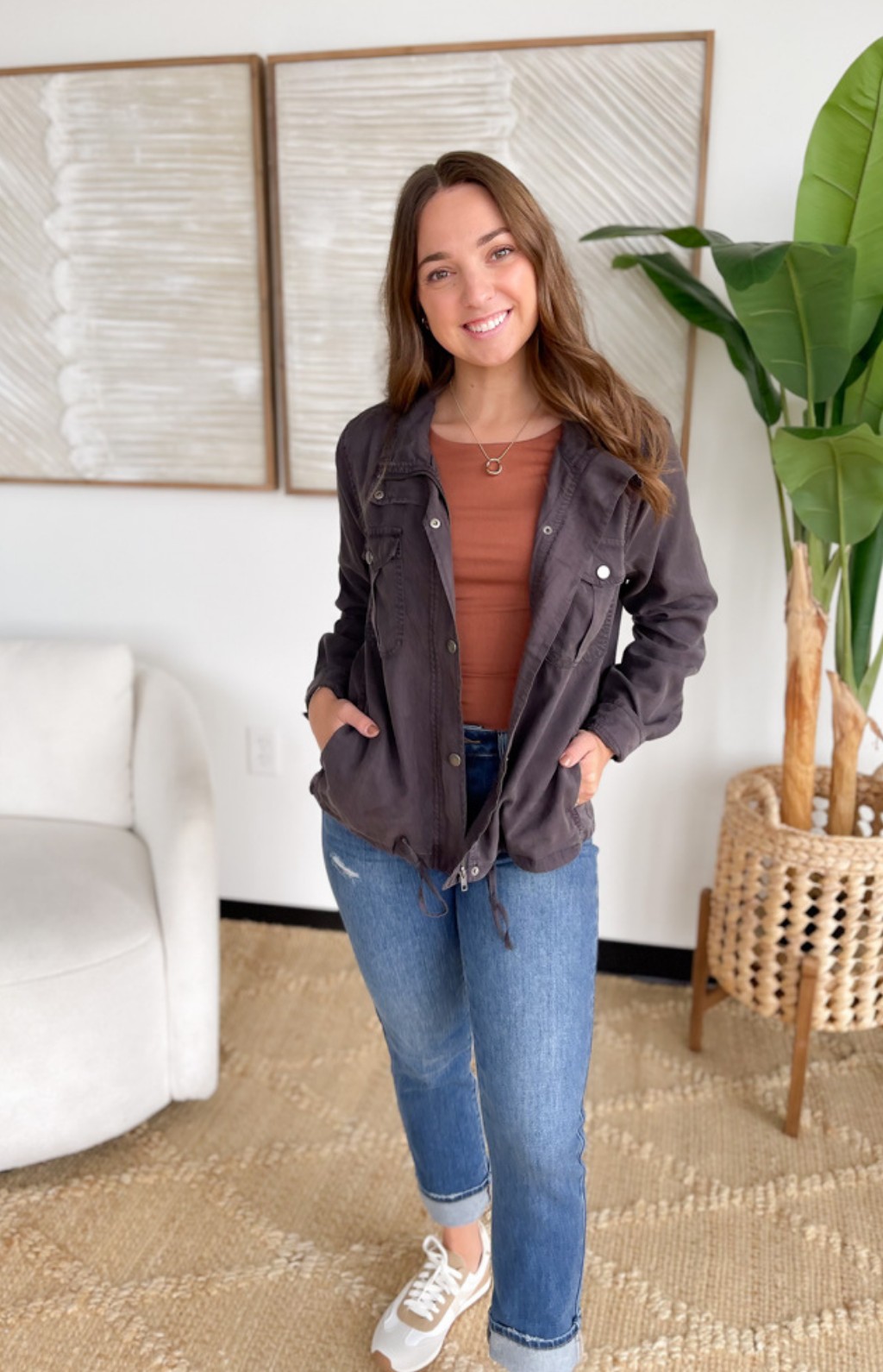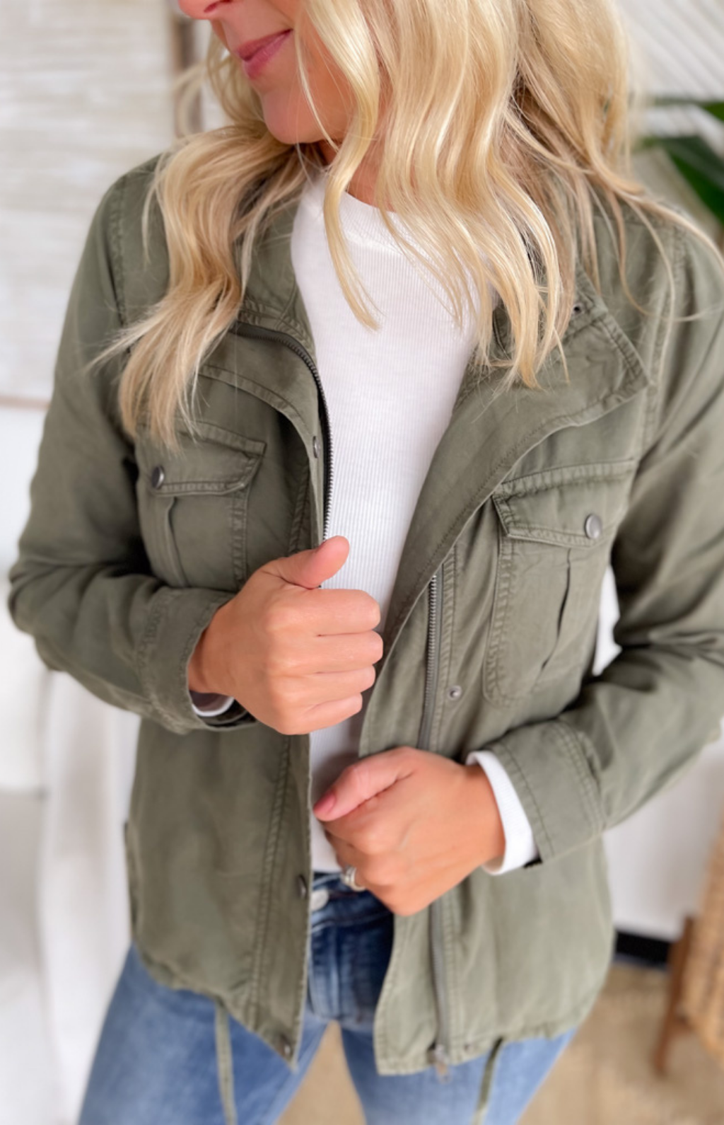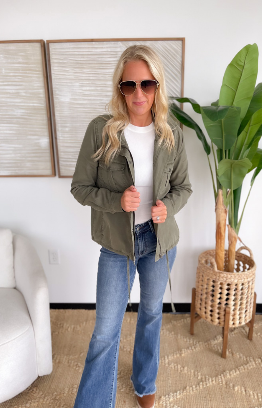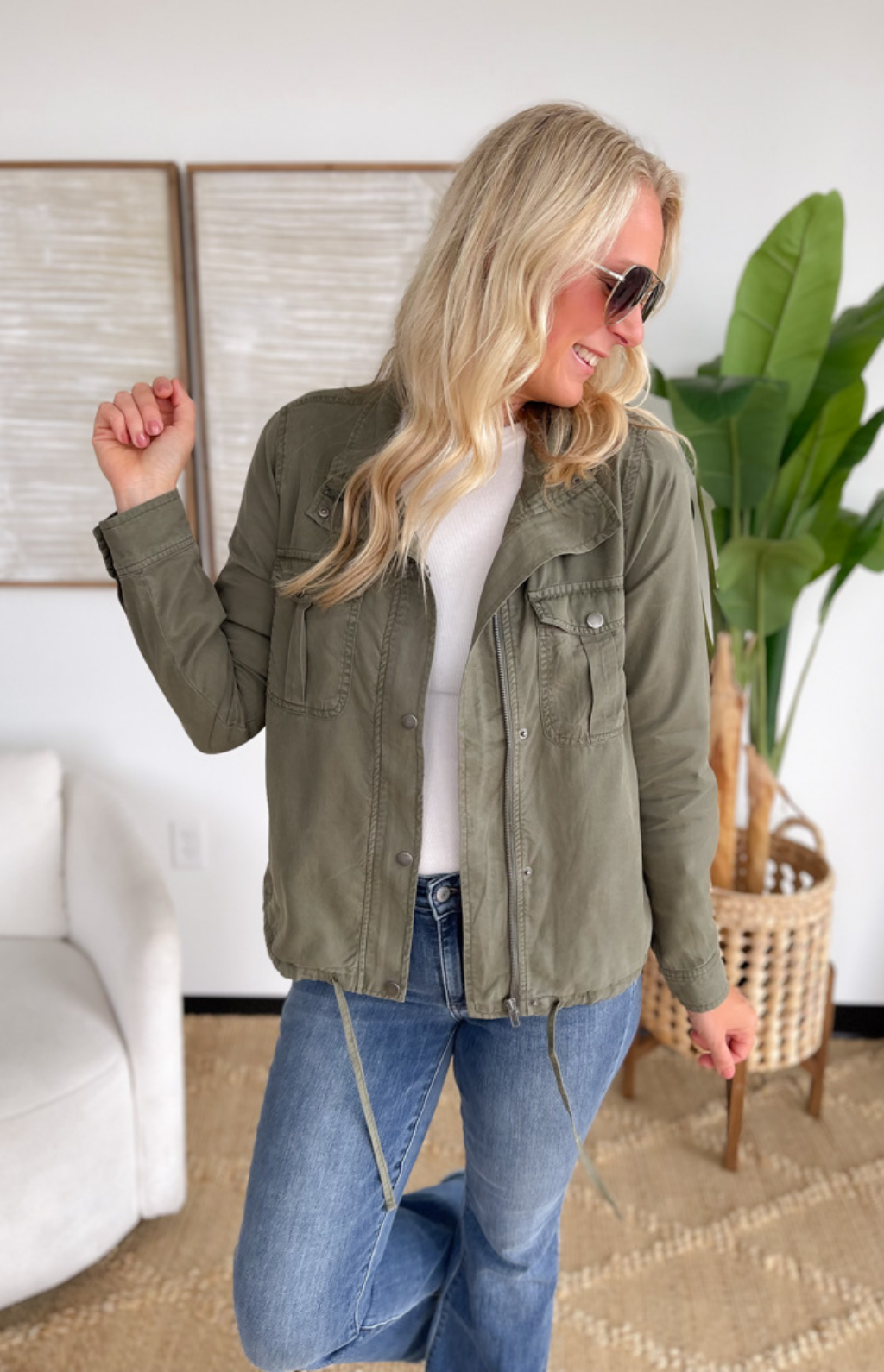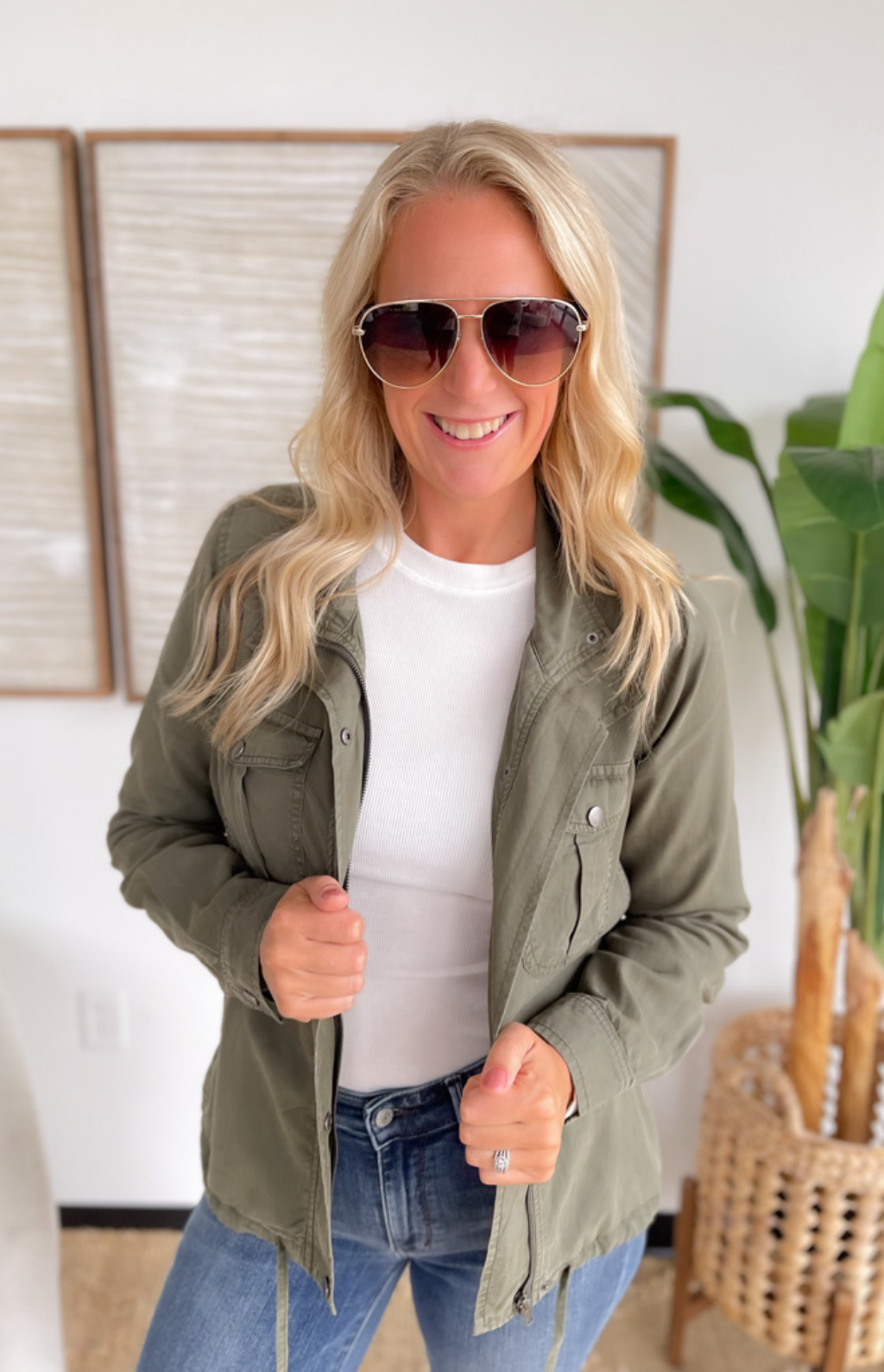 This lightweight utility zip-up jacket is the layer you’ll want on repeat. Designed with a relaxed fit and just-right weight, it’s perfect for tossing on during cool mornings, casual outings, or travel days. The zip front makes it easy to wear open or closed, while utility-inspired details give it that effortless, on-trend vibe. Functional pockets keep your essentials close, so you can stay hands-free and ready to go. It’s the kind of jacket that makes your everyday outfits feel pulled together without any extra effort.