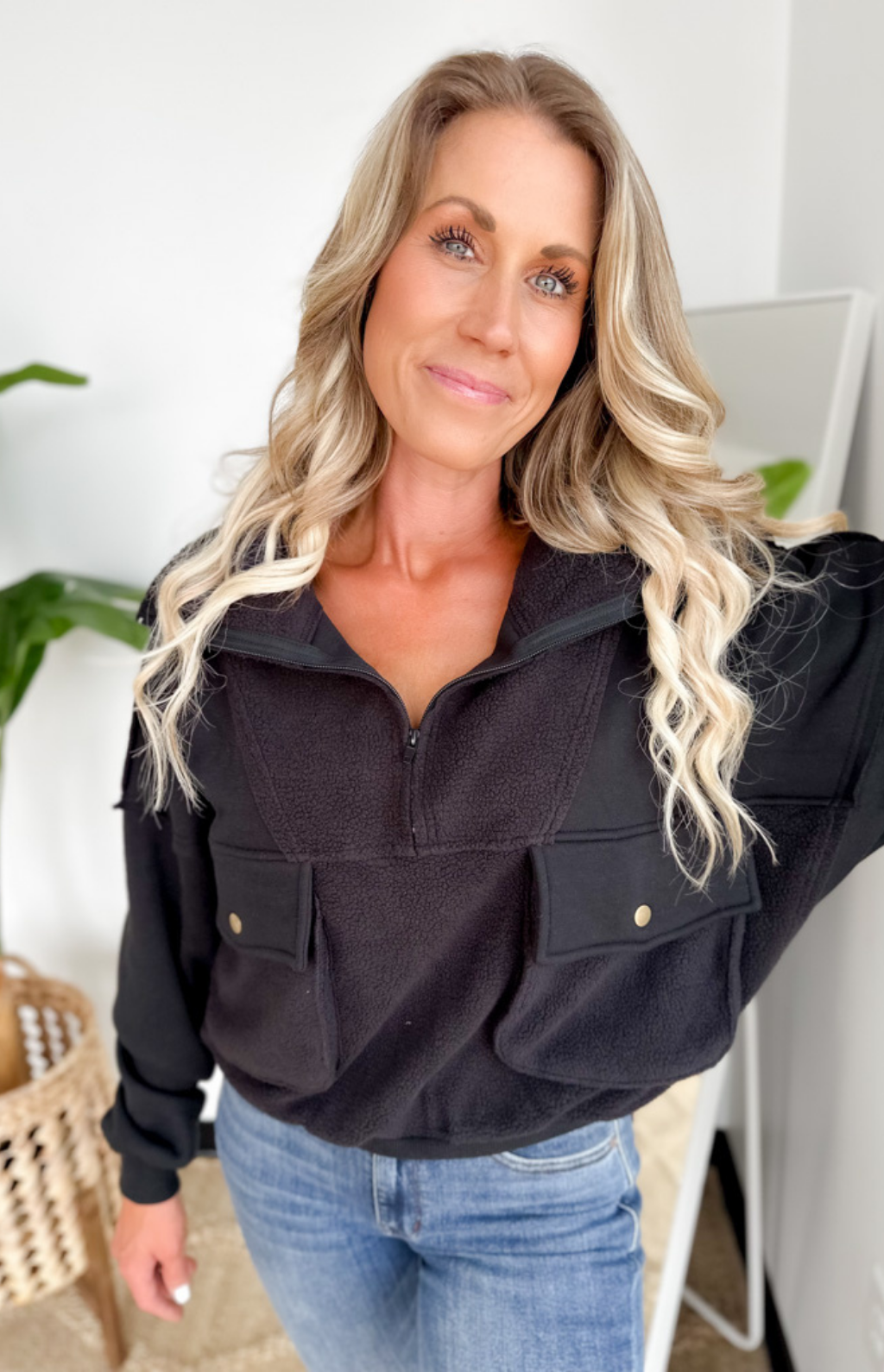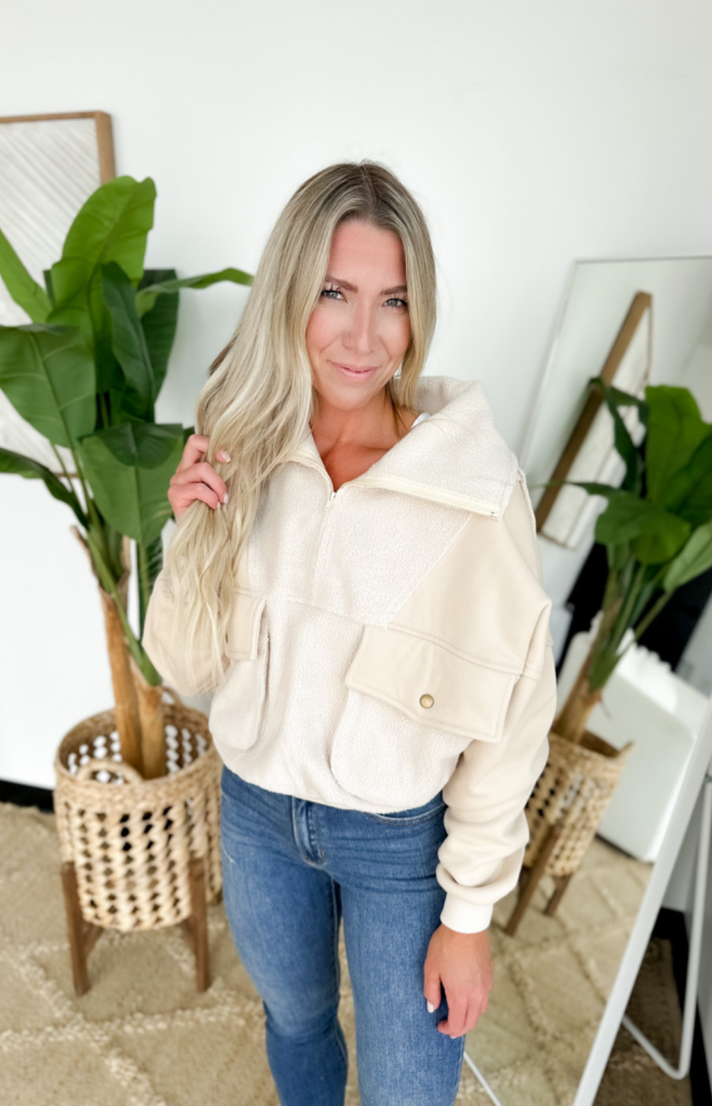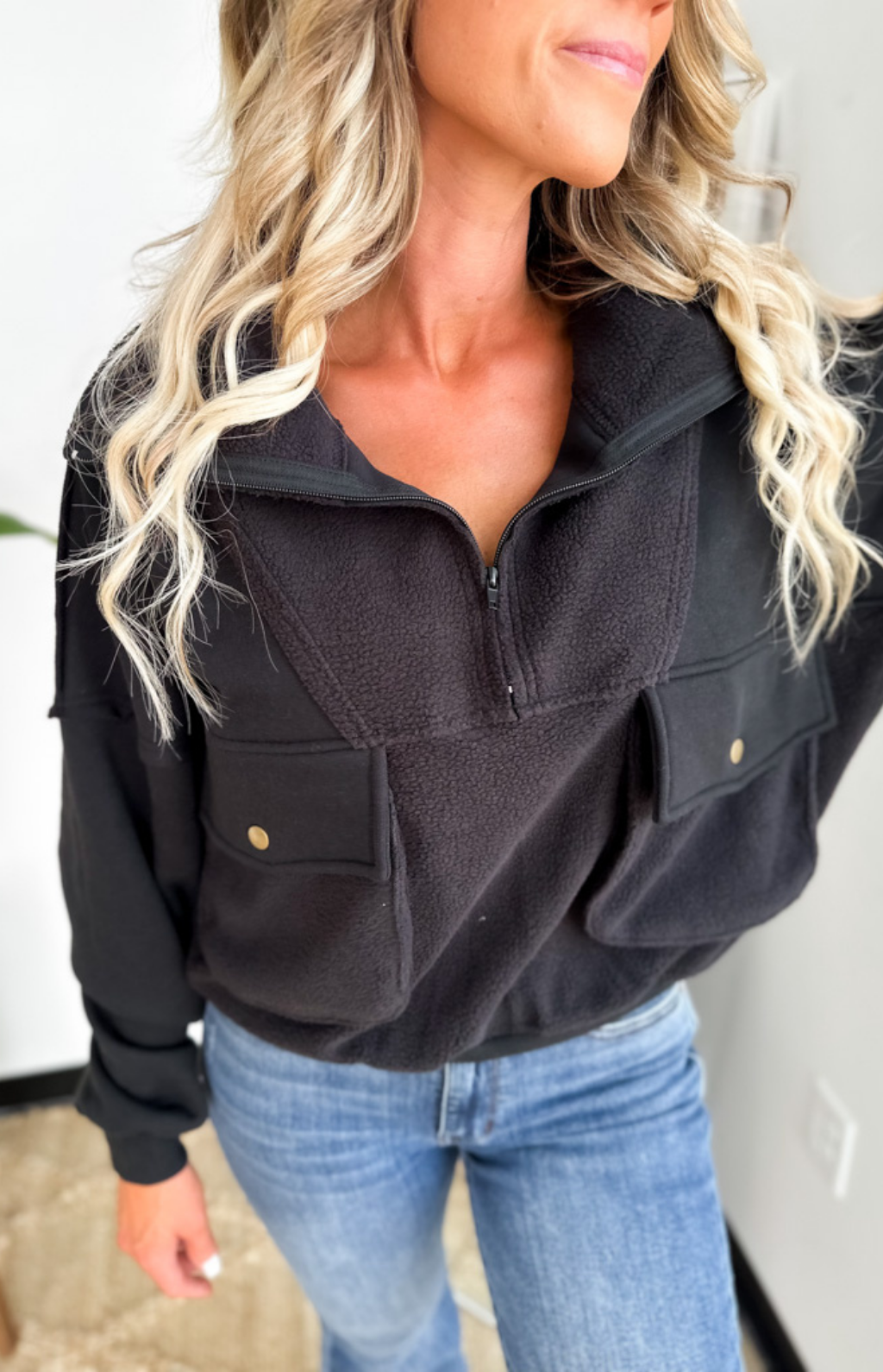 Stay warm without sacrificing style in this contrast sherpa pullover! The ultra-soft sherpa fabric keeps you cozy, while the half-zip closure lets you adjust for comfort and easy layering. The contrast detailing adds a modern, sporty touch, making it perfect for casual days, outdoor adventures, or just lounging in style. A cold weather favorite you’ll want to live in all season long!
