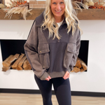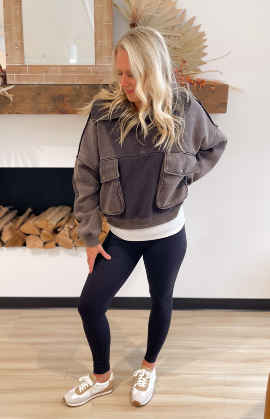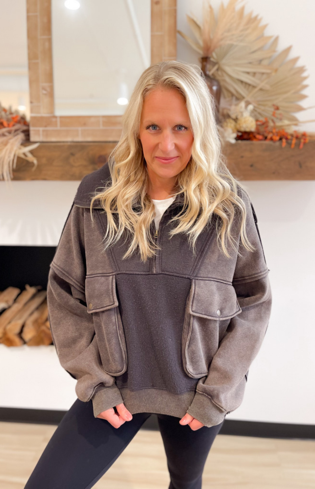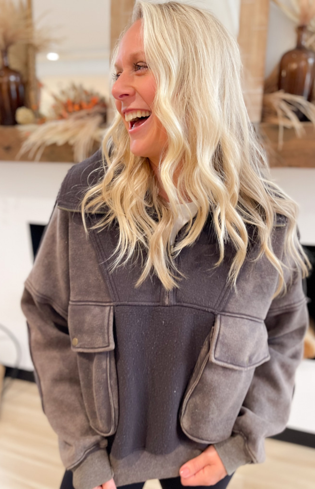 Contrast Sherpa Quarter Zip Pullover-Charcoal