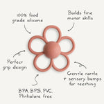 The silicone Daisy Rattle Teether features a playful flower shape and built-in rattle. The cheerful sound engages baby’s auditory senses for added soothing relief. With handles that are easy for small hands to grasp and a textured silicone surface that massages gums, our rattle teethers are perfect for your little one’s teething journey!