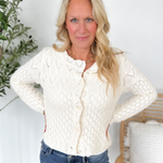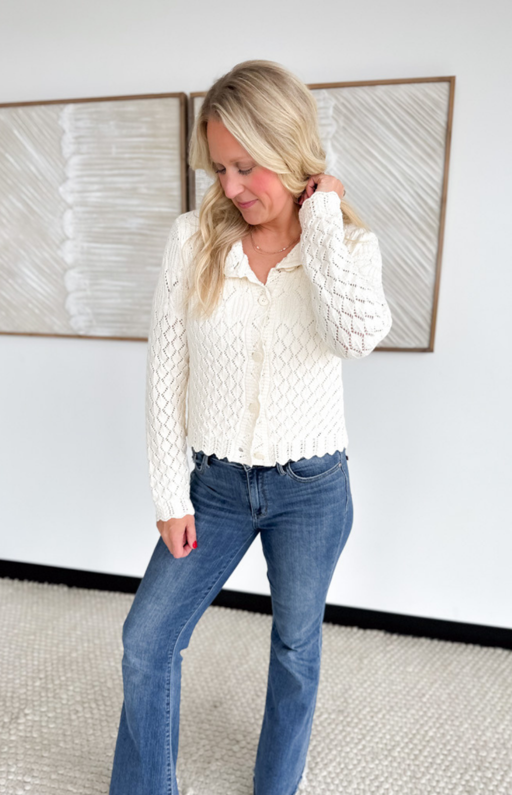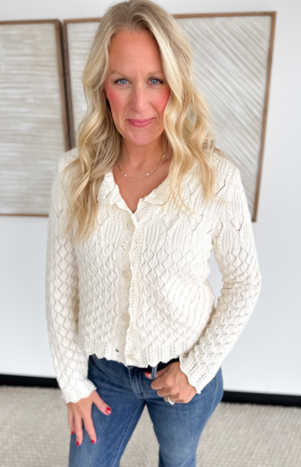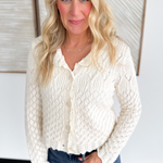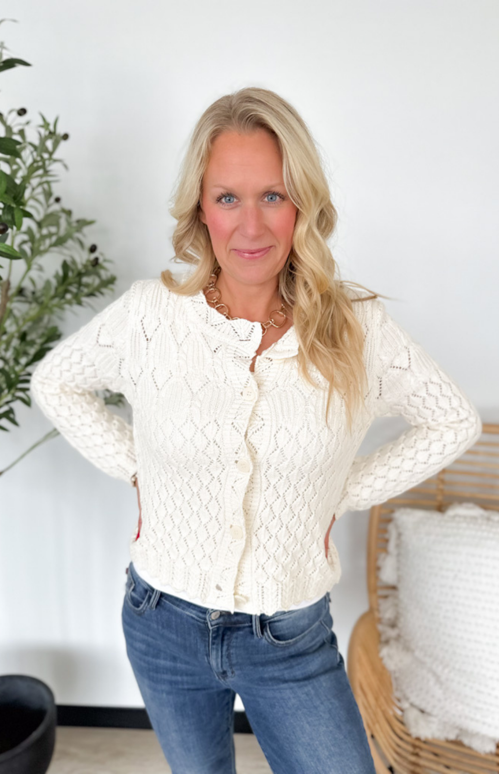 This cream-colored crochet button-up cardigan is the perfect mix of feminine and timeless. The delicate crochet knit adds beautiful texture and charm, while the button-up front lets you style it open over a tank or closed for a classic look. Lightweight and breathable, it’s ideal for layering through the seasons. The soft cream hue makes it easy to pair with anything in your closet, from denim to dresses. It’s that sweet, effortless piece that adds a touch of cozy elegance to any outfit.