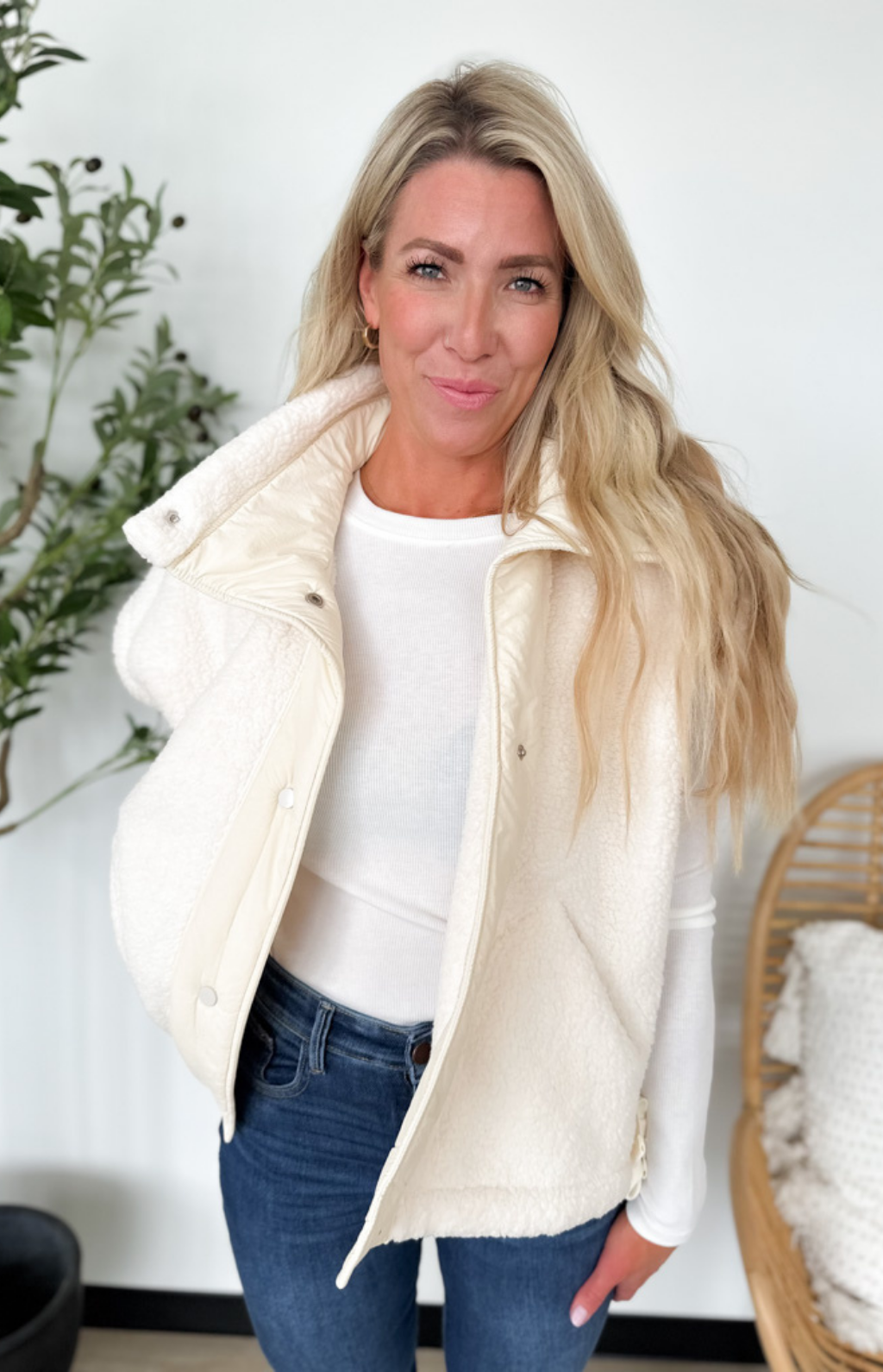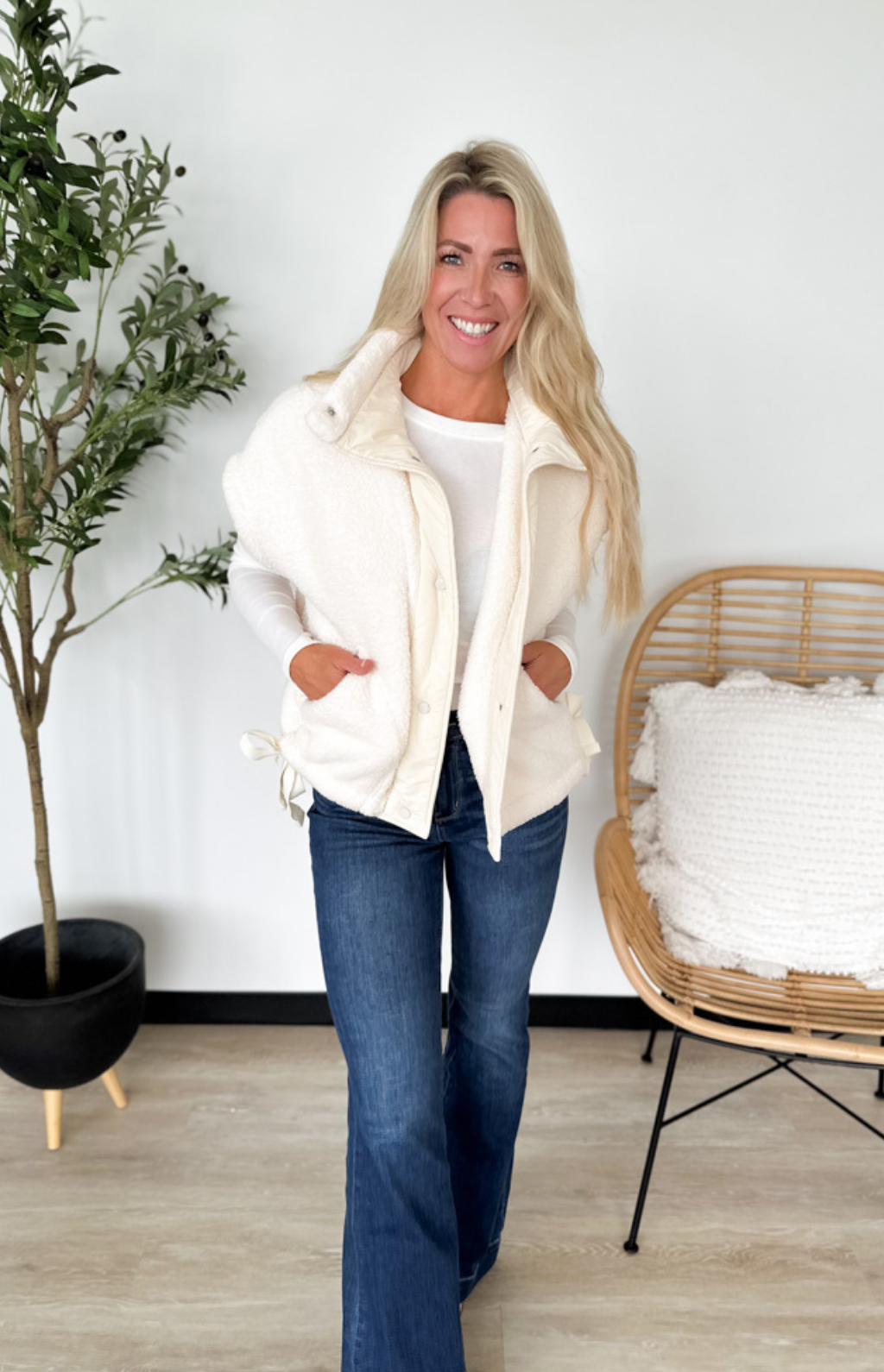 This cream fleece vest is the perfect cozy layer for cooler days. The soft fleece fabric feels warm and plush, while the button-up front adds a touch of classic charm. Designed with an elastic waistband for a flattering, comfortable fit, it’s easy to style over your favorite long sleeve or flannel. The neutral cream color makes it endlessly versatile—pair it with jeans, leggings, or joggers for an effortlessly pulled-together look. It’s that just-right mix of cozy, casual, and cute you’ll wear on repeat all season long.