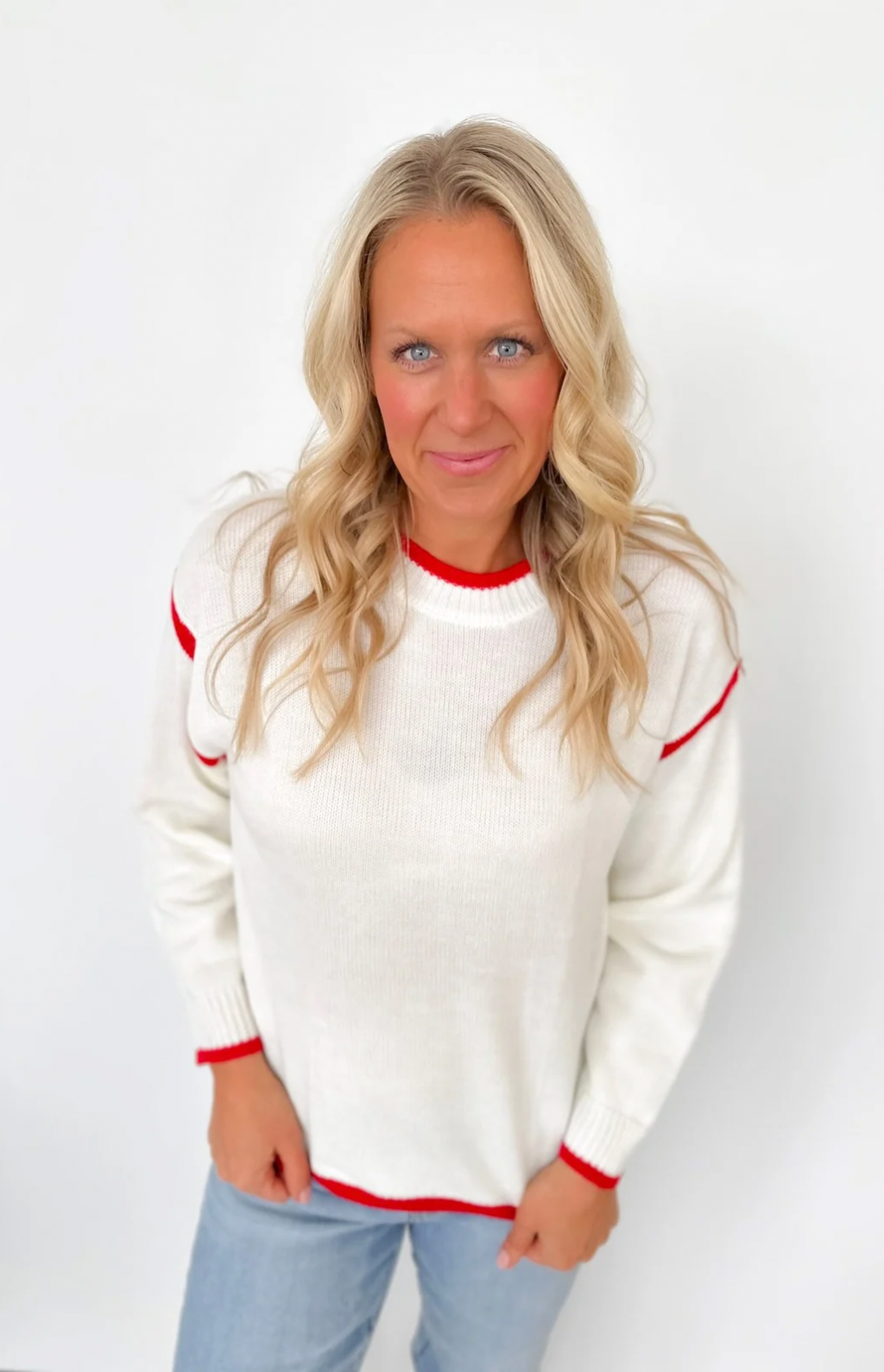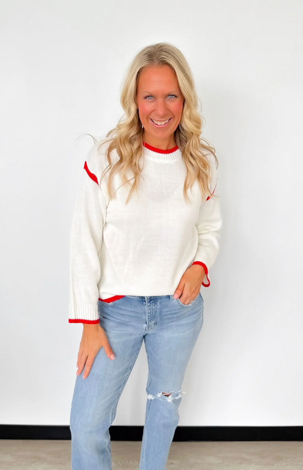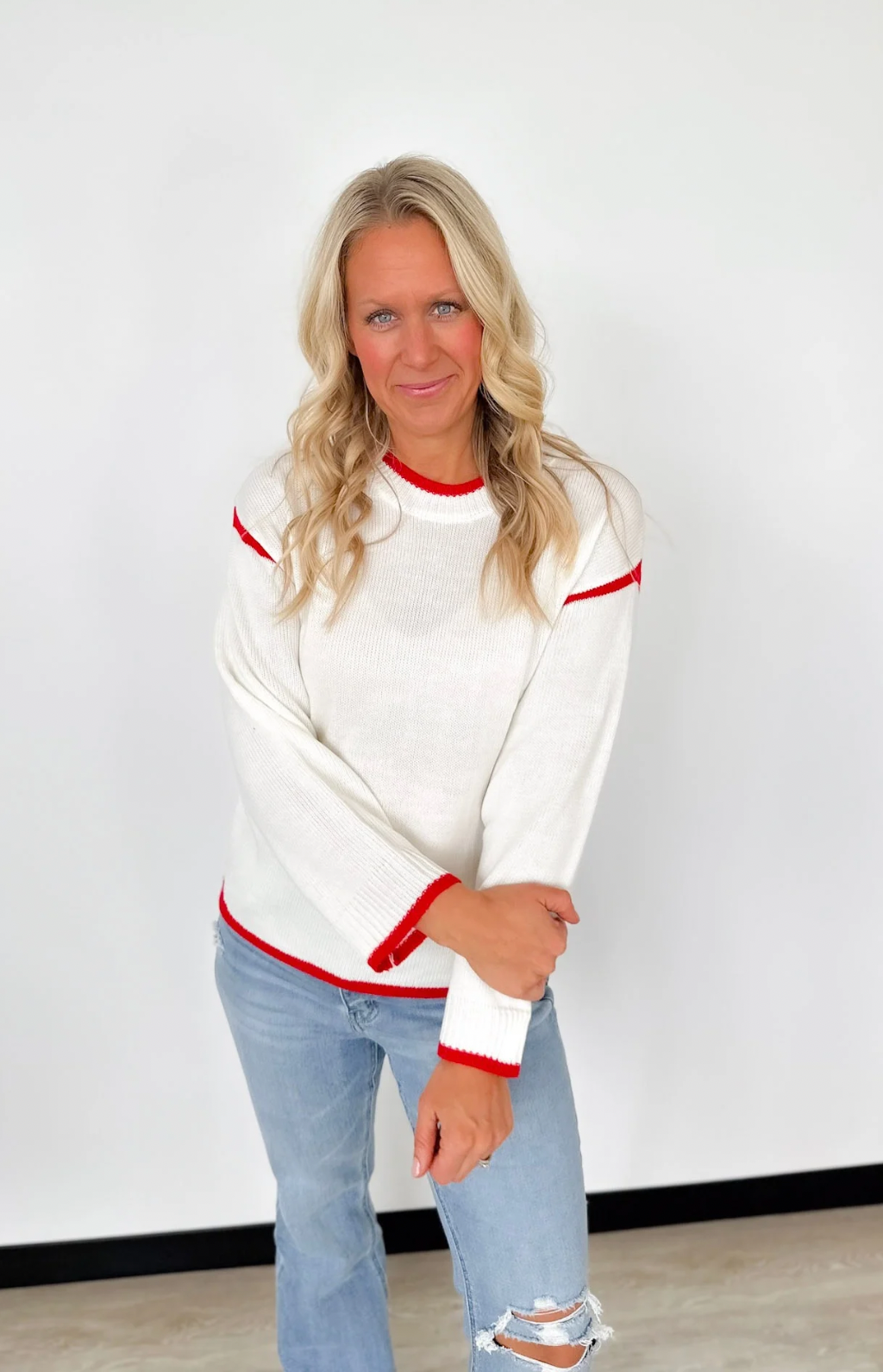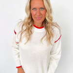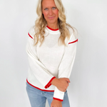 Cream Knit Sweater with Red Trim