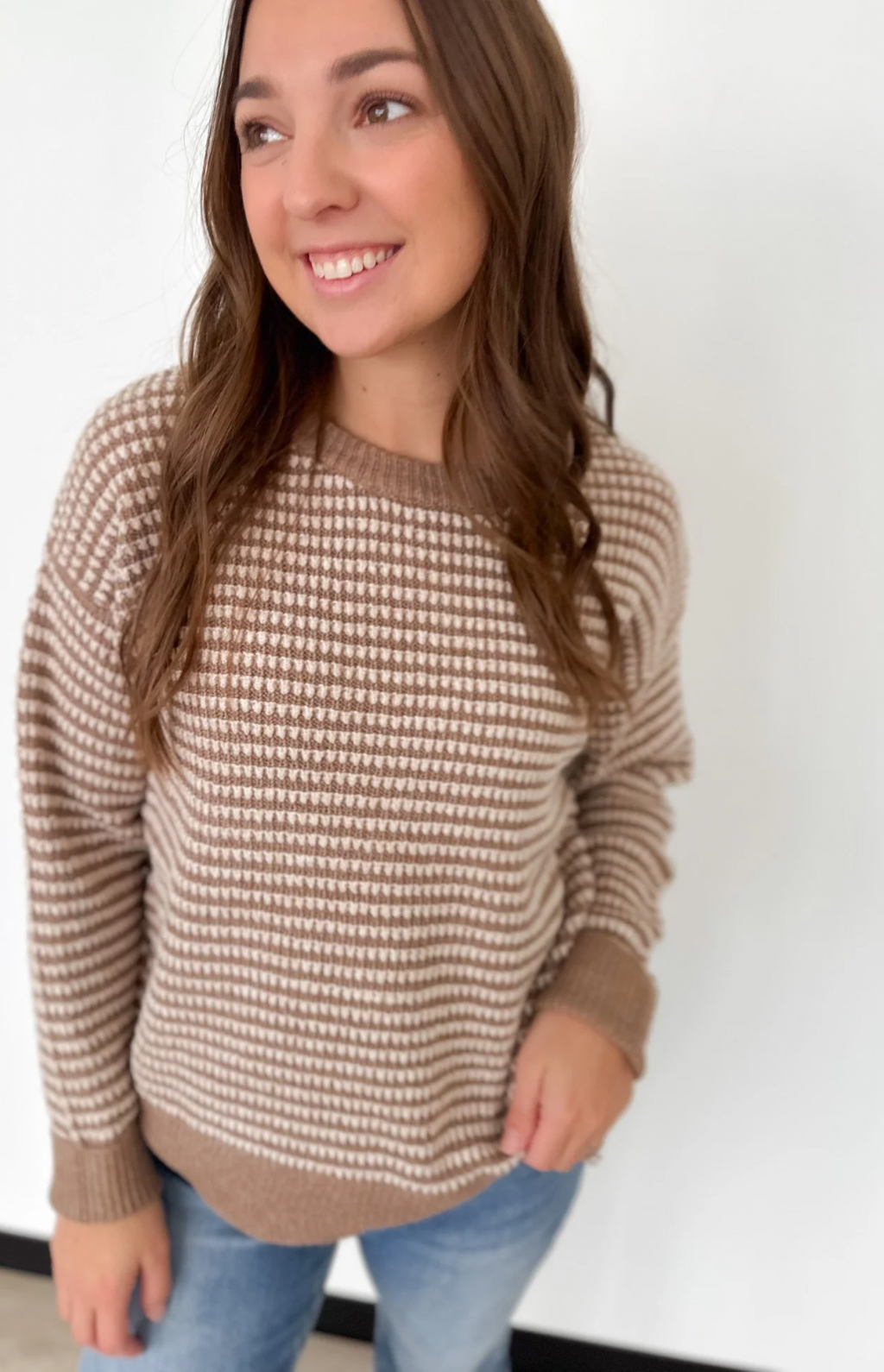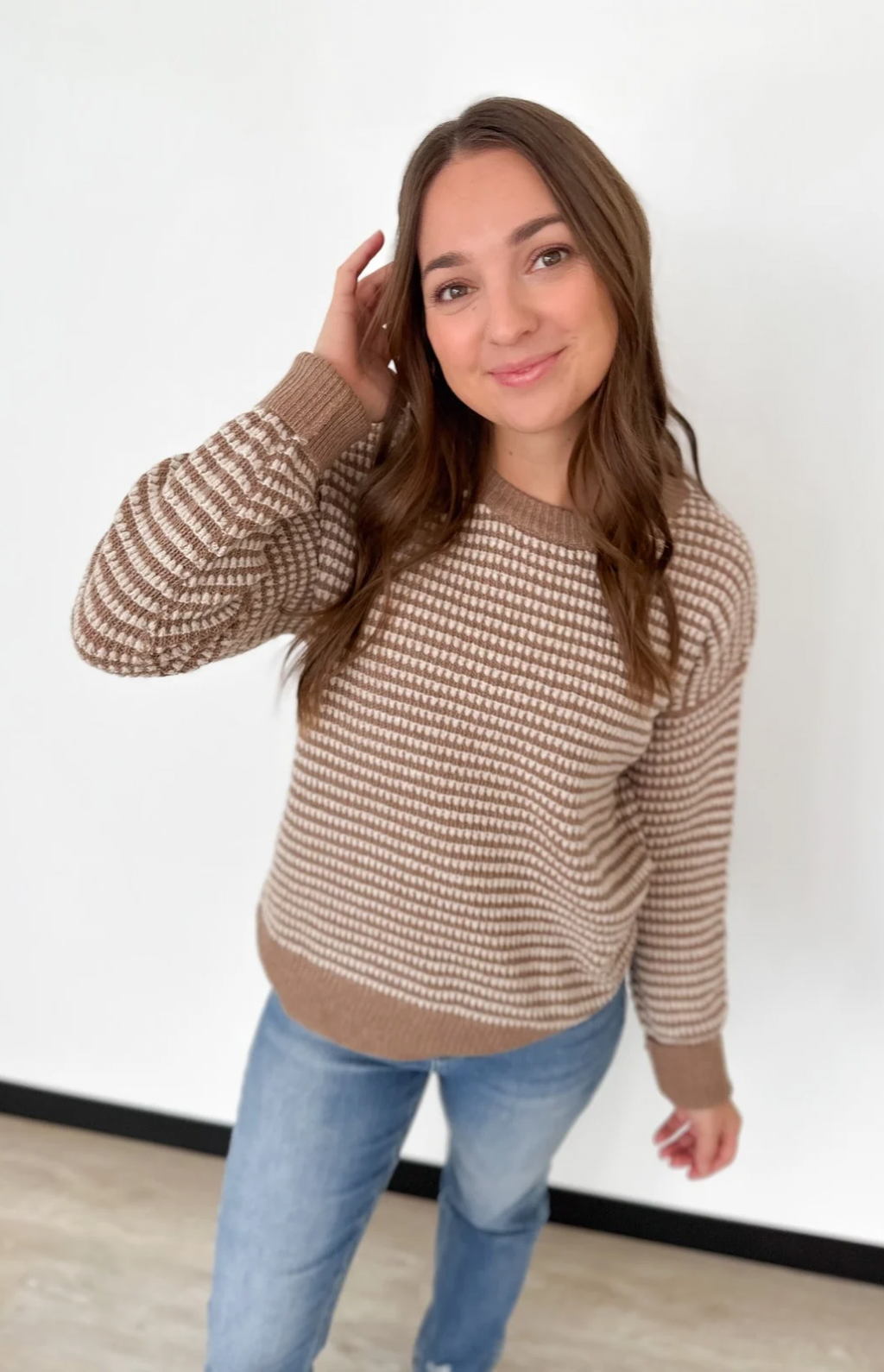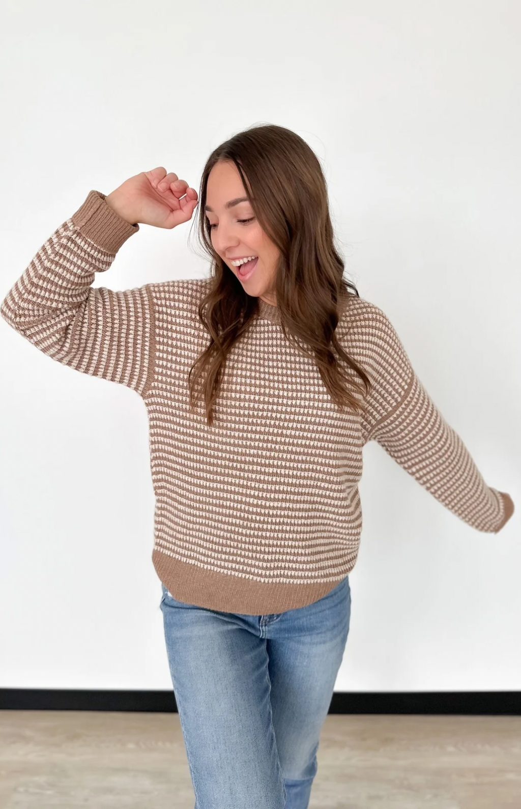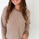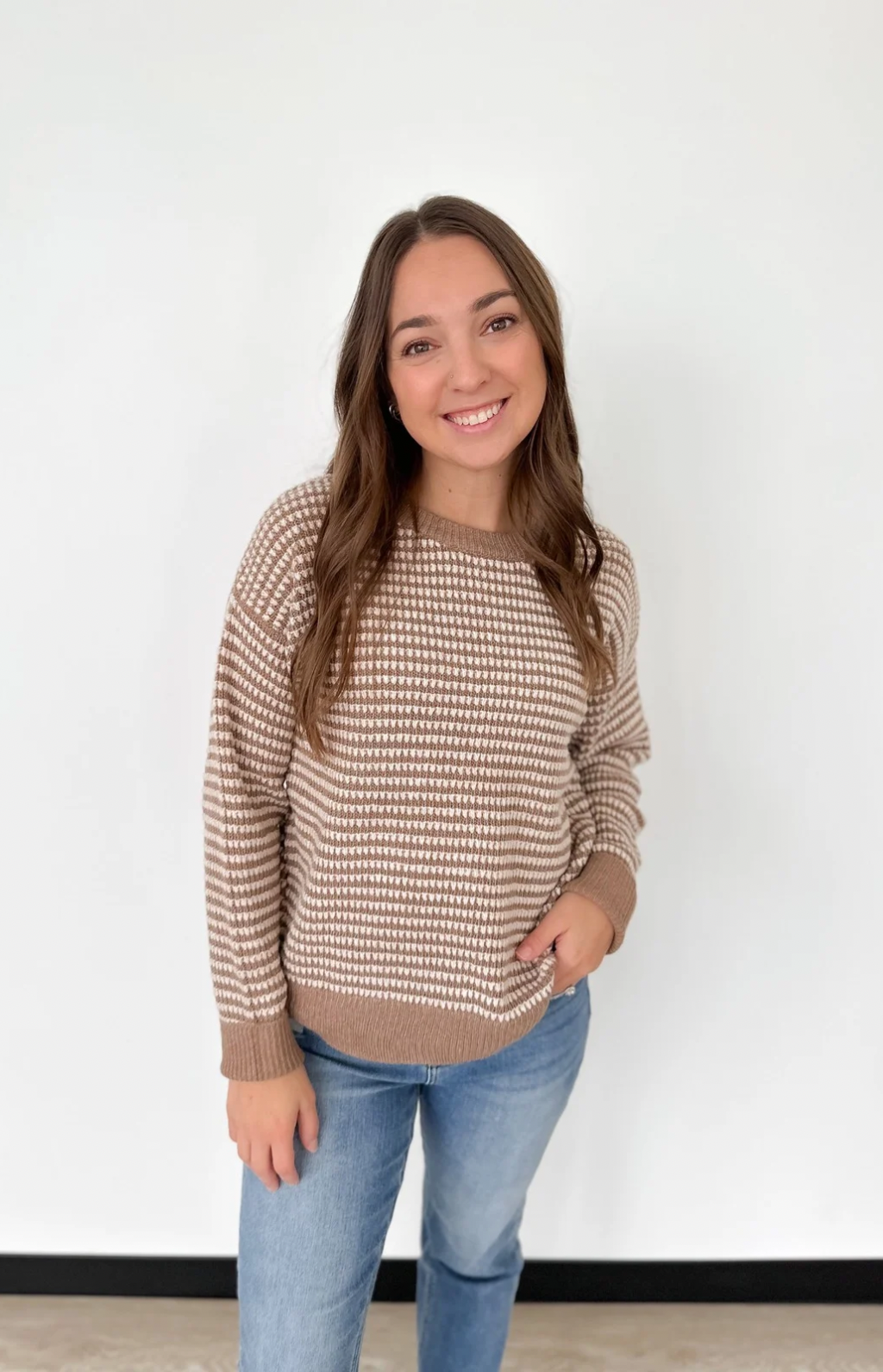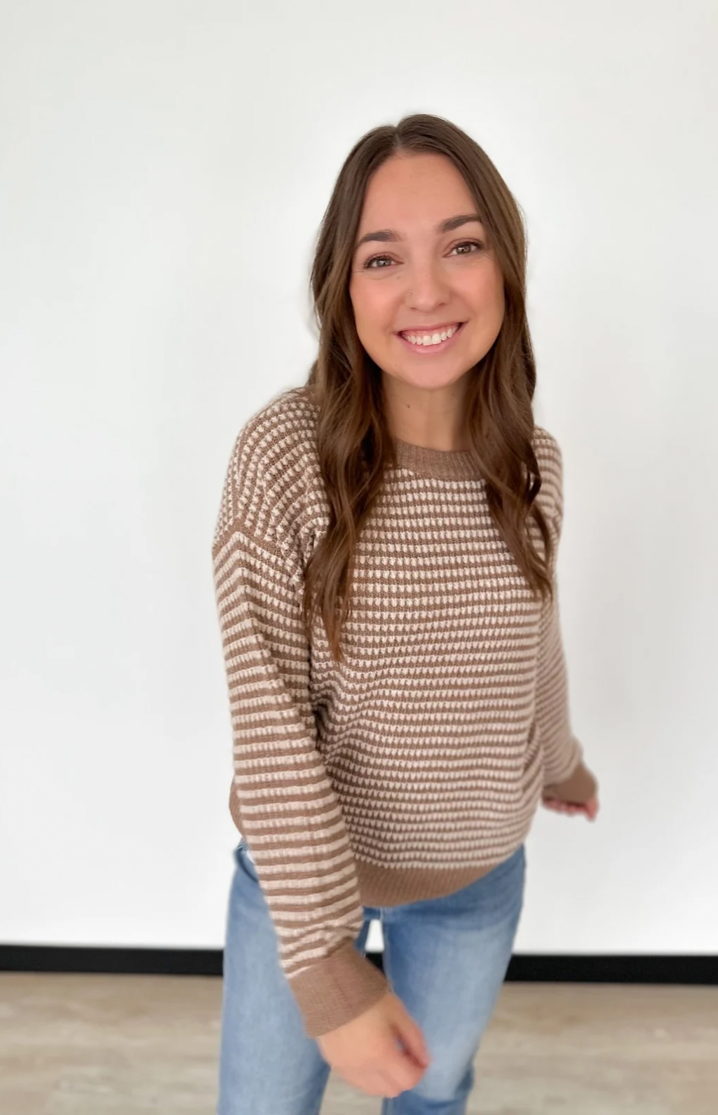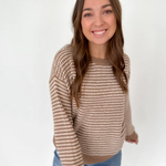 This cream and mocha striped sweater is the definition of effortless style. The relaxed fit gives it that cozy, lived-in feel, while the soft knit fabric makes it a go-to for cooler days. The neutral stripes add a timeless touch that pairs perfectly with denim or trousers. Easy to dress up or down, this is one of those pieces you’ll find yourself reaching for again and again—comfortable, classic, and effortlessly chic.
