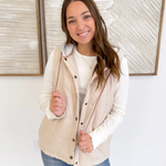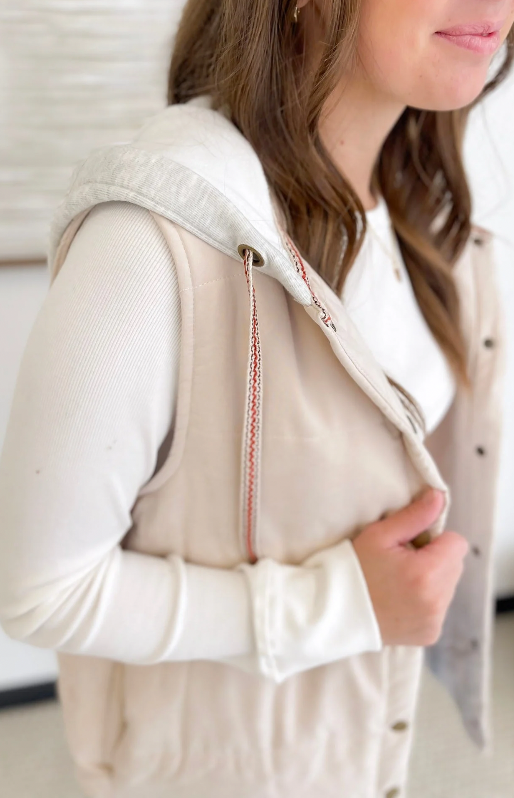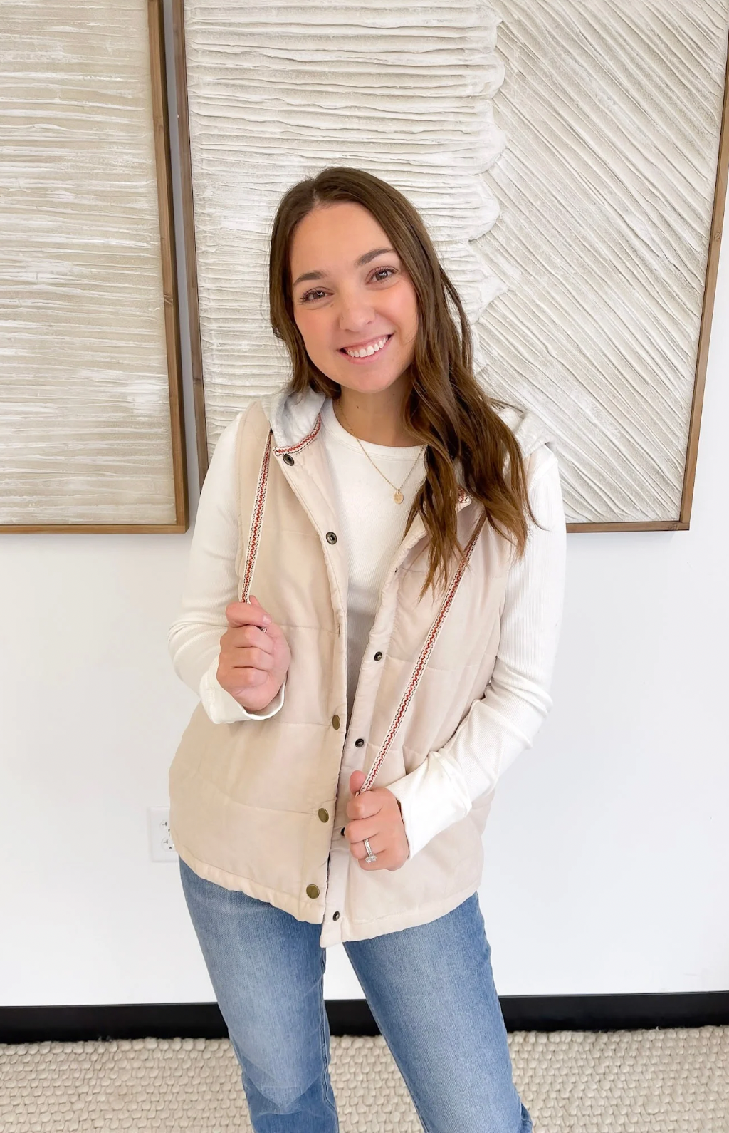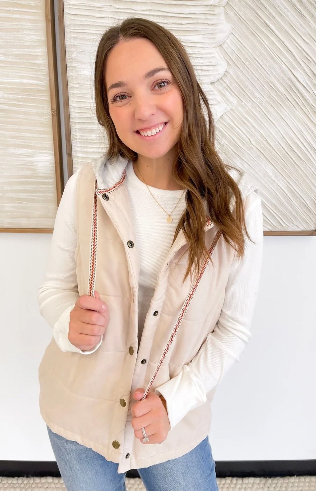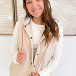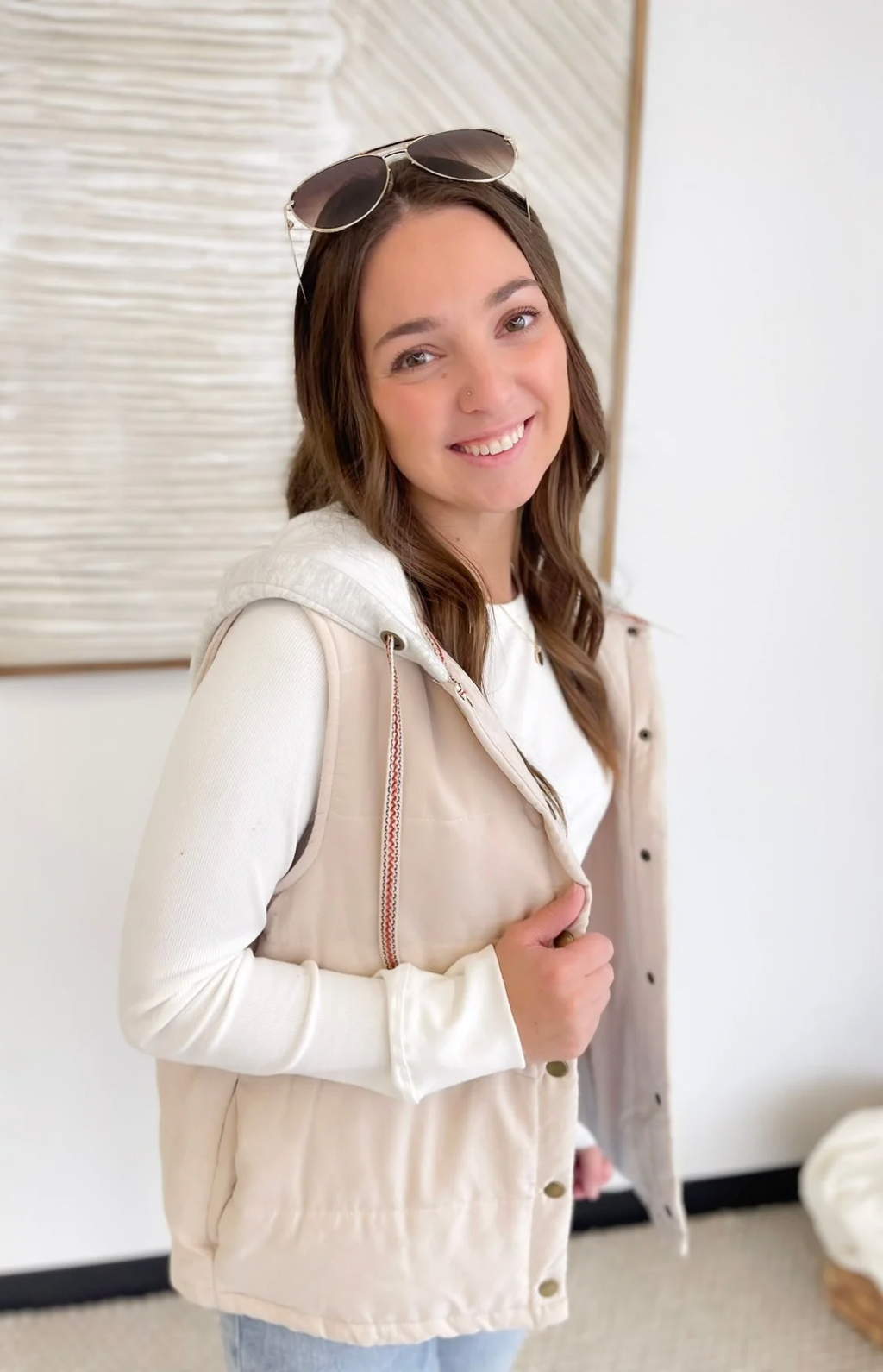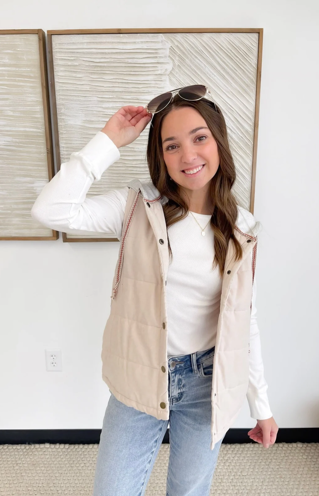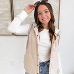 This cream button-up puffer vest with a hood is your go-to for layering when the temps start to dip. The padded design keeps you warm without adding bulk, while the hood adds an extra layer of protection for windy or rainy days. Its button-front closure gives it a polished touch, making it easy to style over sweaters, flannels, or long sleeves. Perfect for running errands, weekend walks, or casual outings—it’s the versatile layer your cold-weather wardrobe needs!