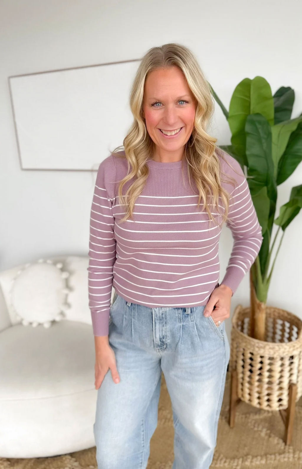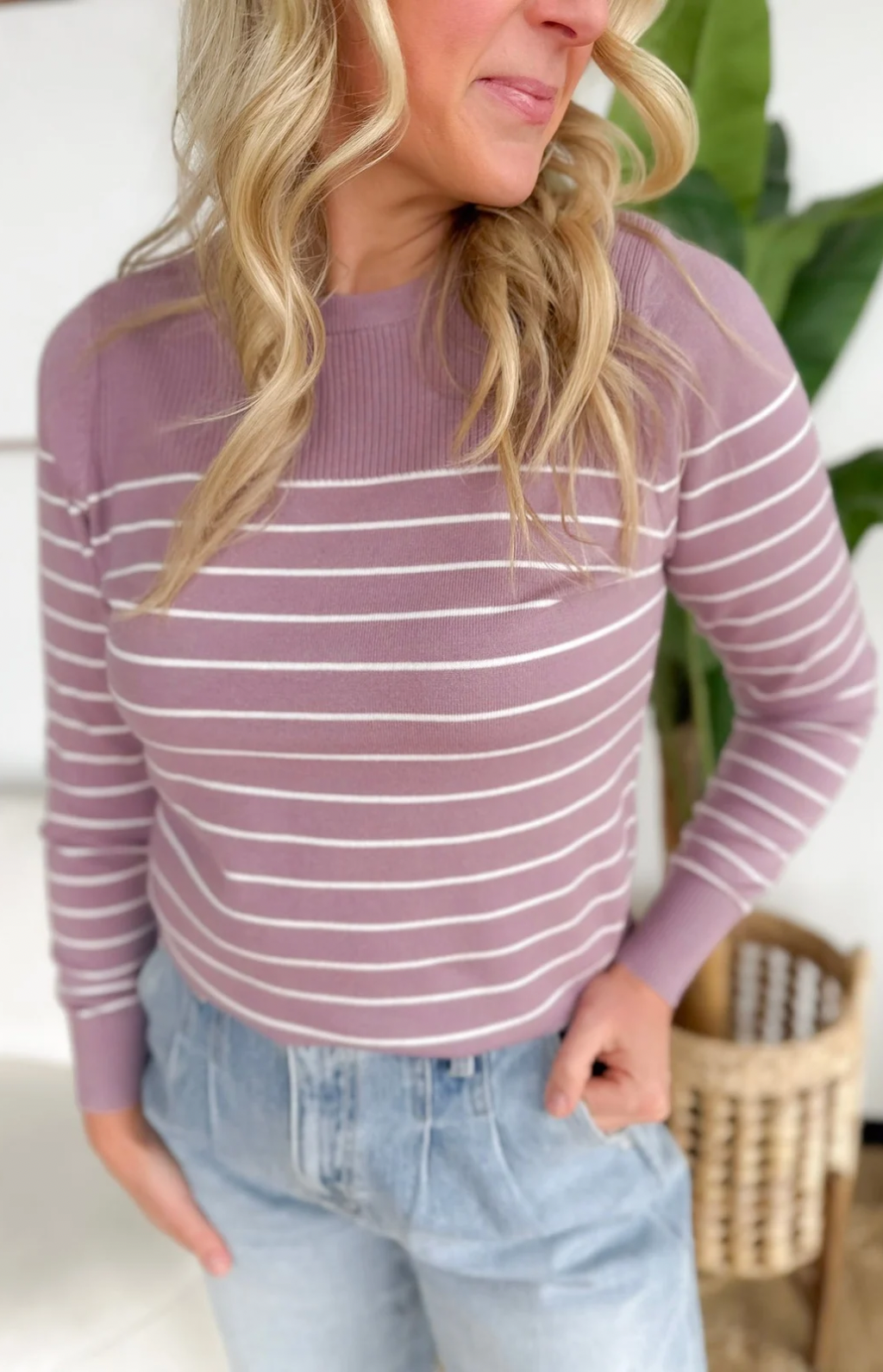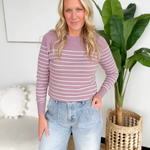 This dark lavender long-sleeve top with subtle white stripes is a soft, lightweight go-to for days when comfort and style need to coexist. The gentle knit feels cozy against your skin without weighing you down, making it perfect for layering or wearing on its own. The stripes add just the right touch of interest while keeping the look classic and easy to pair with your fav jeans. It’s relaxed enough for running errands or lounging at home, yet polished enough to look put-together in a hurry. A versatile piece that brings a soft pop of color to your everyday rotation.