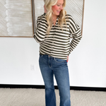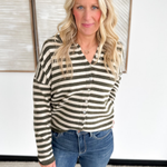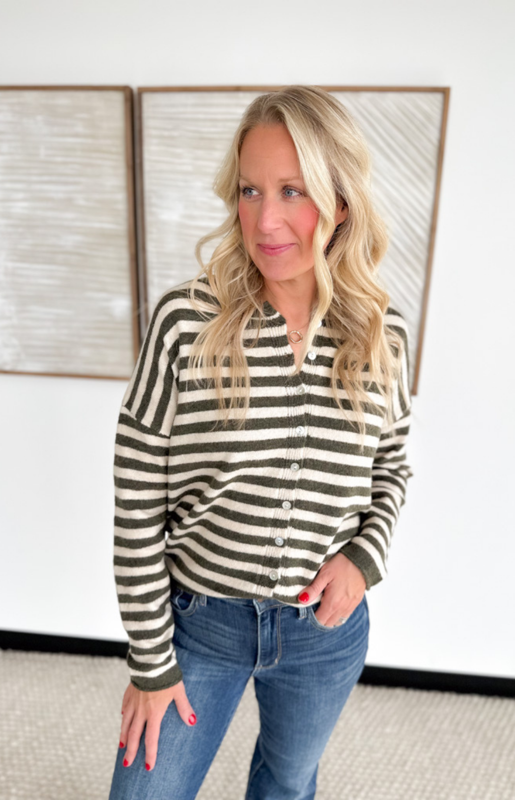 This dark olive and oatmeal striped knit sweater is a cozy, classic layer with a touch of timeless style. The button-front design makes it versatile—wear it closed as a top or open as a light cardigan. Soft, warm knit and relaxed fit ensure all-day comfort, while the subtle striped pattern adds a hint of visual interest without overwhelming your outfit. Perfect with jeans, leggings, or skirts, it’s an effortlessly stylish piece you’ll reach for season after season.