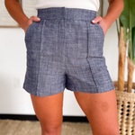 These denim blue shorts are your new go-to for easy, polished style. Designed with a flattering tailored fit, they feature a hidden clasp and zipper closure for a clean front, plus an elastic back waistband that gives you that just-right comfort without sacrificing structure. Two side pockets add function, while the soft fabric keeps things breezy. Pair with the matching blazer for a coordinated set or dress them down with a simple tee and sneakers.