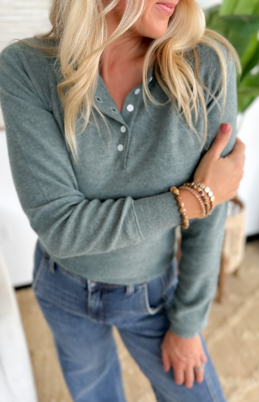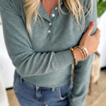 This lightweight knit top in dusty jade is the perfect everyday piece with a touch of charm. The soft, breathable fabric makes it easy to wear on its own or layered under jackets, while the button detailing on the front adds a subtle finish. Its long sleeves keep it versatile for year-round styling, whether you’re pairing it with jeans or tucking it into trousers for work. The muted jade hue brings a fresh pop of color that’s still neutral enough to mix with all your staples. Simple, flattering, and effortless—this top is made for busy days when you still want to look put-together.
