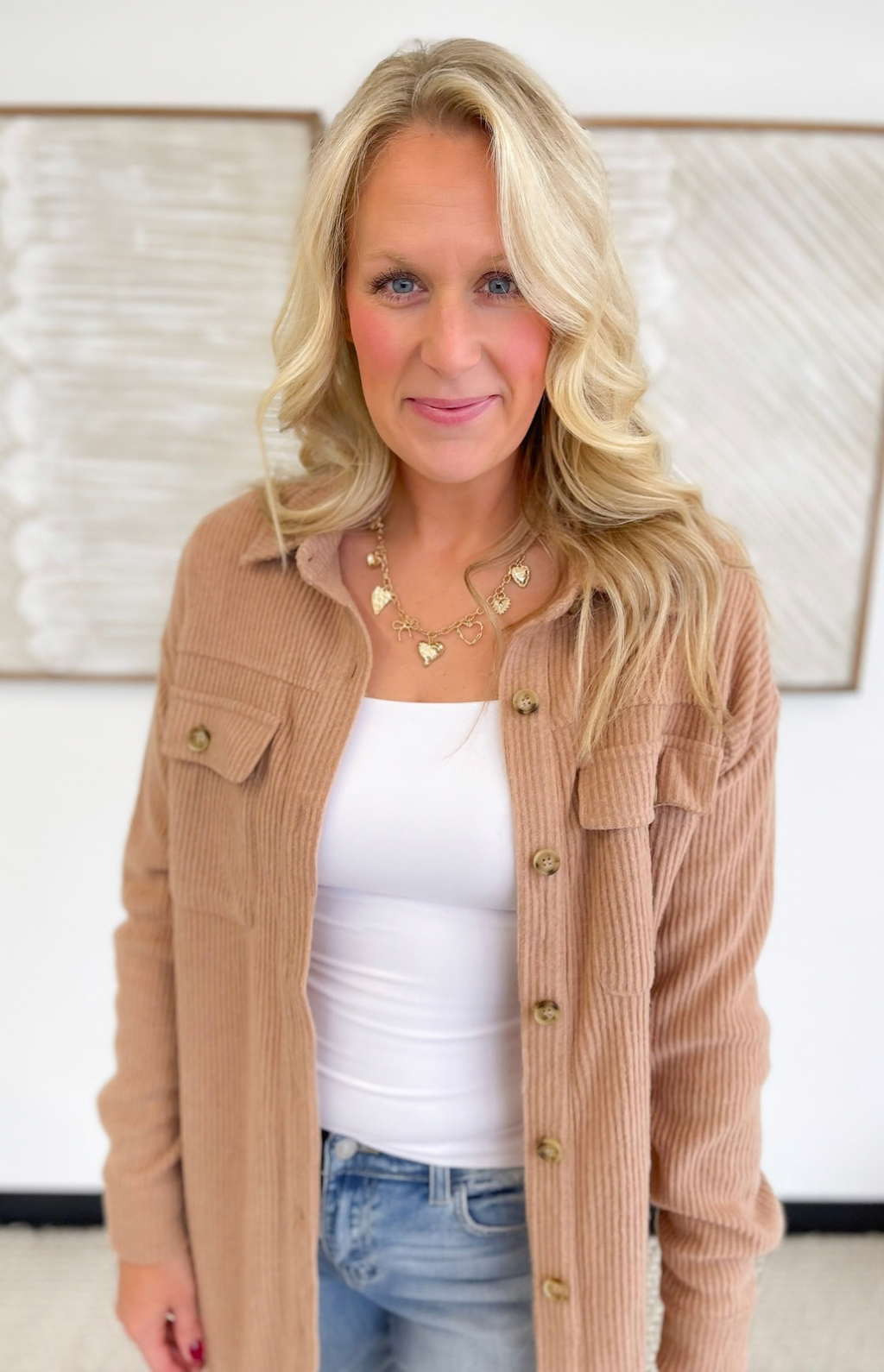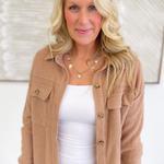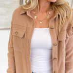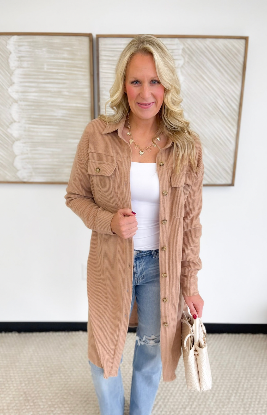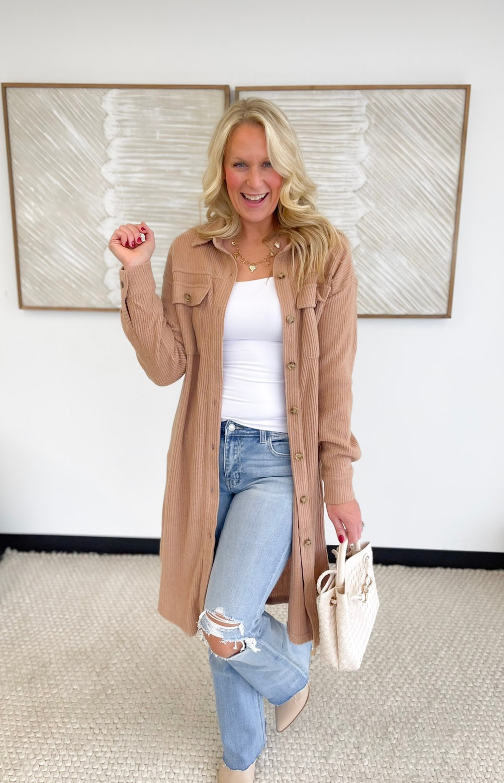 This dusty nude duster shacket is the perfect mix of cozy knitwear and effortless style. Its lightweight, button-front design makes it easy to layer over tees, tanks, or dresses, while the long duster length adds a touch of sophistication. Soft and relaxed, it drapes beautifully for a flattering silhouette, making it ideal for running errands, weekend outings, or casual office days. Neutral, versatile, and effortlessly chic, this shacket is a wardrobe essential you’ll reach for again and again.