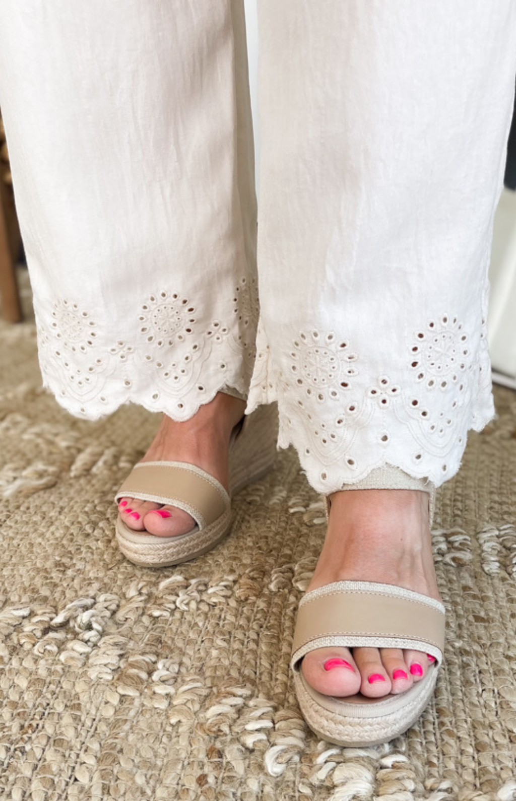 Breezy, effortless, and beautifully detailed—these natural-colored pants are your new go-to for laid-back days with a little extra flair. Made from a lightweight, flowy fabric, they feature a comfortable elastic waistband and eye-catching embroidery along the bottom hem for a touch of boho charm. Whether you're pairing them with the matching embroidered tie-front top or styling them with a simple tank, these pants deliver comfort and style in one easy piece. Runs true to size with a relaxed fit.