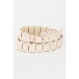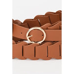 This belt introduces a unique faux leather braid link style. Discover the perfect balance of functionality and fashion.