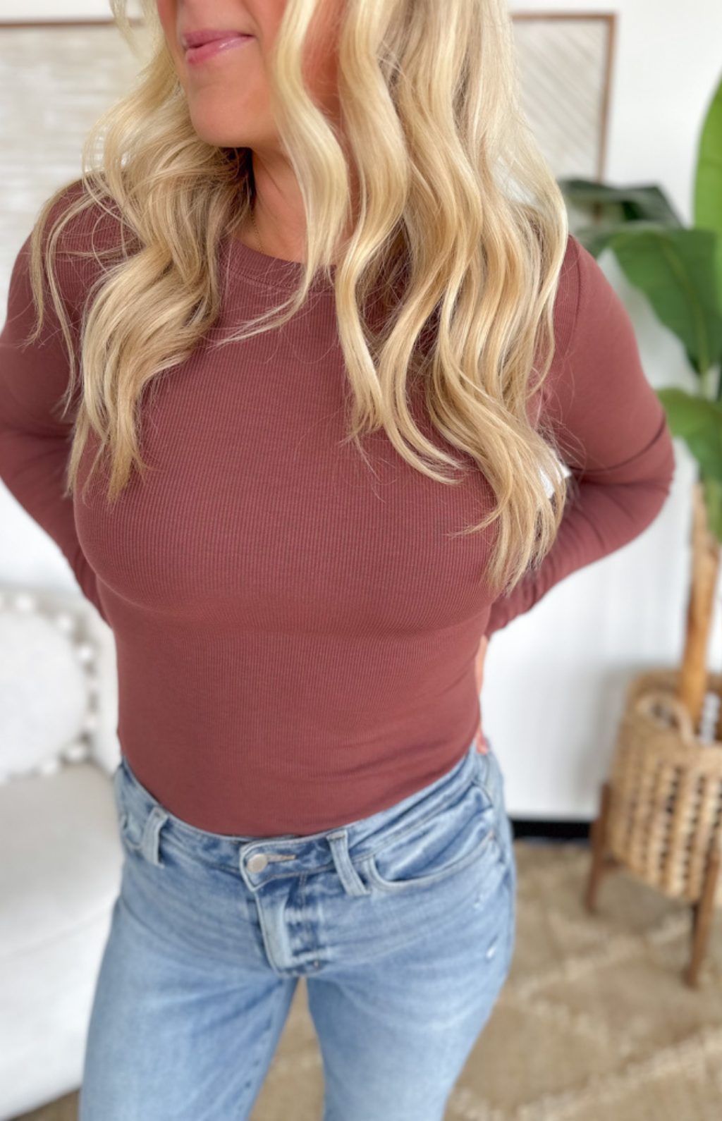 This round neck ribbed knit top is a wardrobe essential you’ll reach for on repeat. Designed with a fitted silhouette, it layers seamlessly under jackets or stands on its own for a sleek, polished look. The soft, stretchy knit moves with you while keeping its shape, making it perfect for both work and weekend wear. Available in rich burgundy red, it’s a versatile piece that works year-round.