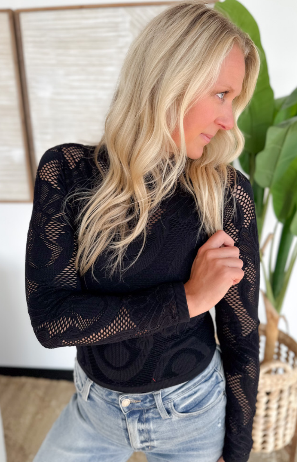 Add a little edge with this black floral mesh long sleeve mock neck top. Lightweight and semi-sheer, it’s the perfect statement layer that adds instant texture and depth to your outfit. With its fitted silhouette and delicate floral design, this piece is effortlessly feminine with a touch of bold. Style it under a denim jacket, layer it with a vest, or tuck it into wide-leg trousers—no matter how you wear it, it’s sure to turn heads.