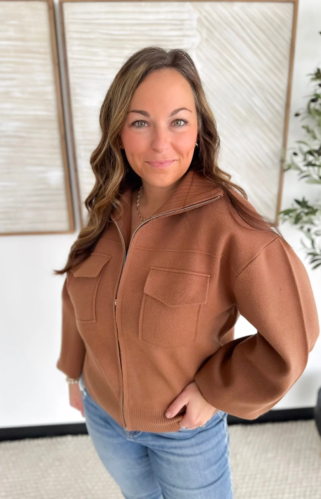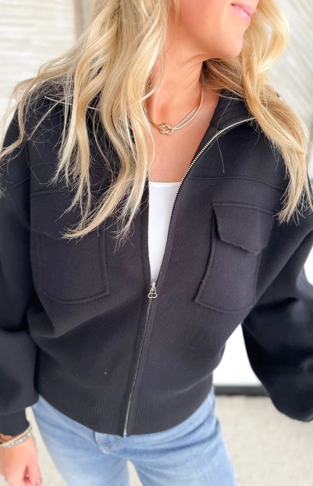 This soft knit bomber jacket combines casual comfort with a polished edge. The front zip closure and collared neckline give it a structured, classic look, while the chest pockets add subtle detail and functionality. Made from cozy, soft-knit fabric, it’s perfect for layering over tees or lightweight sweaters on cooler days. Versatile enough for errands, weekend outings, or casual workdays, this jacket brings effortless style and all-day comfort to your wardrobe.