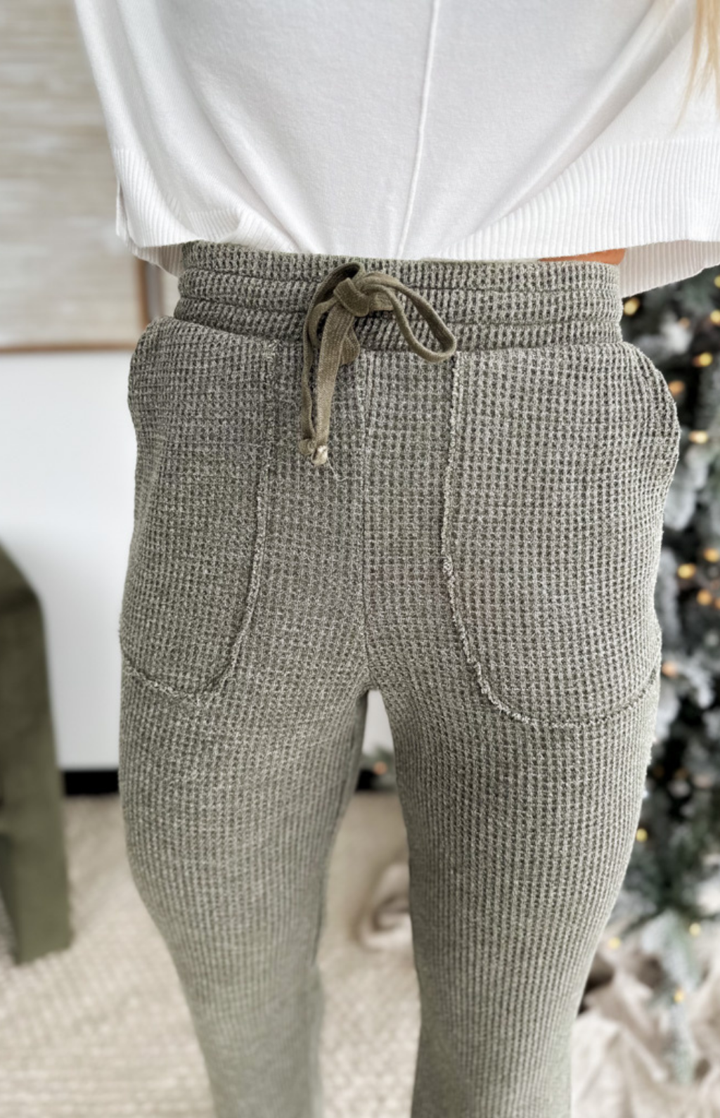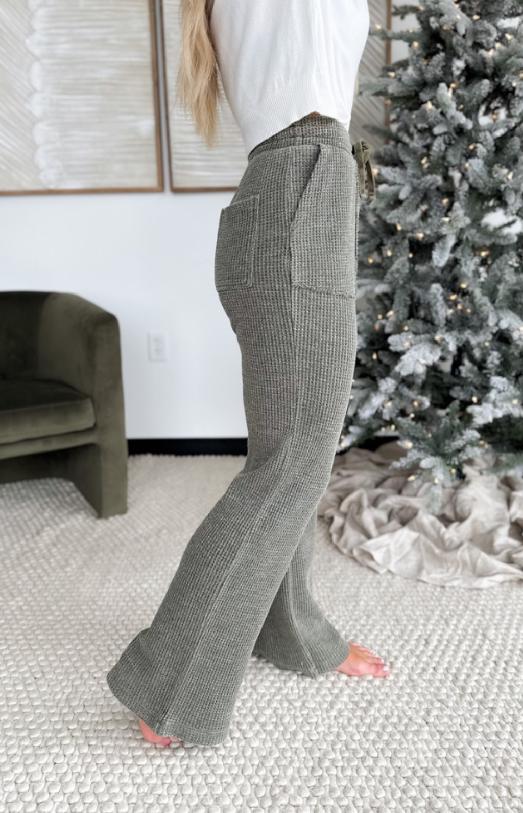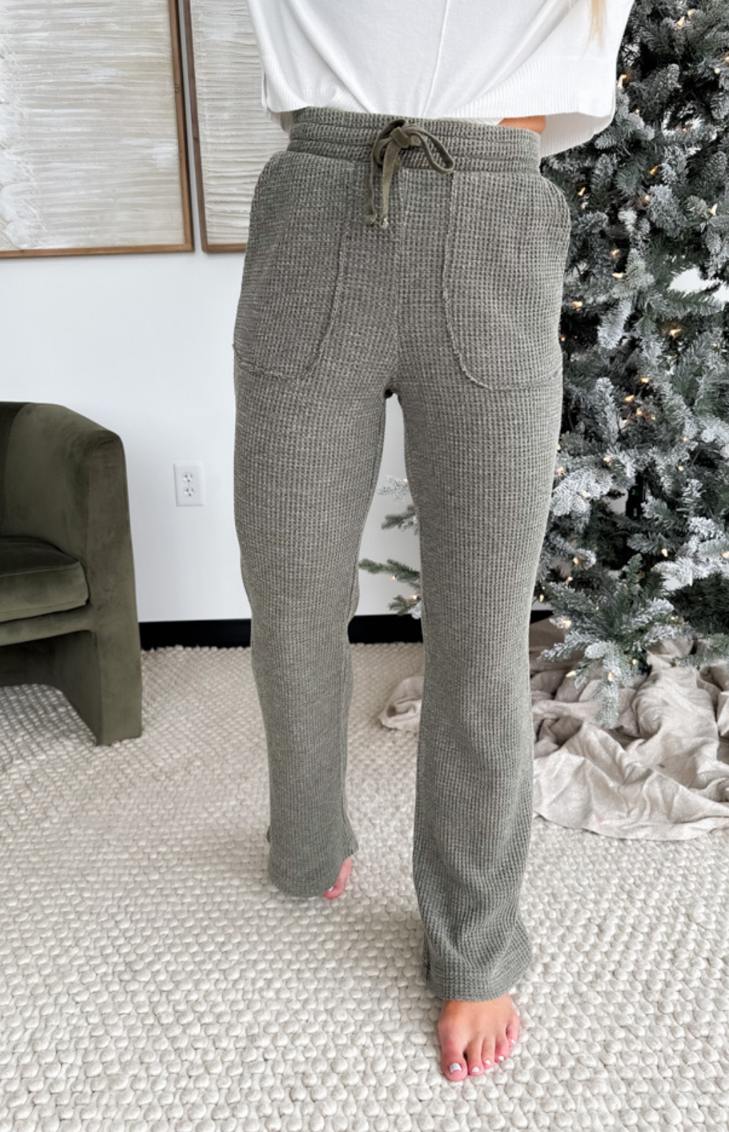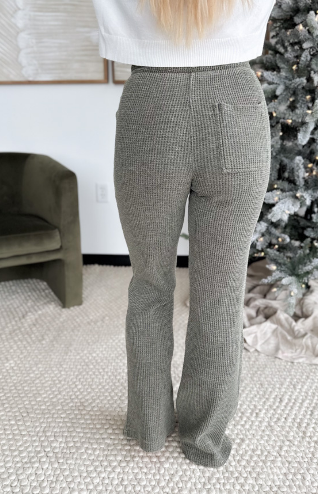These green waffle knit pants are the ultimate in cozy, casual style. The high-rise elastic waistband provides a flattering, comfortable fit, while the wide-leg silhouette offers ease of movement and a relaxed vibe. Soft, textured waffle knit keeps you warm and comfy, making them perfect for lounging at home, running errands, or casual outings. Effortless to style with a simple tee or sweatshirt, these pants are a must-have for comfort-focused, everyday chic.