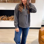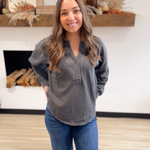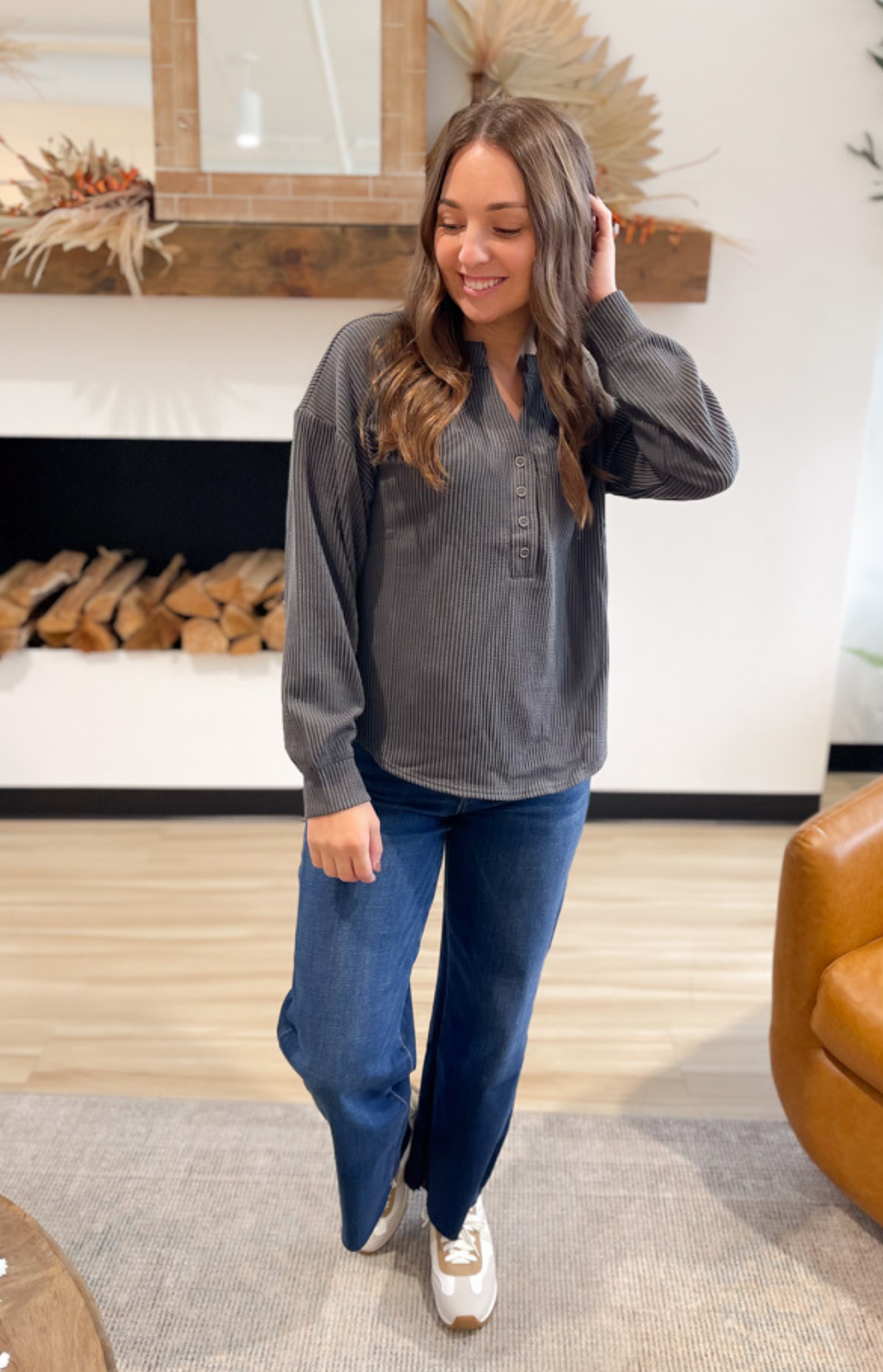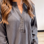 This grey ribbed long sleeve henley top is a comfy classic with a touch of charm. The ribbed knit gives it a flattering fit that moves with you, while the button detail at the neckline adds that signature henley style. Its soft grey tone makes it an easy neutral you can layer under jackets, cardigans, or wear on its own with jeans or joggers. Casual yet polished, it’s the kind of top that works just as well for busy days on the go as it does for cozy nights in. Effortless, versatile, and always in style.