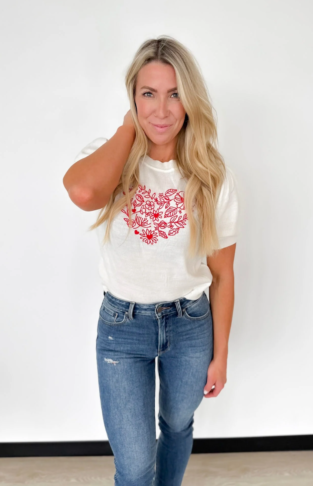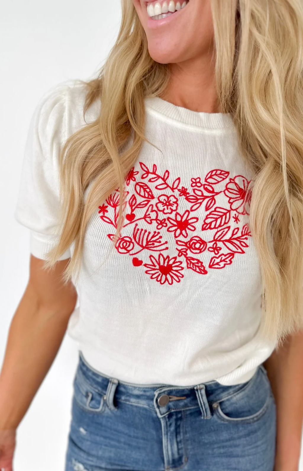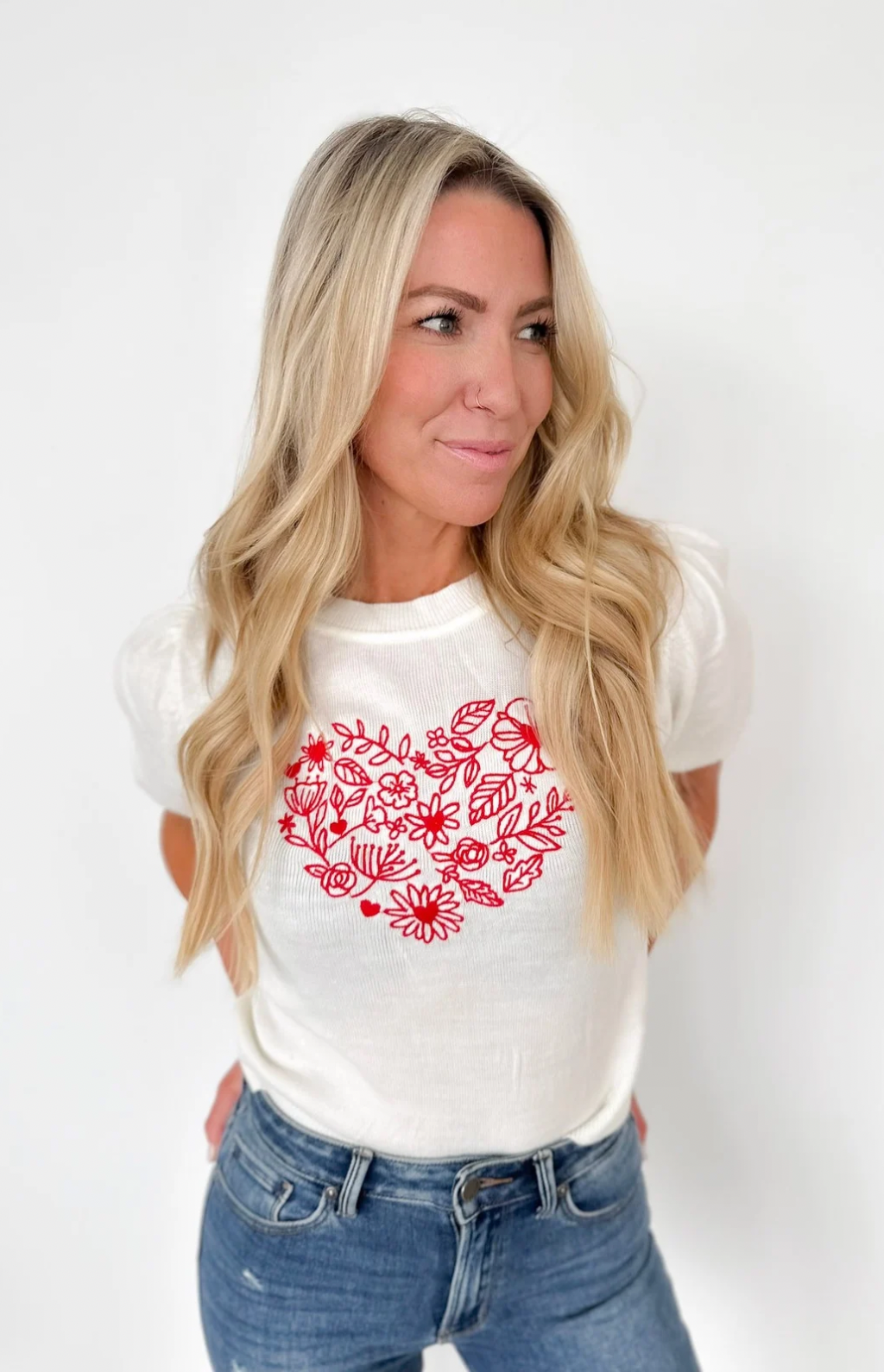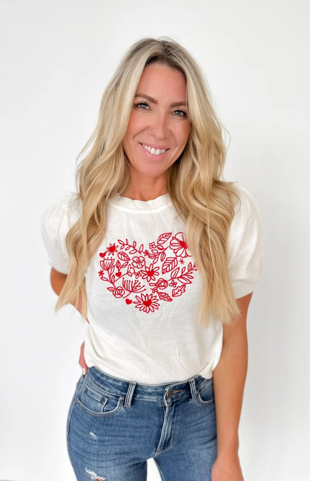 This ivory puff-sleeve top is pure sweetness with a playful twist—perfect for days when you want to feel cute without overthinking a thing. The lightweight knit keeps it comfy and breezy, while the soft puff sleeves add just the right touch of femininity. The red floral stitching in the shape of a heart is the star of the show—sweet, special, and such a mood-booster. It’s one of those tops that pairs effortlessly with denim, makes you feel instantly put-together, and brings a little joy into your busy day. You’ll reach for it way more than you expect.