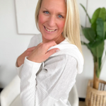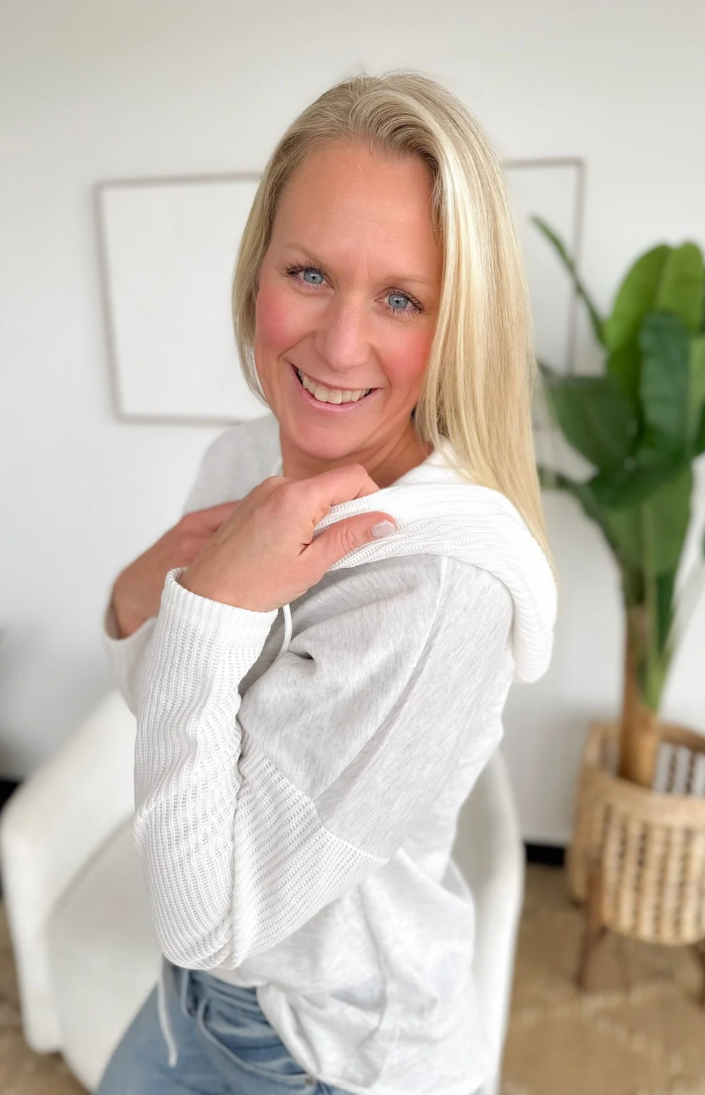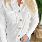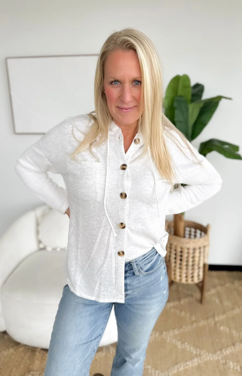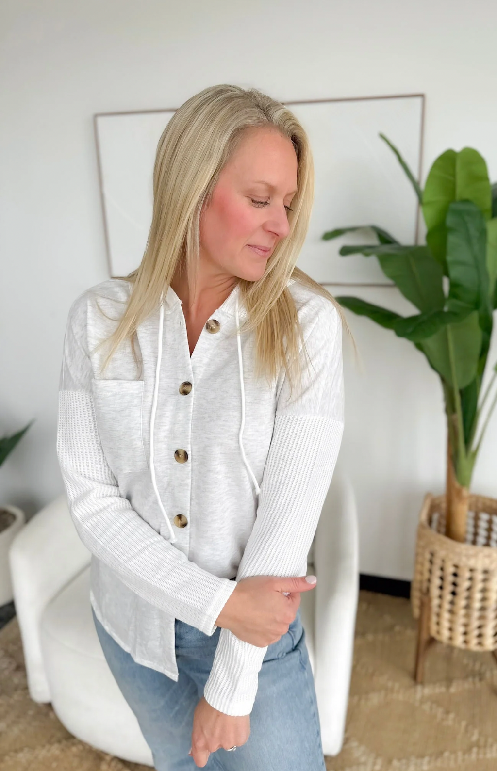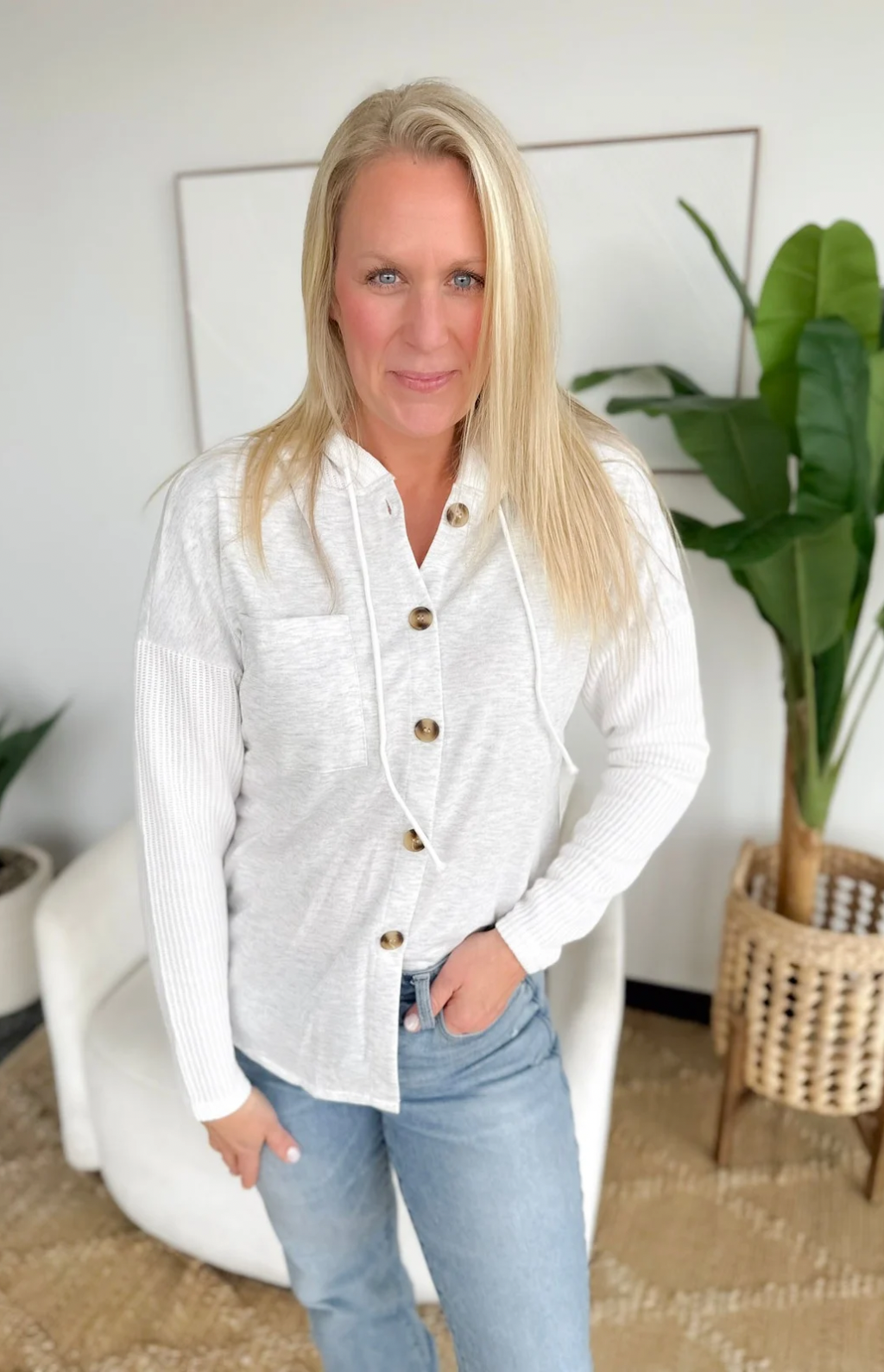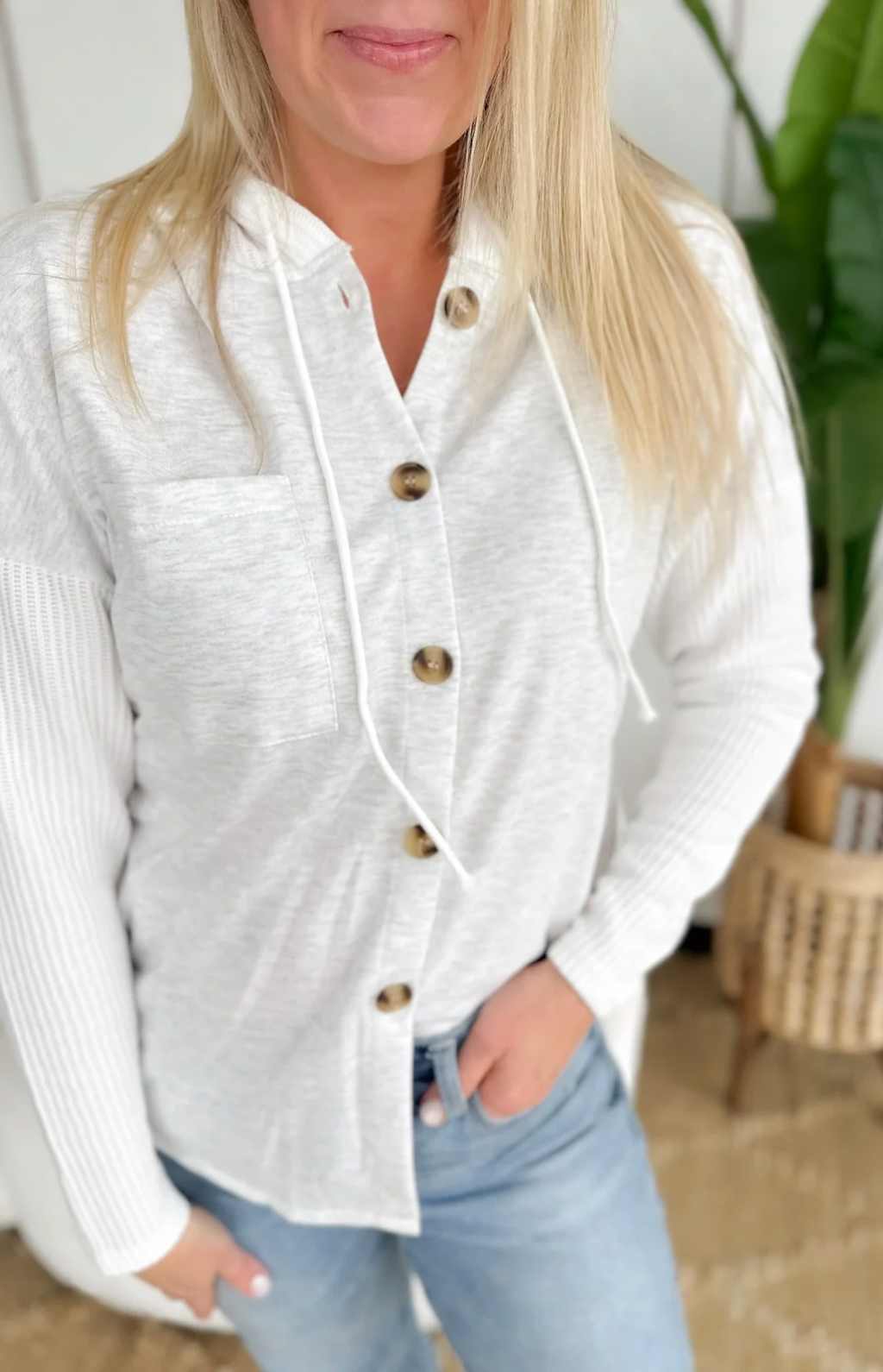 This button-up shacket is the perfect layering piece for those in-between days when you want cozy without the bulk. The contrast grey and white knit sleeves and hood add a soft, comfortable feel while giving it a stylish, elevated look.