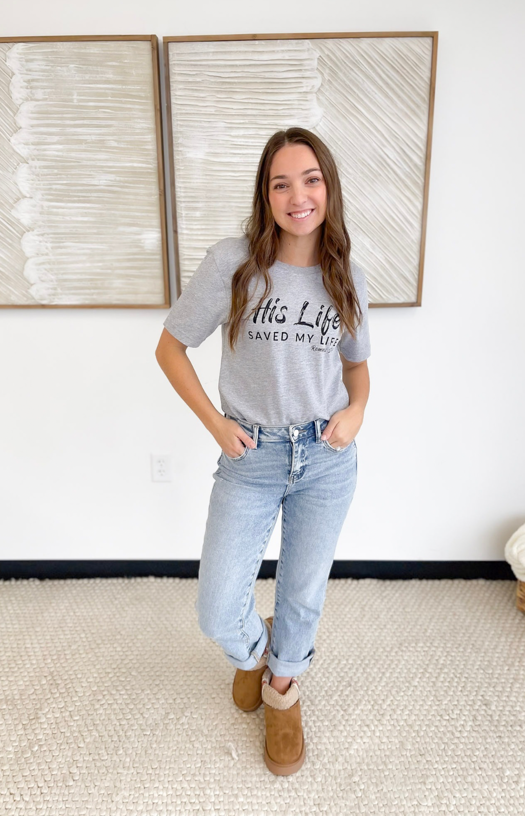 This grey tee carries a powerful message you’ll love wearing close to your heart. The front reads “He Gave His Life, Saved My Life. Romans 5:8,” making it a bold, faith-filled reminder for your everyday walk. Soft and easy with a relaxed fit, it’s perfect for busy mornings, errands, or weekend lounging. Pair it with jeans, leggings, or a cozy cardigan for an effortless look that feels both meaningful and comfortable.