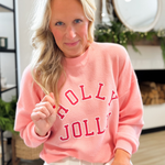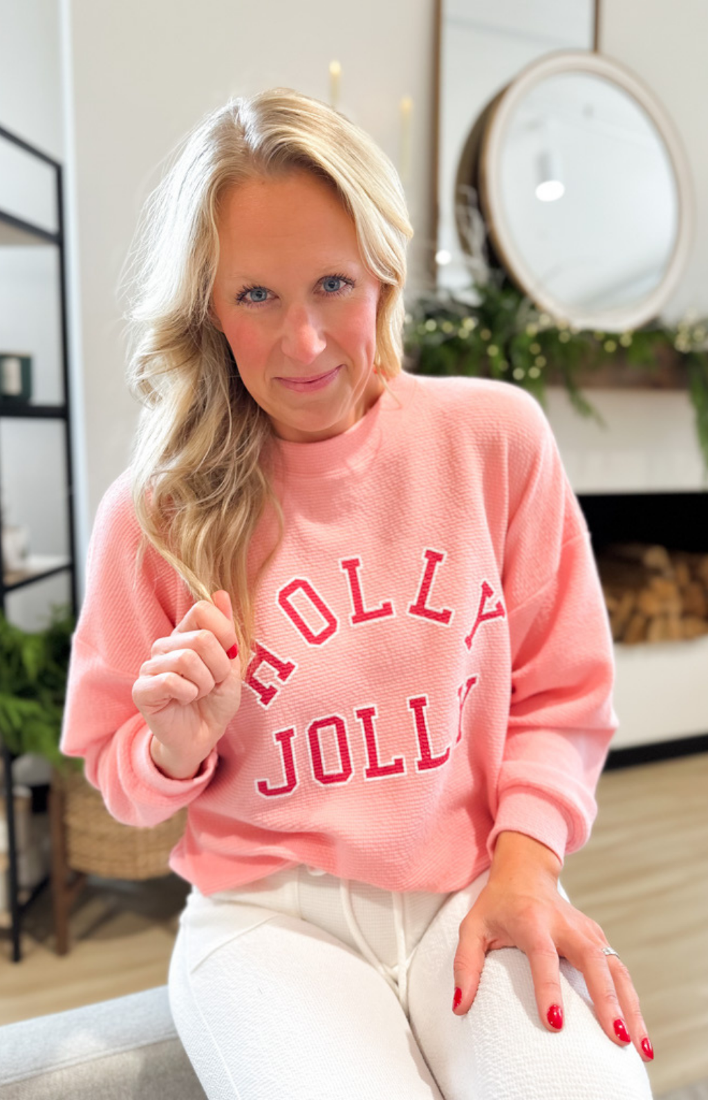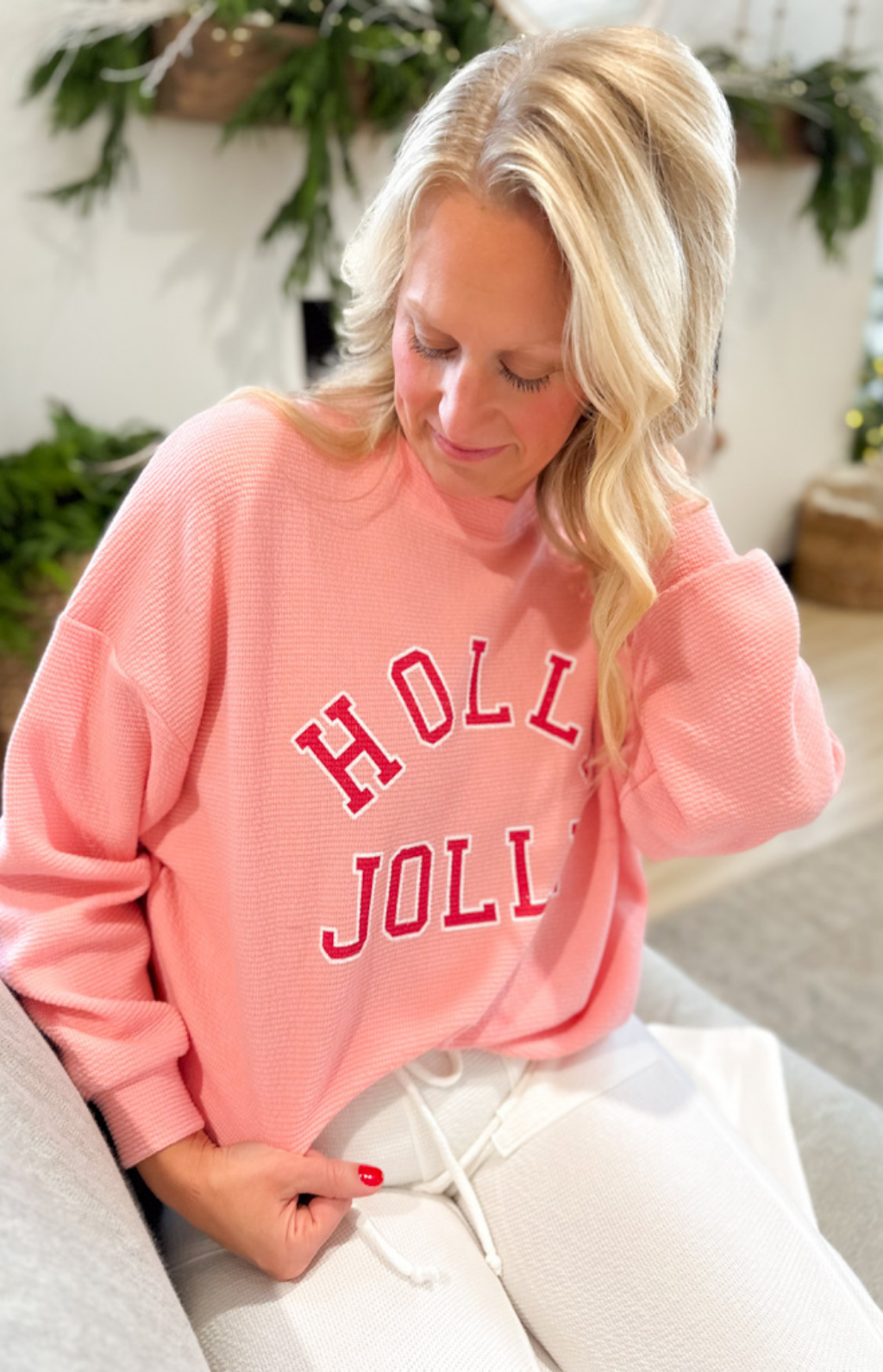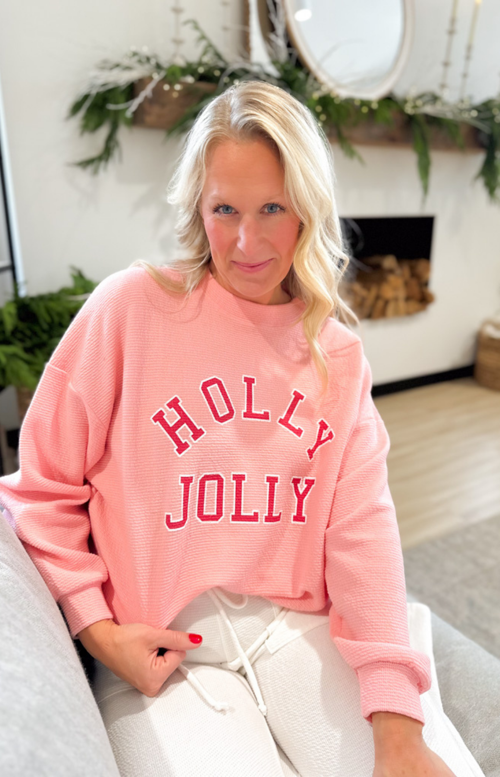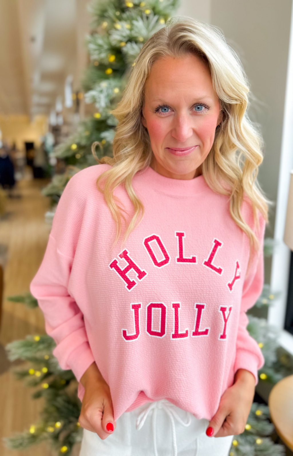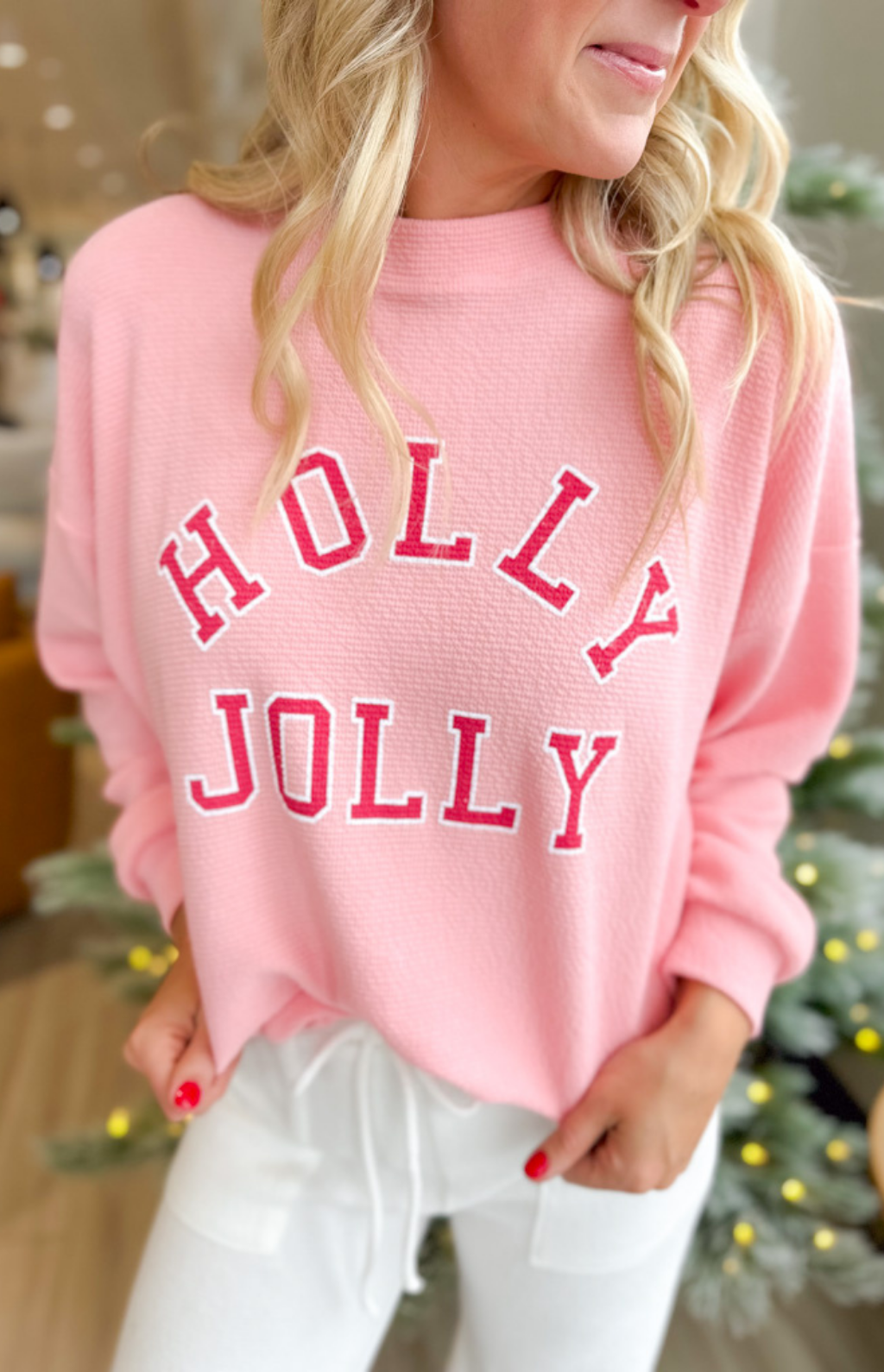 This pink waffle knit crewneck sweatshirt is the perfect mix of cozy and festive. The soft, textured waffle fabric gives it that comfy, lived-in feel, while the “Holly Jolly” graphic on the front adds a playful pop of holiday cheer. With its relaxed fit and cheerful color, it’s ideal for everything from wrapping gifts to sipping cocoa by the fire. Pair it with jeans or leggings for an effortlessly cute and spirited holiday look that’s full of joy and comfort.