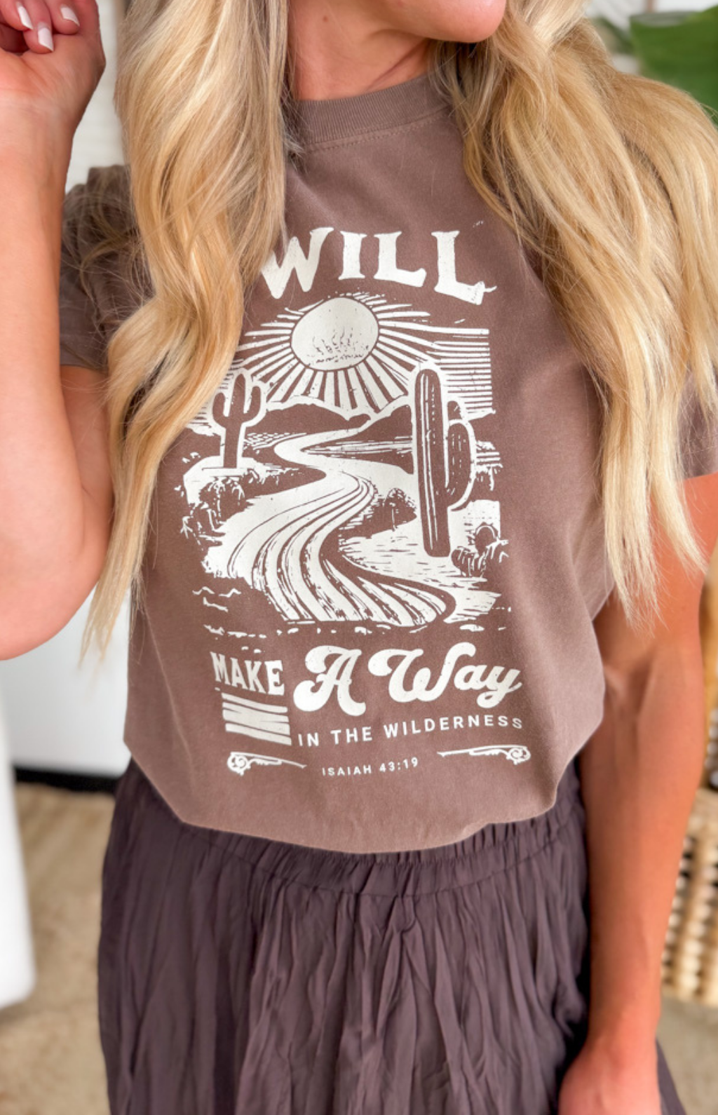 This relaxed fit brown tee is more than just comfy—it's a reminder of God's promise. Featuring a classic crew neckline and the inspiring words from Isaiah 43:19, 'I will make a way in the wilderness,' it's the perfect blend of cozy and encouraging. Wear it as a daily dose of hope, or gift it to someone who could use a little reminder that God always makes a way.