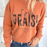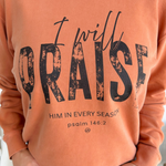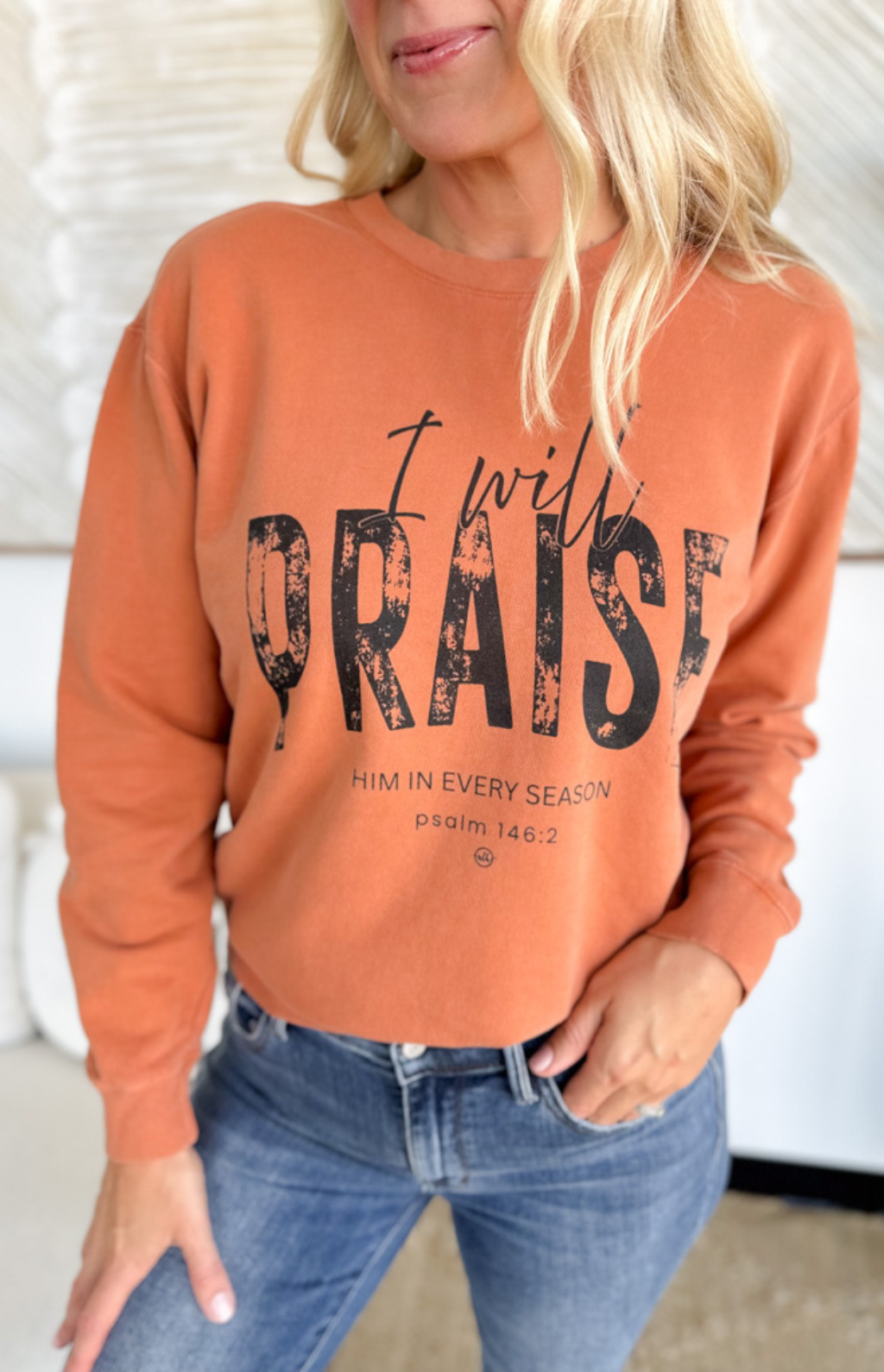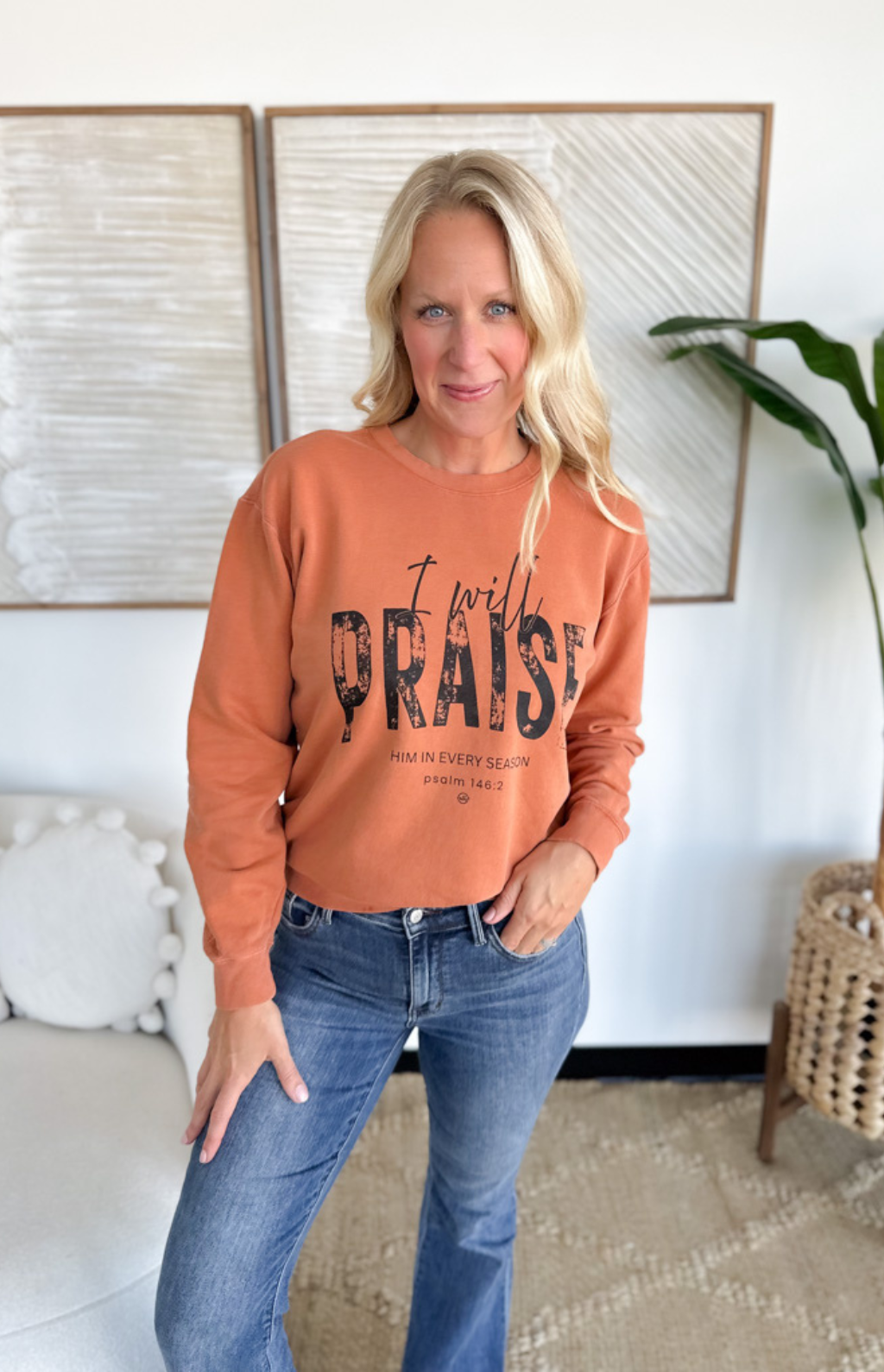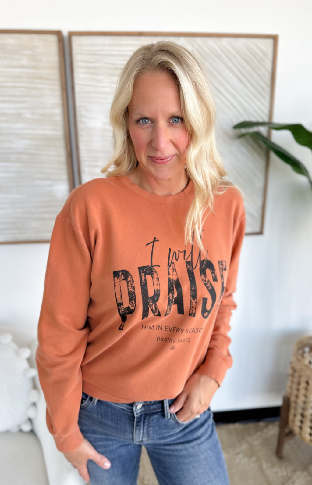 This burnt orange crewneck pullover is cozy, uplifting, and full of meaning. The soft knit and relaxed fit make it an easy everyday layer, while the rich burnt orange hue adds a warm, seasonal touch. Across the front, the words “I will praise Him in every season” serve as a sweet reminder of faith and gratitude. Perfect with jeans, leggings, or joggers, it’s a versatile piece that keeps you comfortable while sharing a message that matters. Cozy, encouraging, and effortlessly stylish—this pullover will be a favorite in every season.