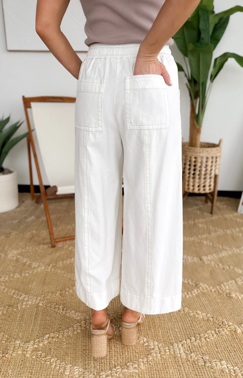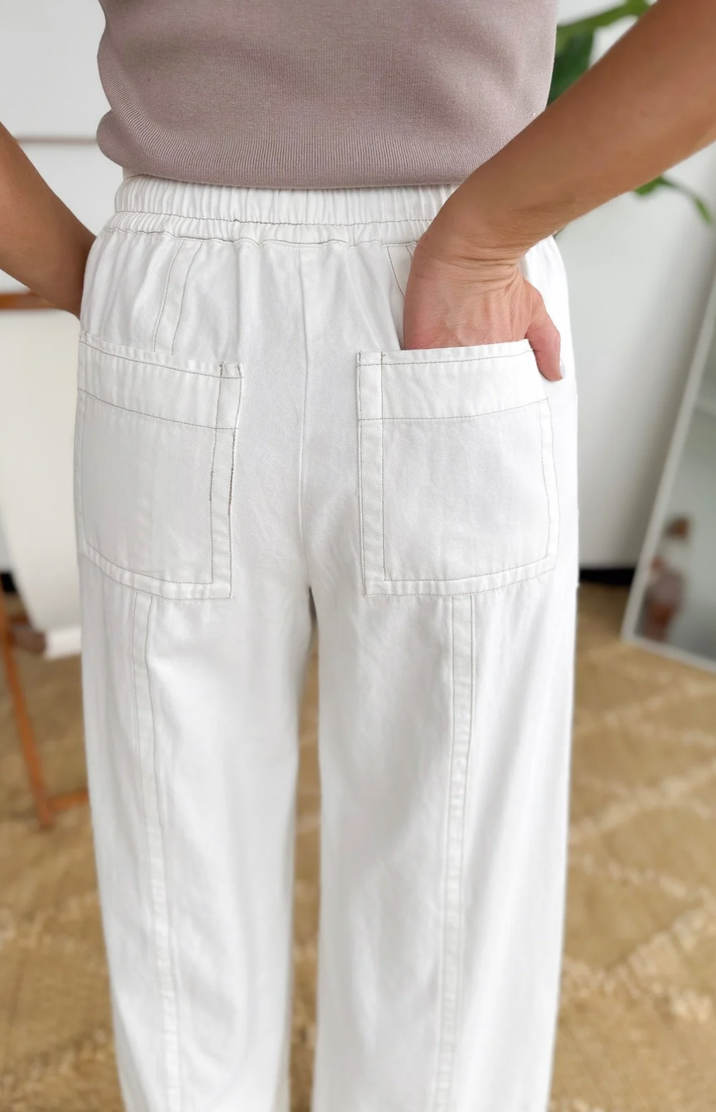 These ivory wide-leg pants are effortless chic with a trendy twist. The elastic waistband makes them super easy to slip on and keeps you comfy all day, while the wide-leg silhouette gives you that flowy, put-together look without any effort. The brown stitching trim adds a subtle, stylish detail that elevates the whole vibe. Pair them with a simple tee or a fitted top for a polished outfit in seconds—perfect for busy mornings when you want to feel stylish without trying too hard.
