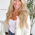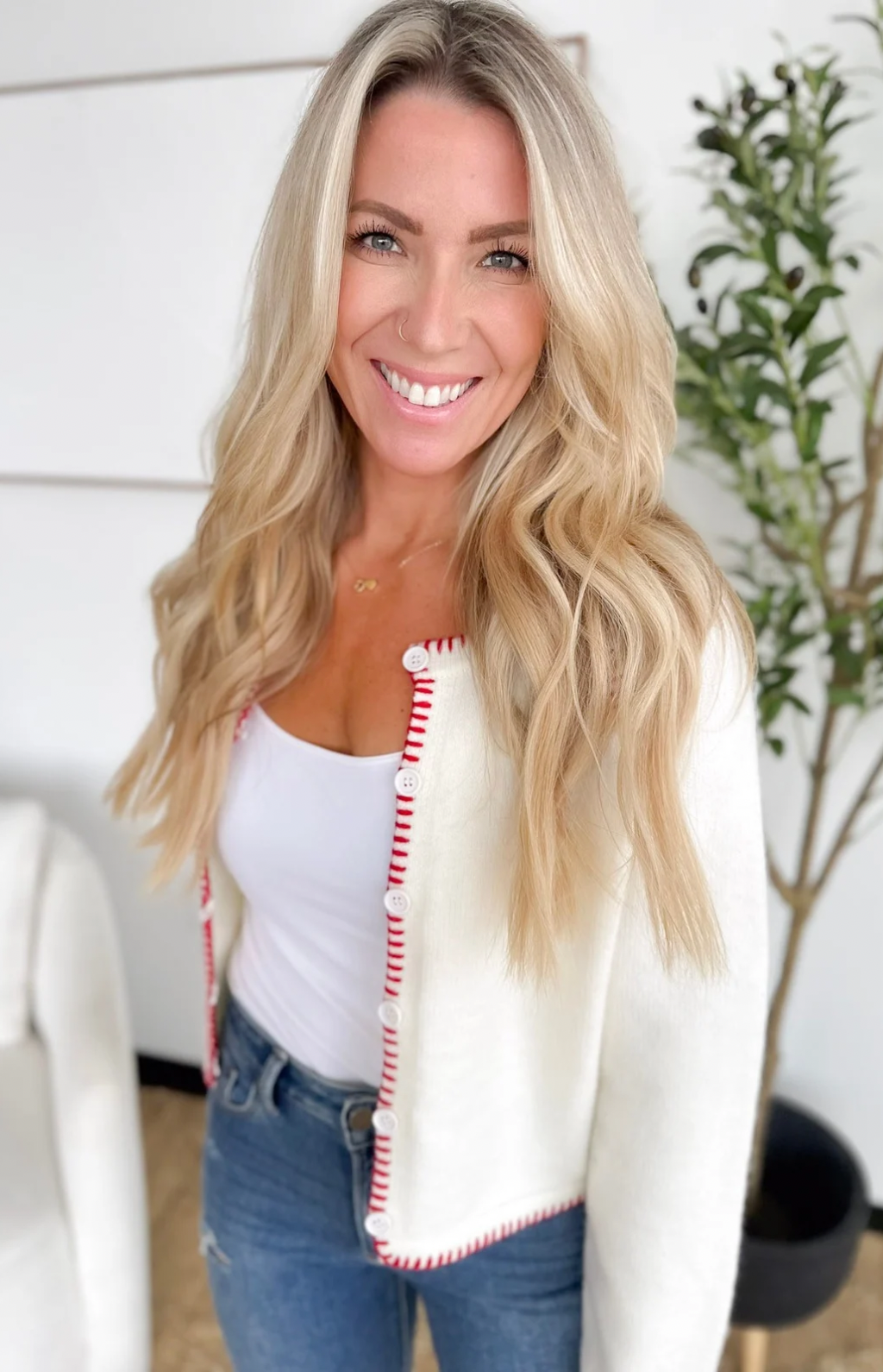 This ivory cardigan is such a sweet little statement piece for those days you want to look polished with zero effort. The button-front closure keeps it classic, while the contrast red trim along the hemlines adds that fun pop of color that makes the whole outfit feel intentional. It’s lightweight, soft, and easy to layer—perfect for busy mornings when you’re running out the door but still want to feel put together. Toss it over a tank, a tee, or your favorite dress and you’ve got an instantly pulled-together look. It’s the cardigan that makes simple outfits feel special in the best way.