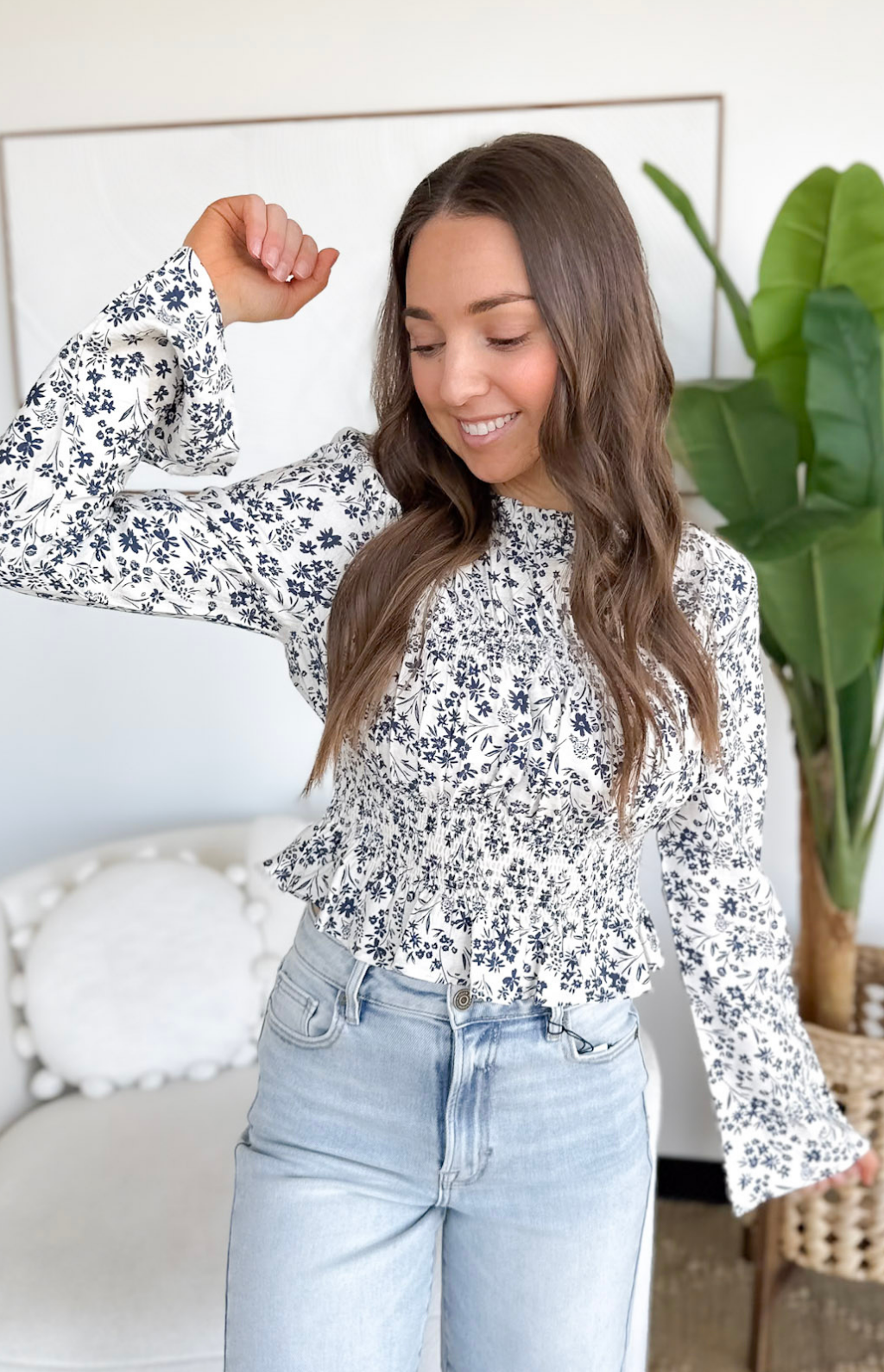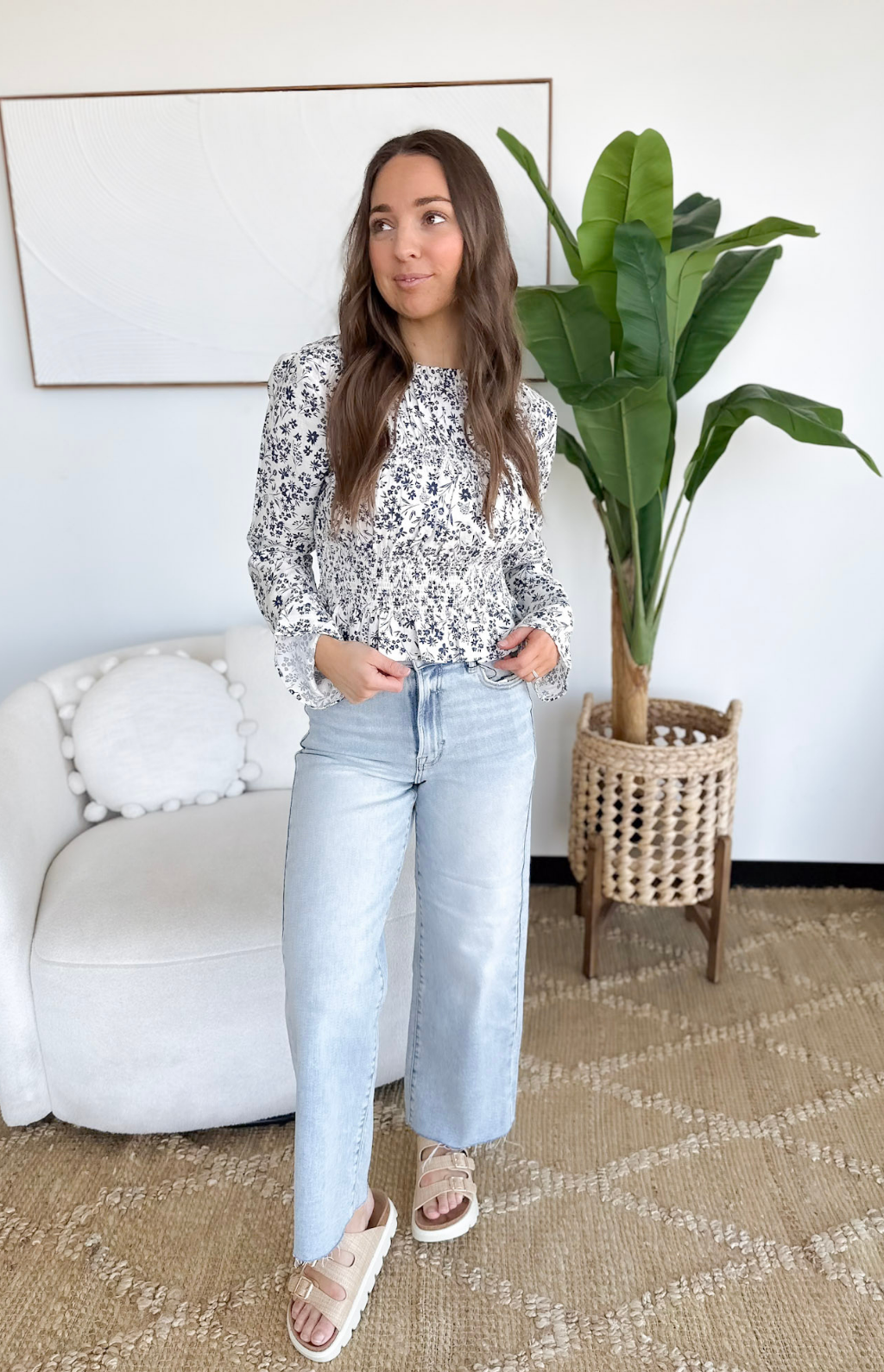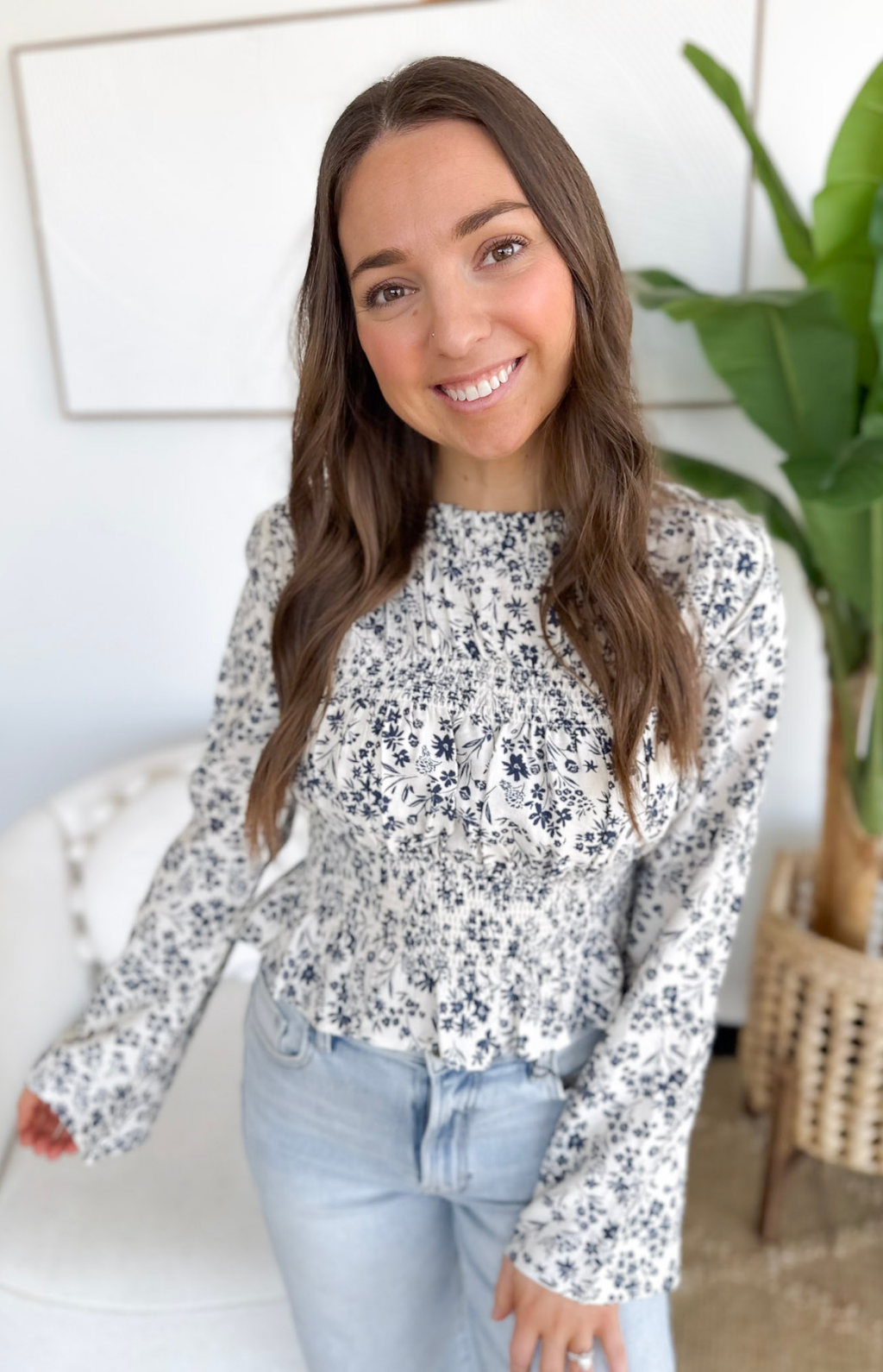 This long sleeve ivory top with a blue floral pattern is one of those pieces that instantly makes you feel put together. The smocked body gives you a flattering, comfortable fit that moves with you all day. Wide sleeves add a touch of drama while still feeling easy and wearable.