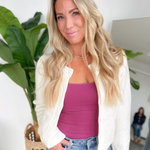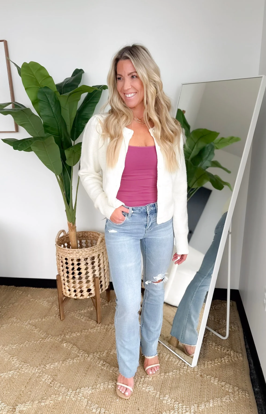 This ivory button-front cardigan is a timeless piece with the sweetest feminine touch. Soft and cozy, it features subtle puff gathers at the shoulders that add just the right amount of shape and charm. The classic button-up design makes it easy to wear open or closed, giving you plenty of styling options.