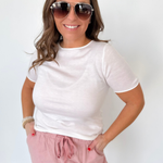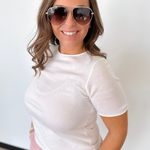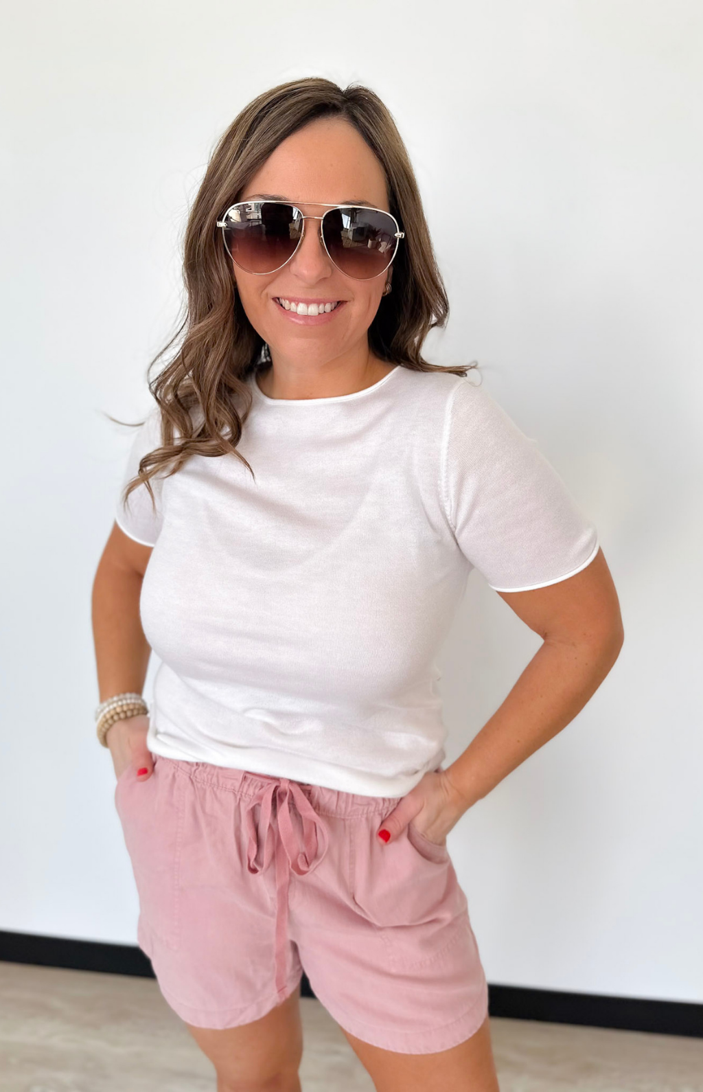 This ivory round neck knit tee is a timeless staple you’ll wear on repeat. The soft knit fabric feels comfortable and breathable for all-day wear. A classic round neckline keeps the look clean, flattering, and easy to style. The ivory color pairs effortlessly with denim, skirts, or layered under jackets and cardigans. It’s perfect for busy days when you want to look polished without trying too hard.