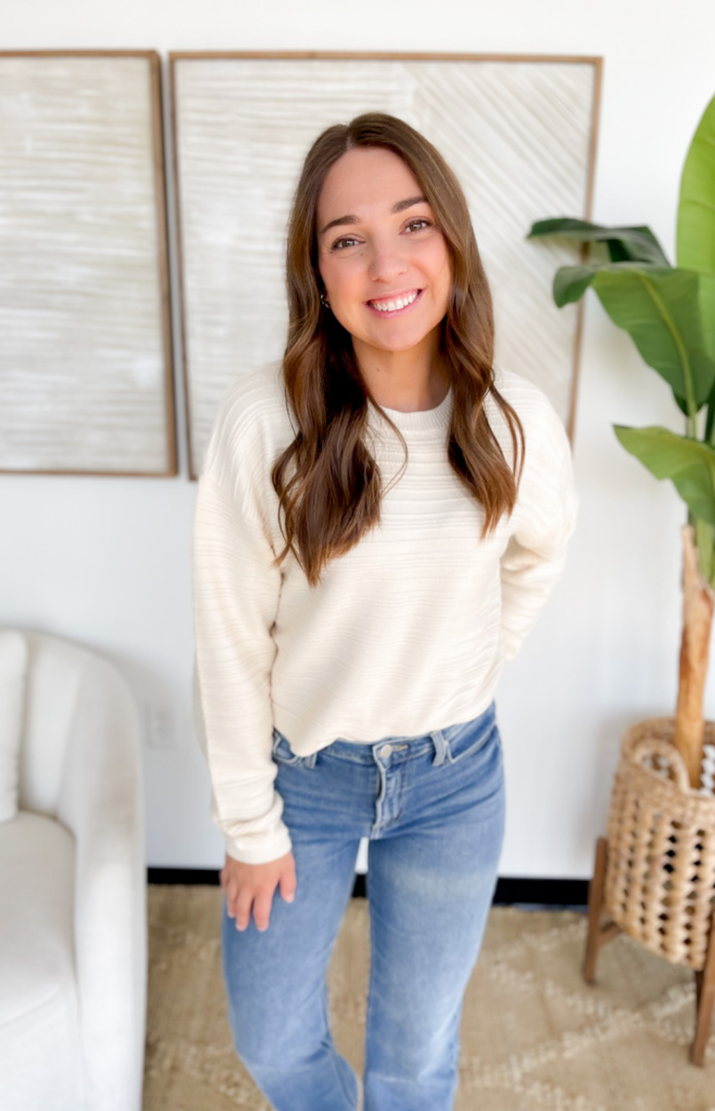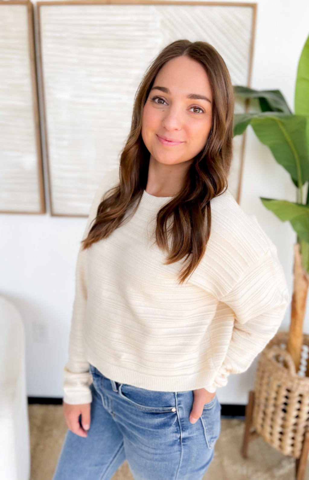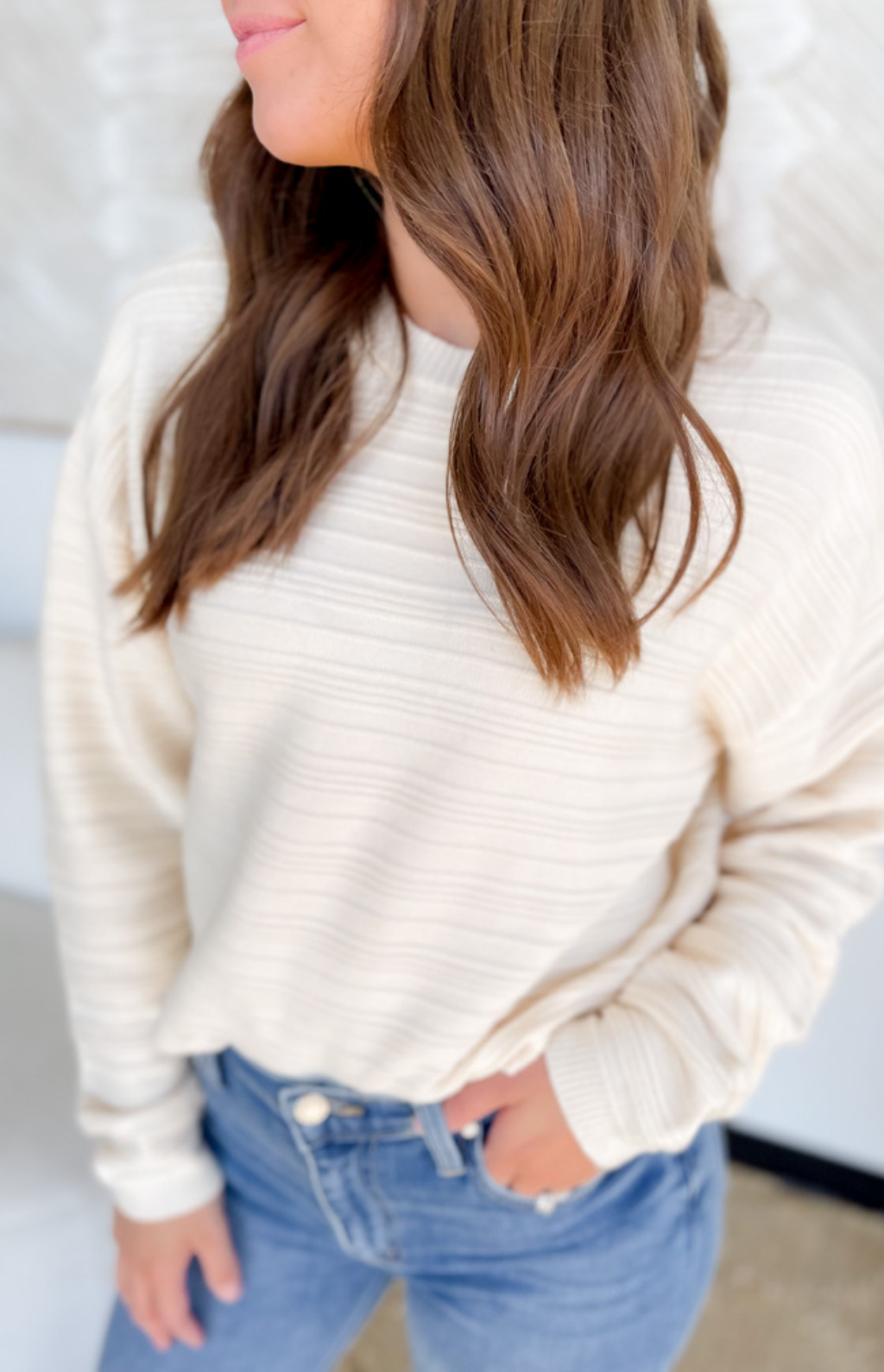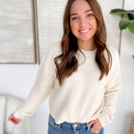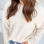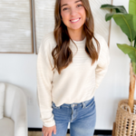 This ivory knit sweater is the perfect blend of cozy and modern style. Designed with textured striped detailing, it brings a subtle touch of dimension that makes it stand out from your everyday basics. The cropped, boxy fit adds a fresh and flattering silhouette that pairs easily with high-waisted jeans, skirts, or trousers. A versatile piece you’ll reach for all season long.