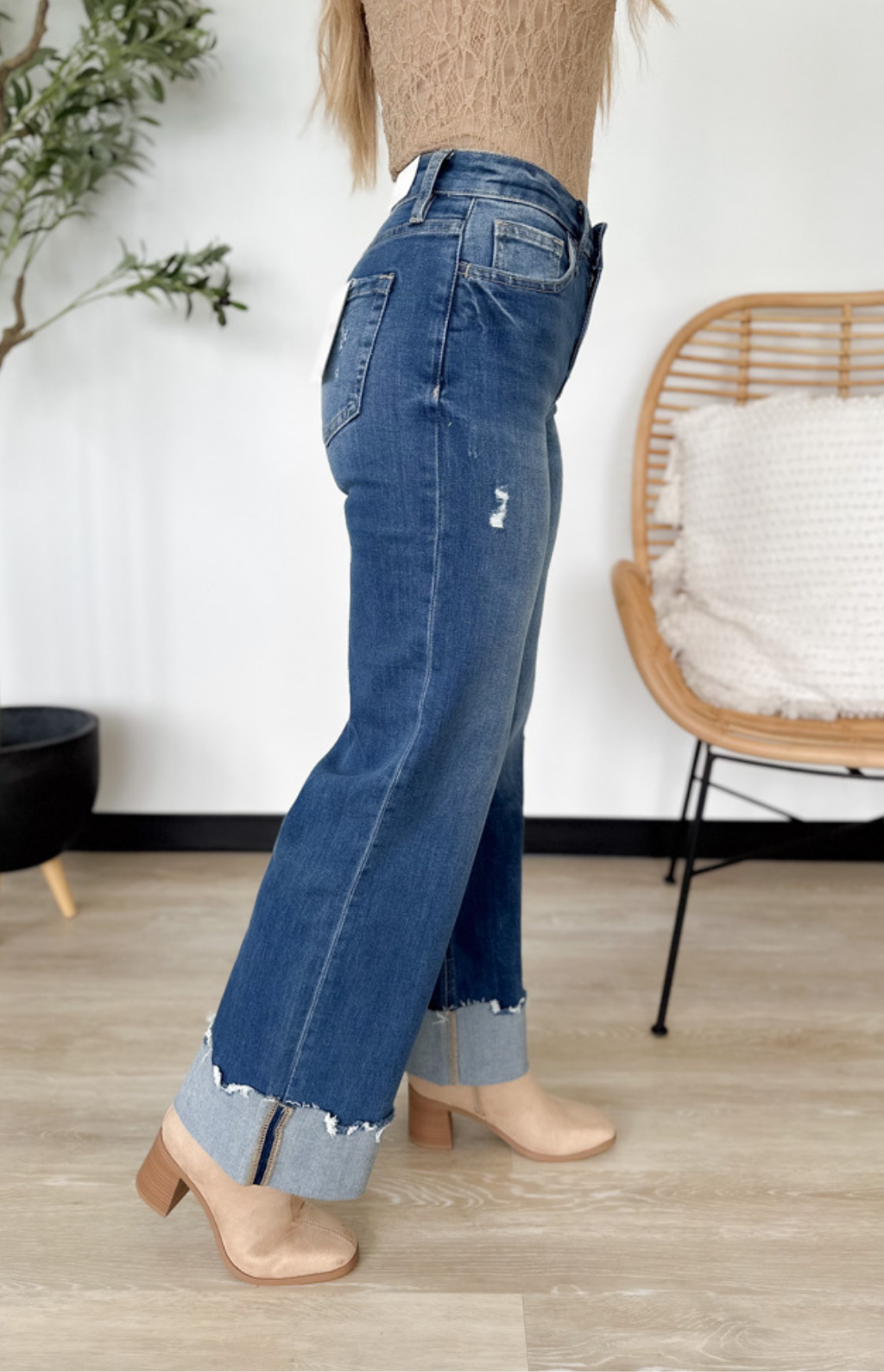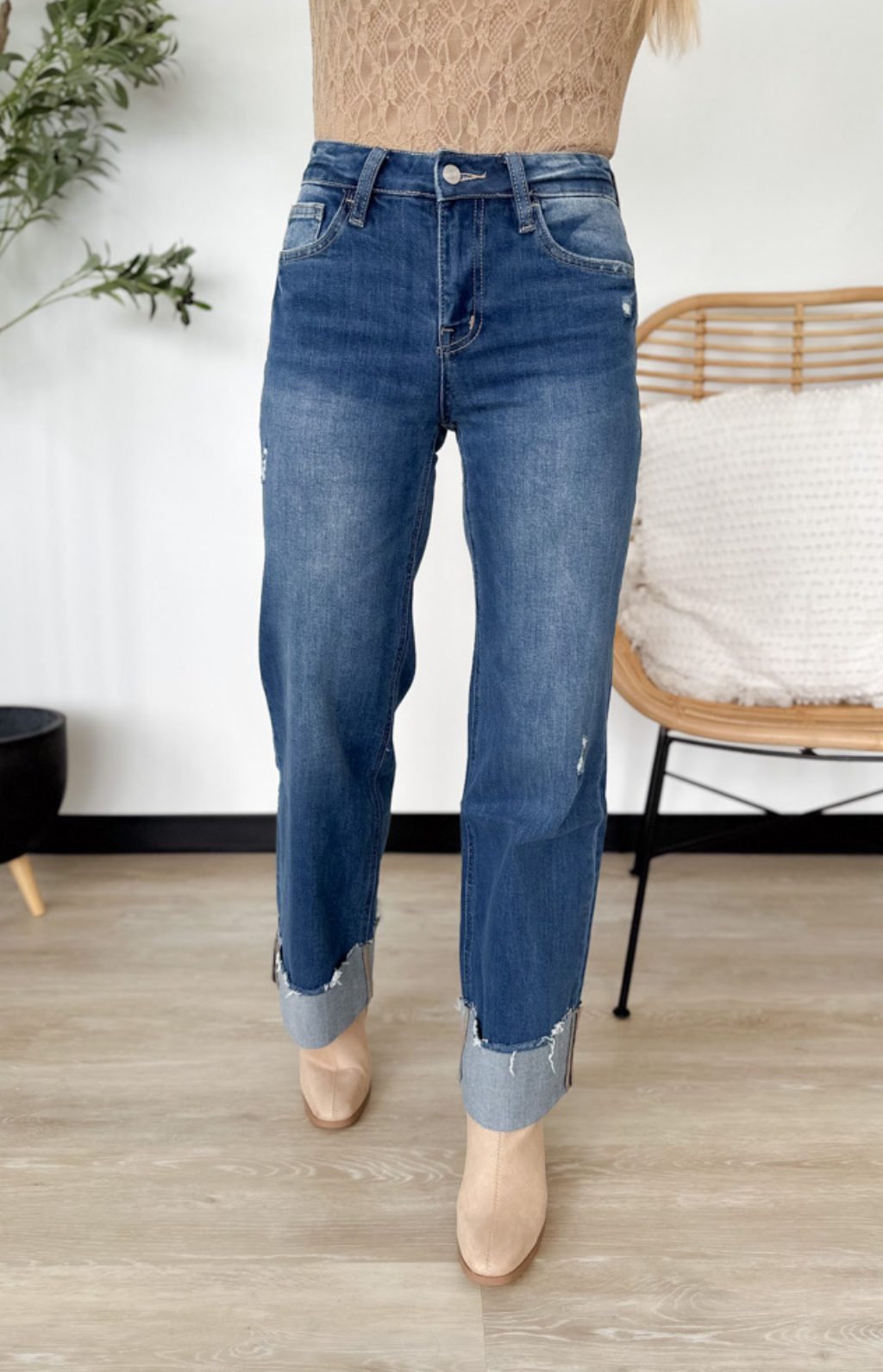 These high-rise, medium wash jeans are the perfect mix of relaxed and trendy. The baggy leg gives them that effortless, laid-back vibe, while the wide cuff detail adds a touch of modern style. Designed to flatter at the waist and flow comfortably through the leg, they’re easy to dress up or down. Pair them with a fitted tee, a cozy sweater, or a tucked-in blouse for a balanced, on-trend look. Comfortable, versatile, and full of personality—these jeans are your new everyday favorite.