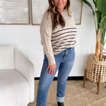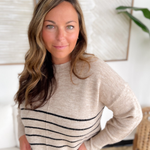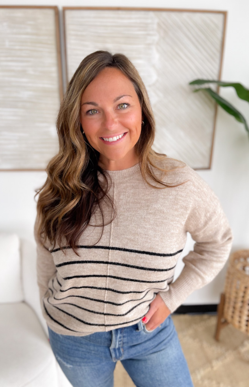 This khaki knit sweater with thin black stripes is the perfect mix of casual and polished. The soft knit fabric feels cozy and comfortable, while the subtle stripes add just the right touch of interest. Its relaxed yet flattering fit makes it easy to layer or wear on its own, keeping you effortlessly put-together from errands to coffee dates. Neutral enough to pair with jeans or trousers, it’s a versatile piece that will quickly become a wardrobe favorite. Simple, chic, and ready for your go-to outfits.