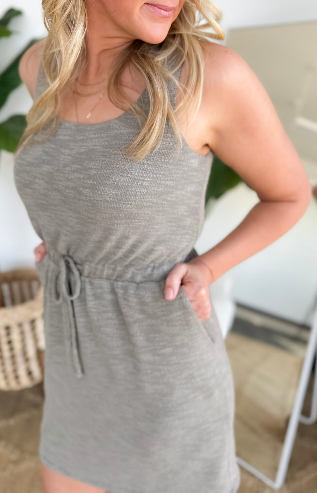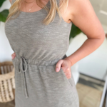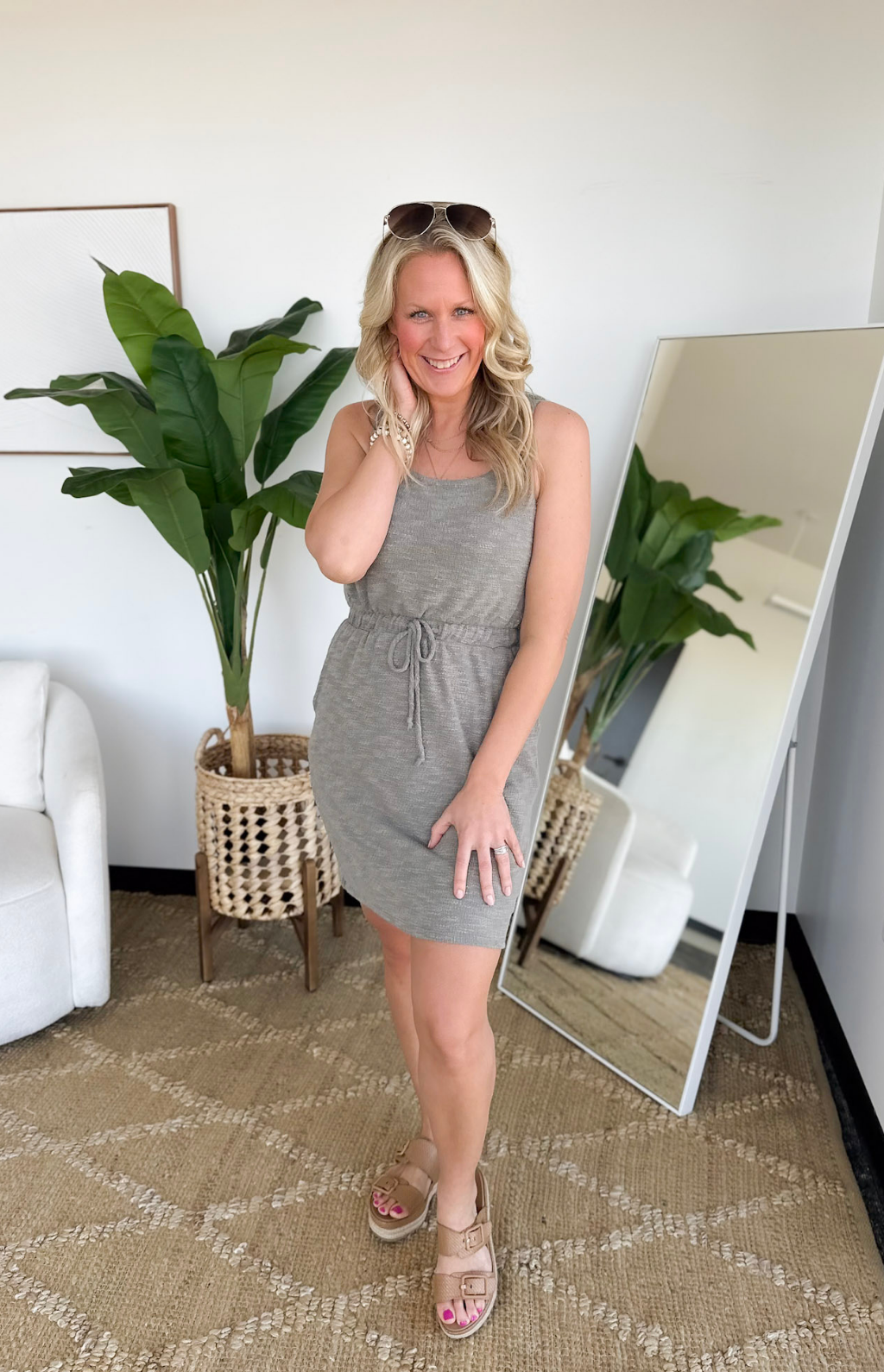 This khaki knit mini dress is the kind of easy outfit you’ll reach for on repeat. Designed with a tank-style silhouette and a flattering scoop neckline, it keeps things simple and feminine. The elastic waistband gives you a comfy, flattering shape, while the soft knit fabric moves with you through your day.