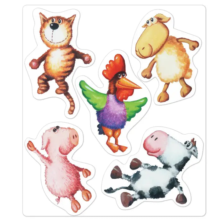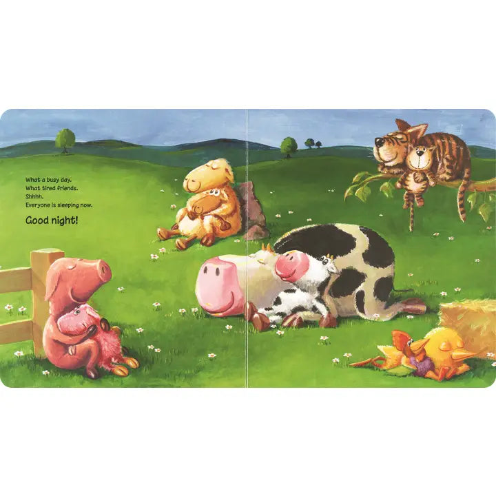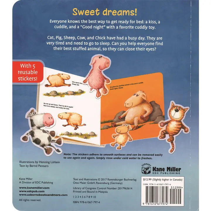 Cat, Pig, Sheep, Cow, and Chick have been busy playing all day, but now it’s time to go to bed. They need kisses, cuddles… and a very special friend before they can say, “Good Night!” Little readers will love helping their friends pick out the perfect stuffed animal for bedtime using the 5 repositionable, reusable stickers.