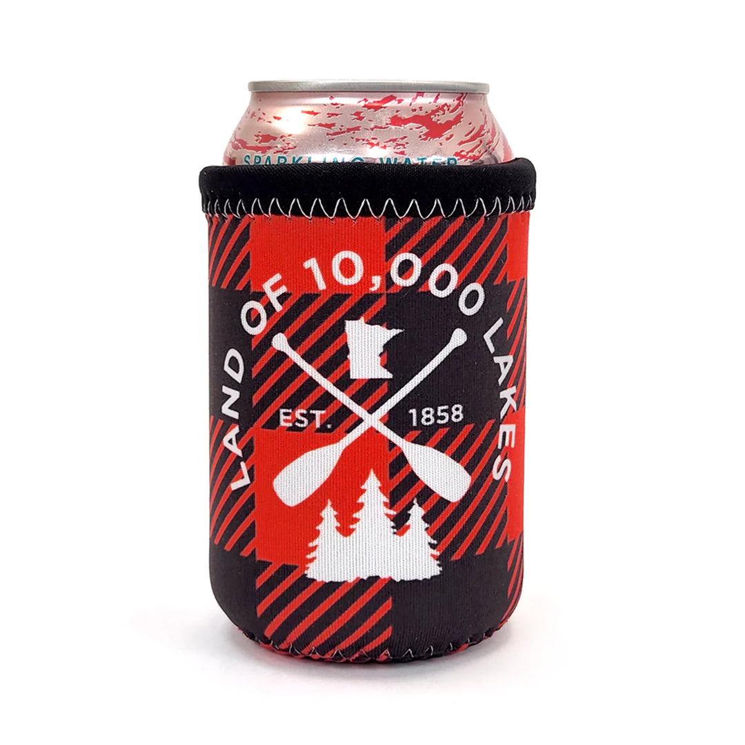 Collapsible buffalo plaid can cooler with Minnesota Land of 10,000 Lakes design. Perfect for keeping your drinks cold and insulated.