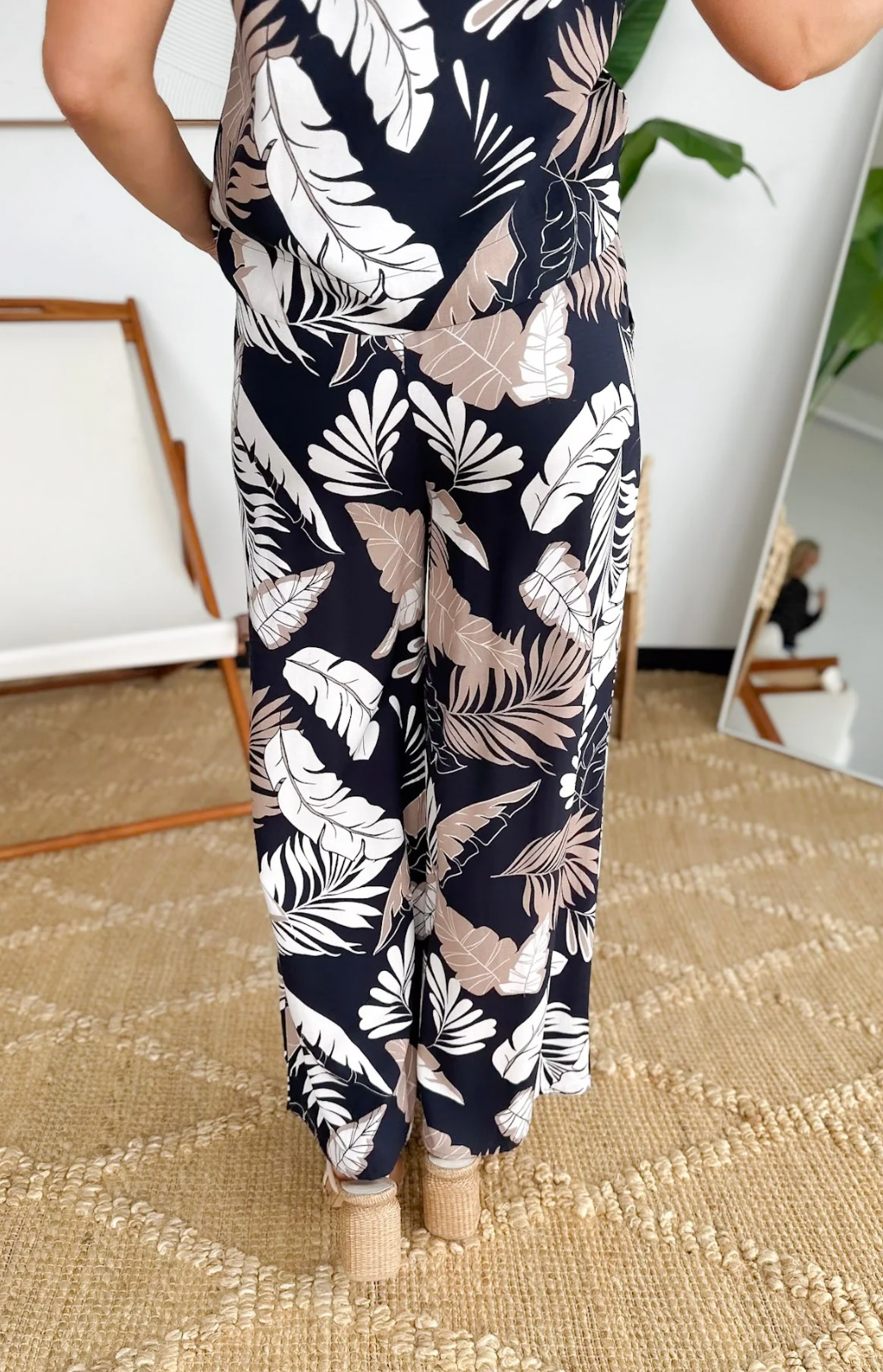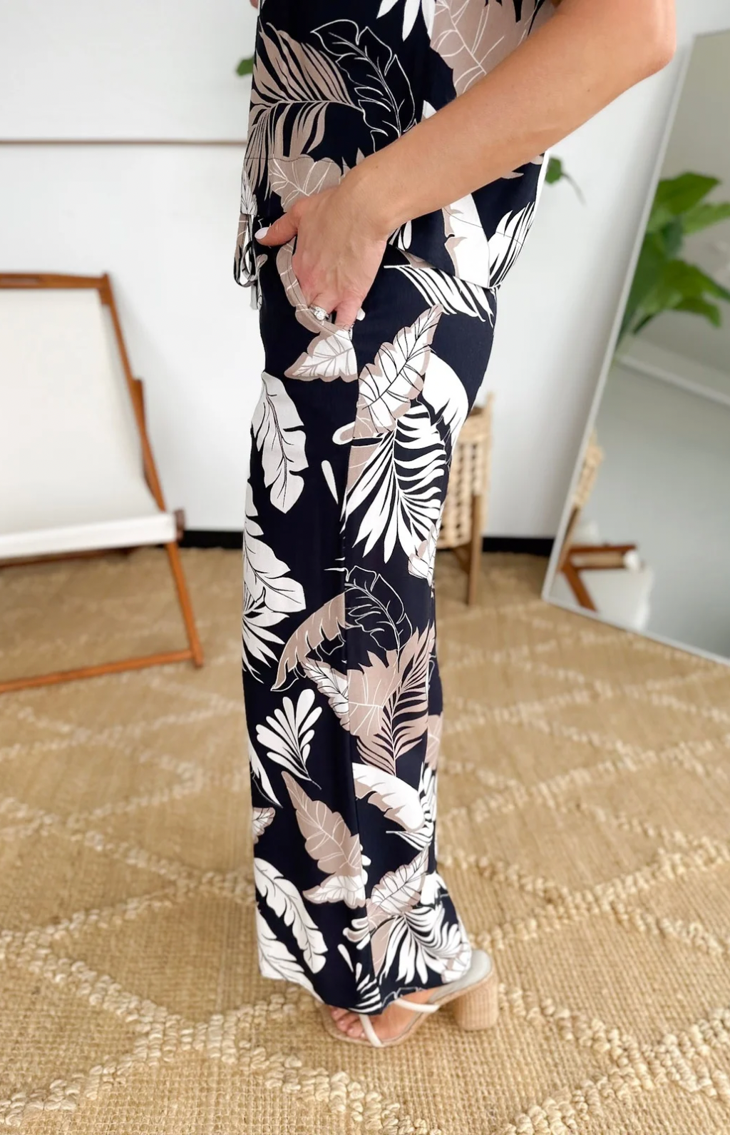 These black wide leg pants with a breezy leaf print are a vacation must-have you’ll want to pack every time. The high-waisted, elastic waistband keeps them comfortable for travel days, sightseeing, and long dinners out, while the flowy wide leg fit feels light and flattering. Easy pockets make them practical when you’re on the go, so you can stay hands-free and relaxed. Lightweight and breathable, they move beautifully with every step. Pair them with a simple tank or the matching top and enjoy effortless vacation style that still feels polished.